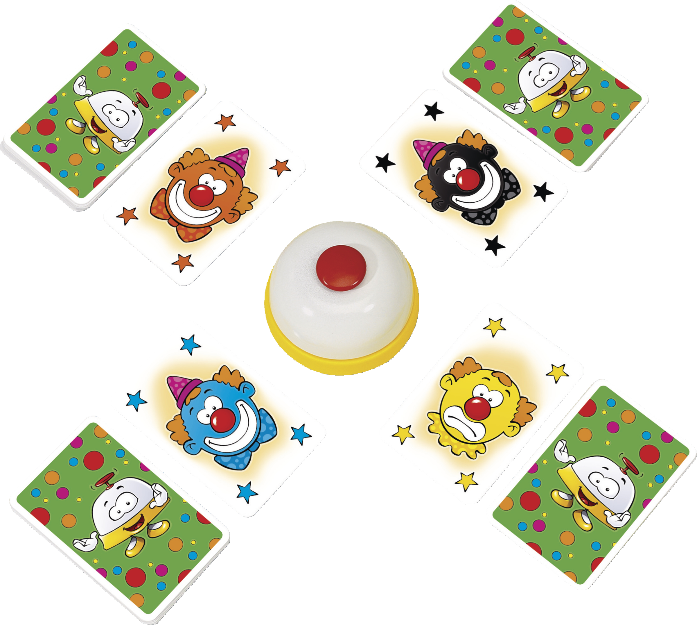 På klokken - klar - gå! Røde, grønne eller blå klovne er på bordet. Når du ser to grinende klovne af samme farve, skal du ringe på klokken hurtigt. Den hurtigste spiller modtager alle afslørede klovne. Hvis klovnene er triste, må du ikke ringe på klokken, eller du skal aflevere kort. Hvis du har flest klovne til sidst, er du vinderen! Fantastisk sjov med Haim Shafirs klokke som en leg!