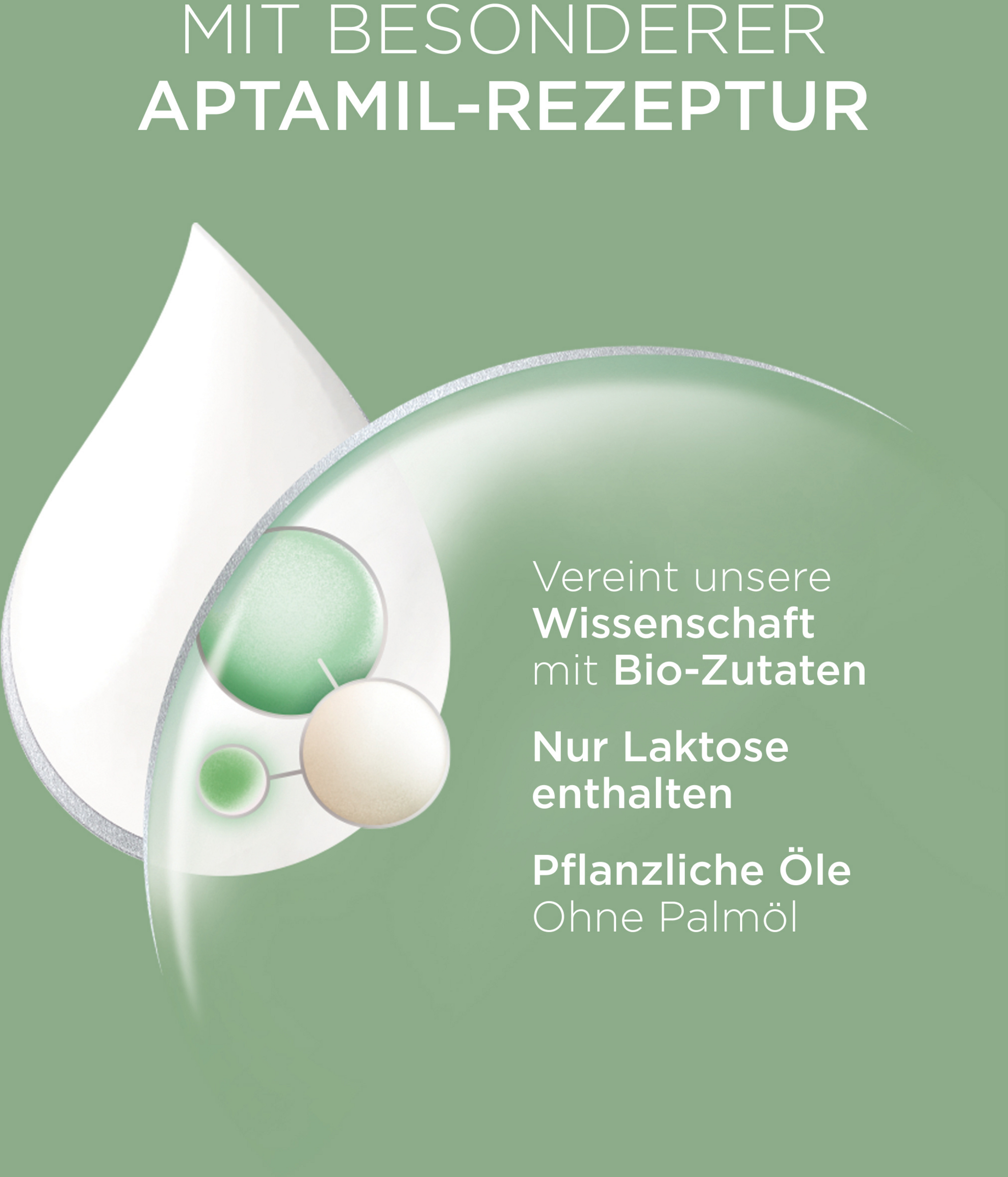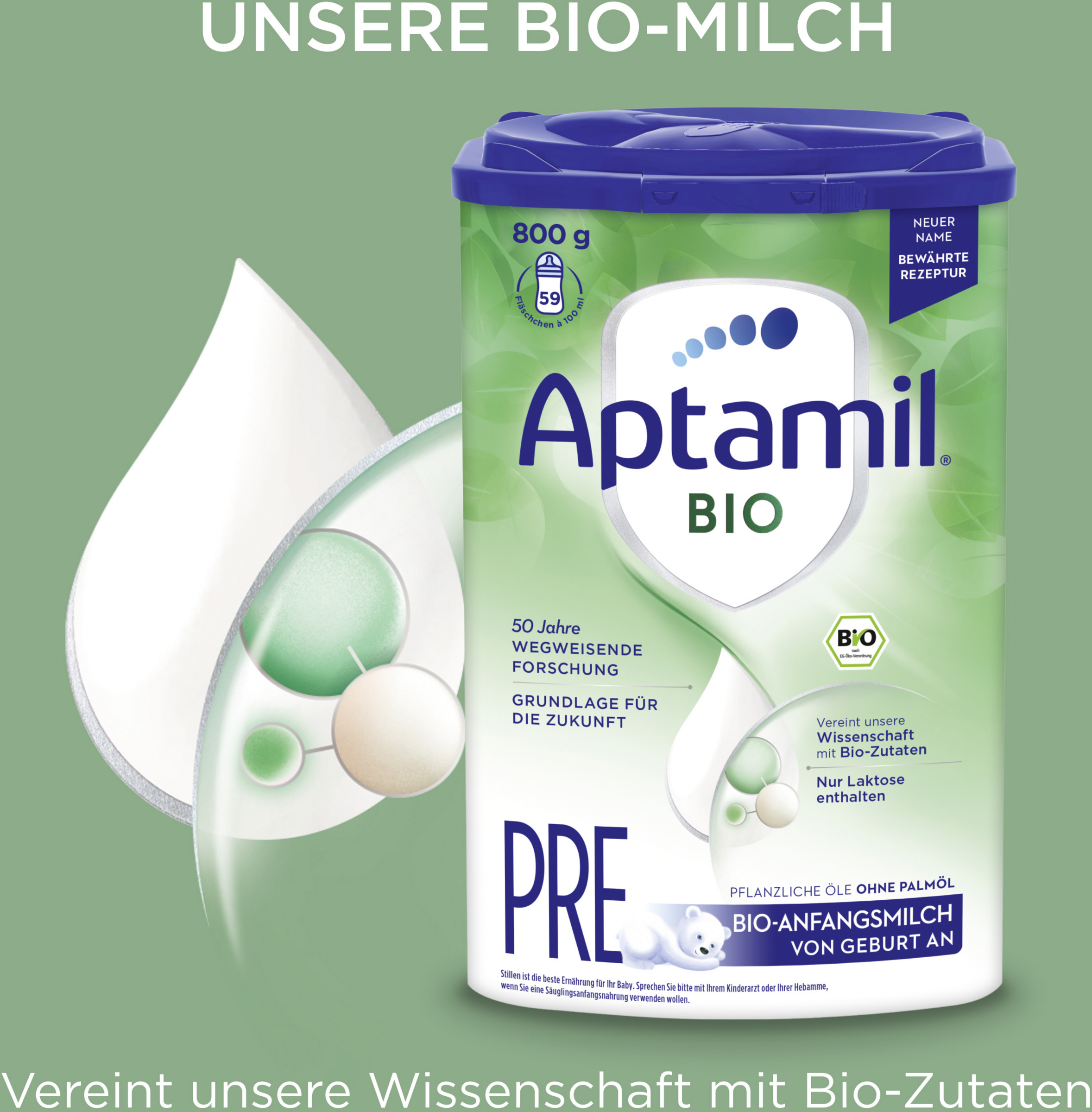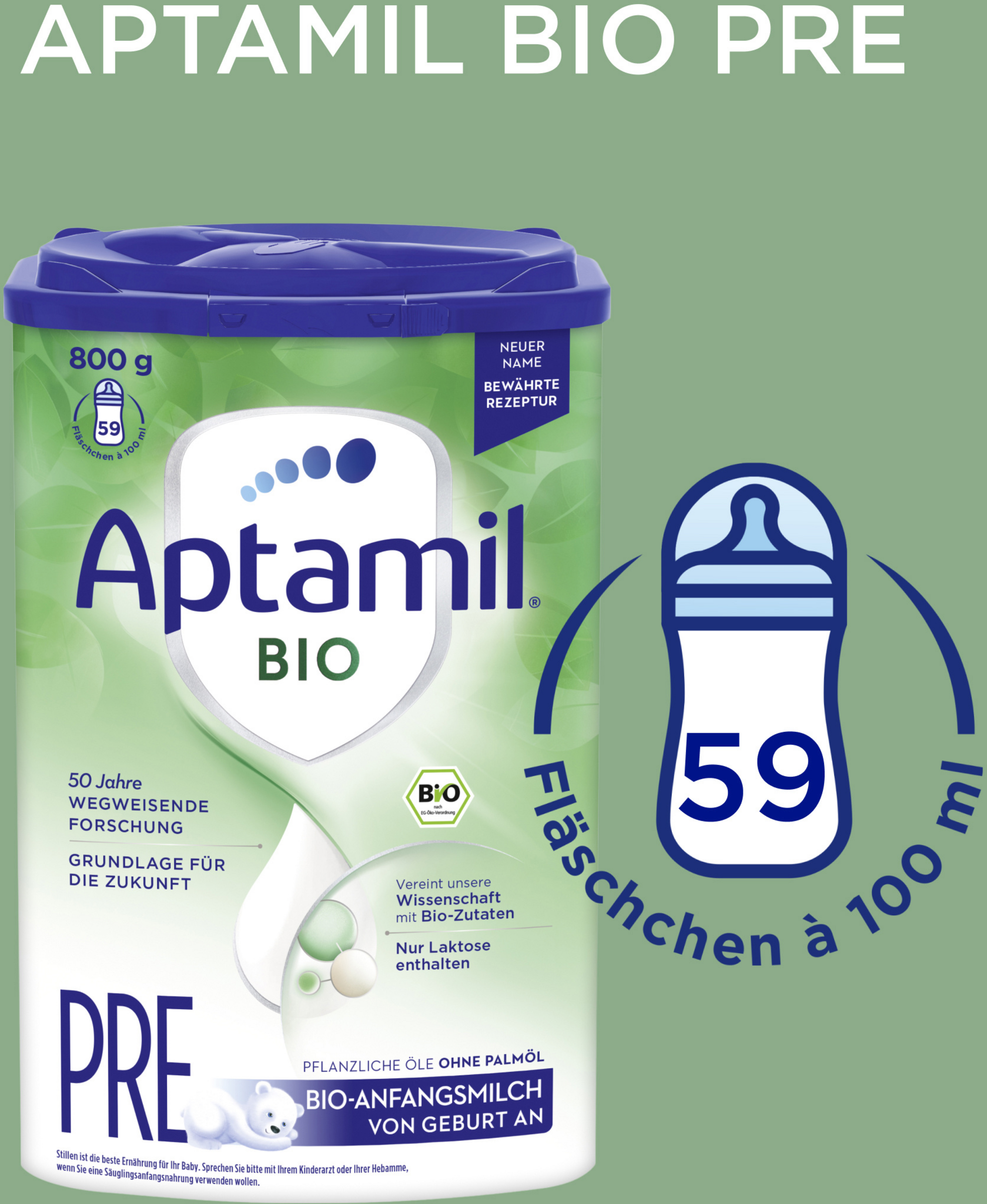 Dine mælkeøjeblikke er lige så individuelle, som du er. Hvordan du ernærer din baby er lige så individuelt som dit liv. Aptamil tilbyder produkter og tjenester af høj kvalitet, der er skræddersyet til dine individuelle behov. Viden baseret på 50 års modermælksforskning er gået ind i de videreudviklede formler af de afprøvede og testede produkter. Aptamil Bio Pre Aptamil Bio kombinerer videnskab og natur på en særlig måde: Udvalgte ingredienser af økologisk oprindelse kombineret med 50 års forskning. Denne modermælkserstatning er specielt tilpasset din babys kost fra fødslen og er også velegnet som tilskud til amning. Aptamil Bio Pre indeholder vegetabilske olier uden palmeolie. Ingredienserne bevares takket være de høje kvalitetsstandarder.