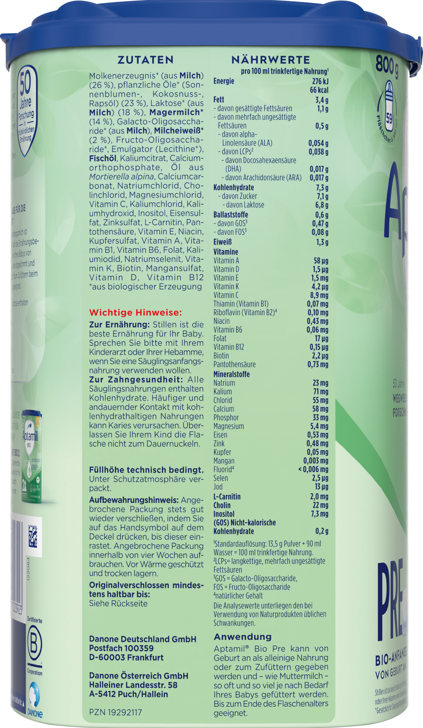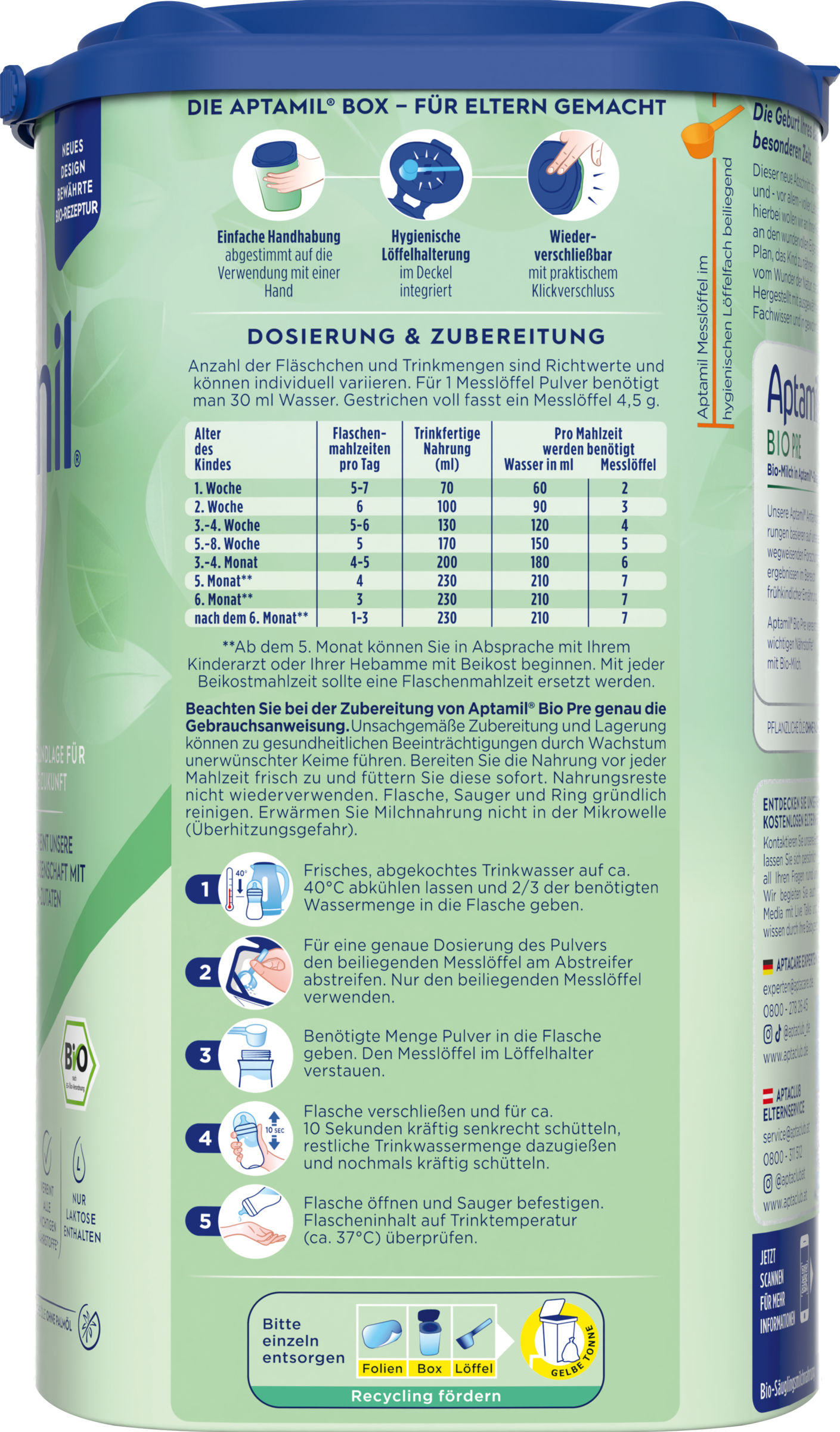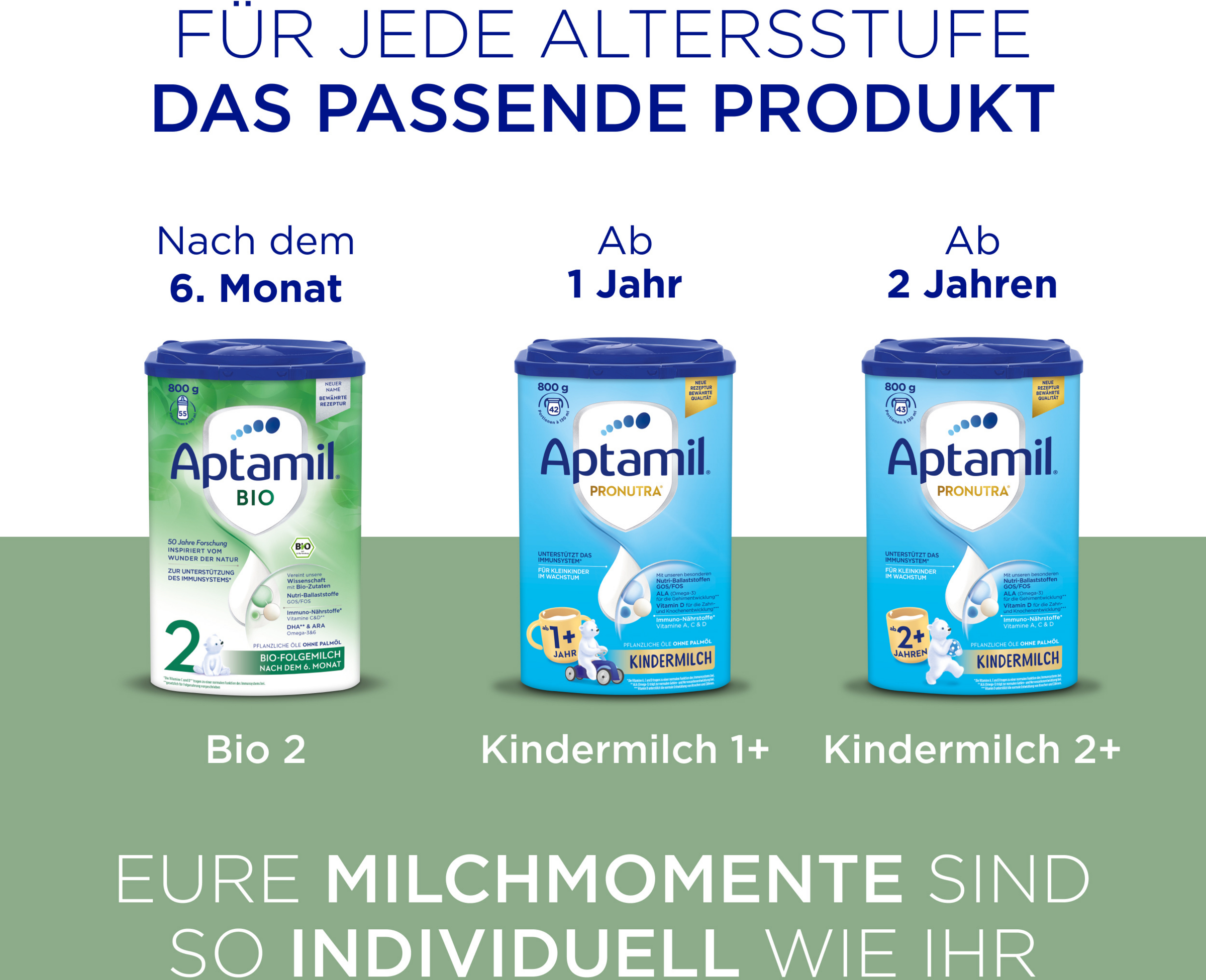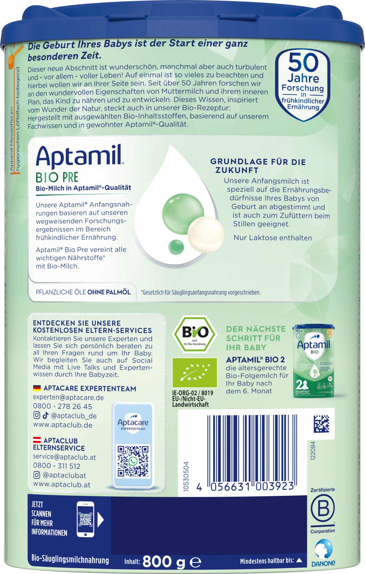 Dine mælkeøjeblikke er lige så individuelle, som du er. Hvordan du ernærer din baby er lige så individuelt som dit liv. Aptamil tilbyder produkter og tjenester af høj kvalitet, der er skræddersyet til dine individuelle behov. Viden baseret på 50 års modermælksforskning er gået ind i de videreudviklede formler af de afprøvede og testede produkter. Aptamil Bio Pre Aptamil Bio kombinerer videnskab og natur på en særlig måde: Udvalgte ingredienser af økologisk oprindelse kombineret med 50 års forskning. Denne modermælkserstatning er specielt tilpasset din babys kost fra fødslen og er også velegnet som tilskud til amning. Aptamil Bio Pre indeholder vegetabilske olier uden palmeolie. Ingredienserne bevares takket være de høje kvalitetsstandarder.