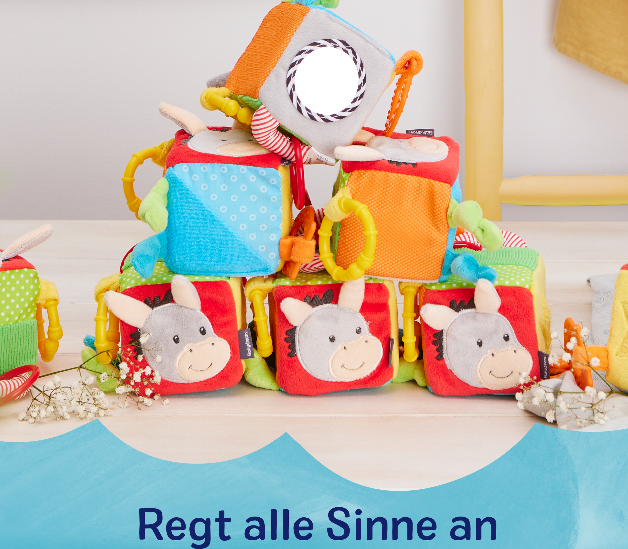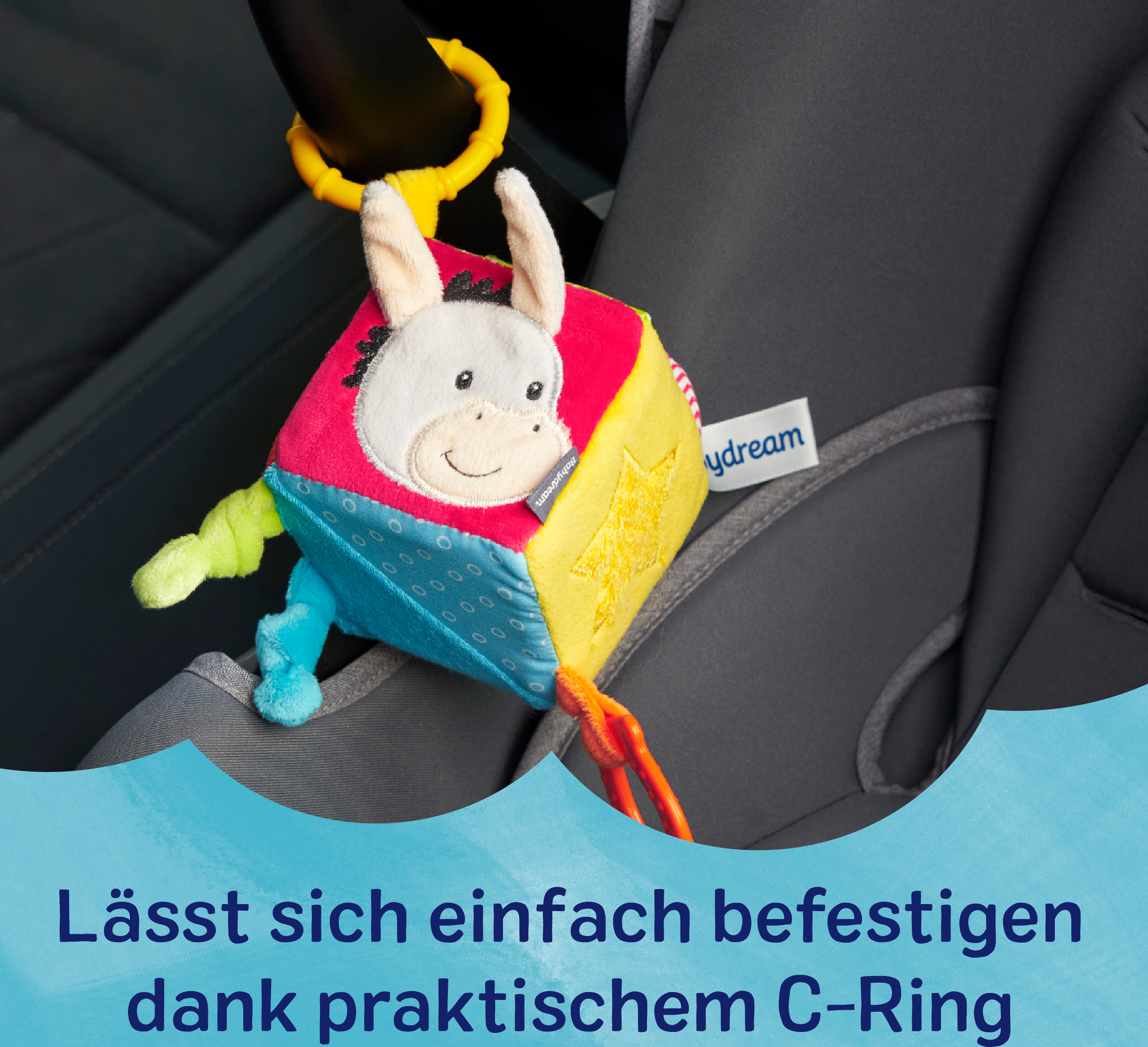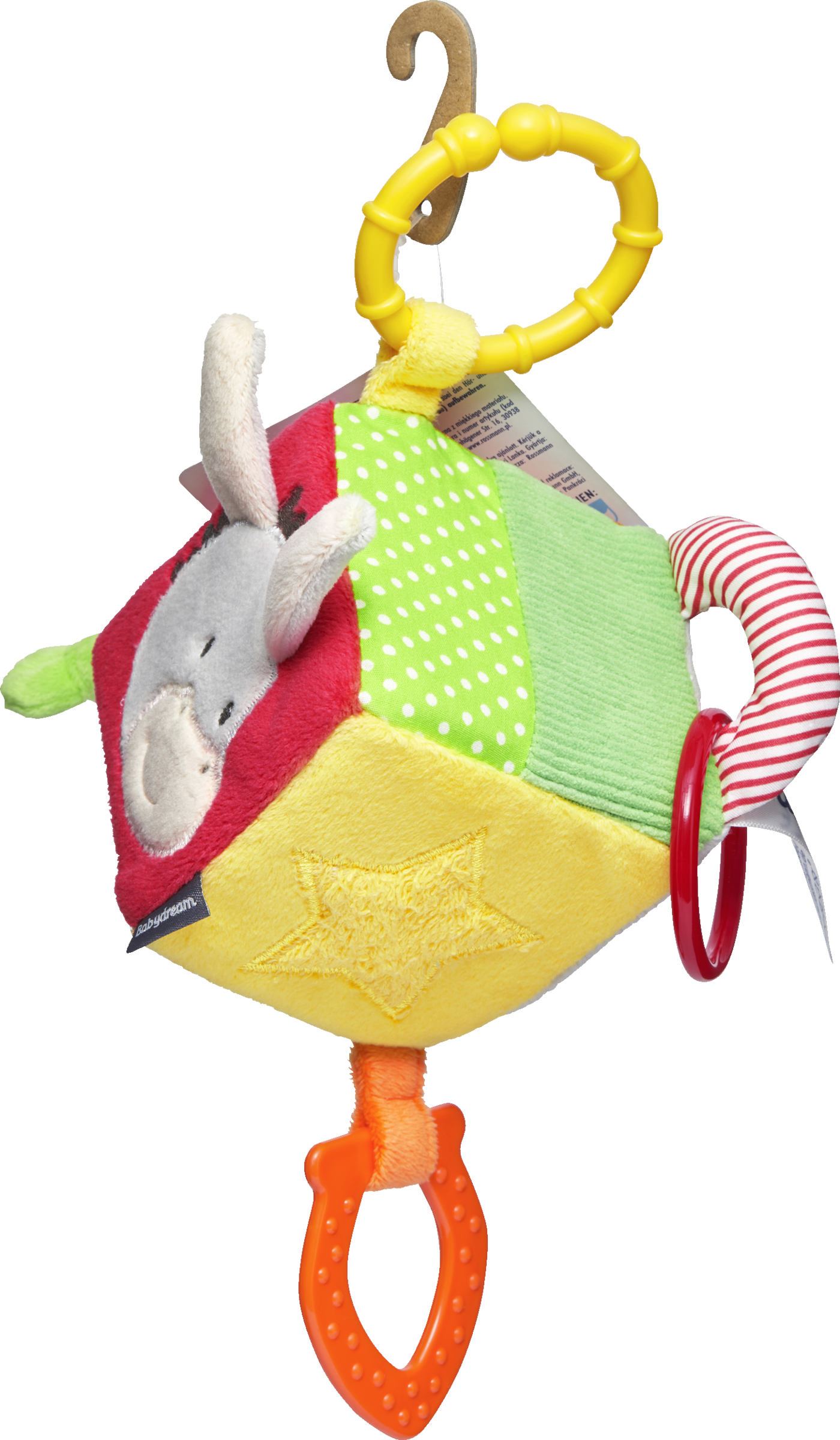 Vores farverige Babydream aktivitetsterning er hurtig og nem at sætte på takket være den praktiske C-ring. Terningens seks sider giver varieret sjov og stimulerer barnets lytte- og følesans. Terningen er farvefast og testet for skadelige stoffer.