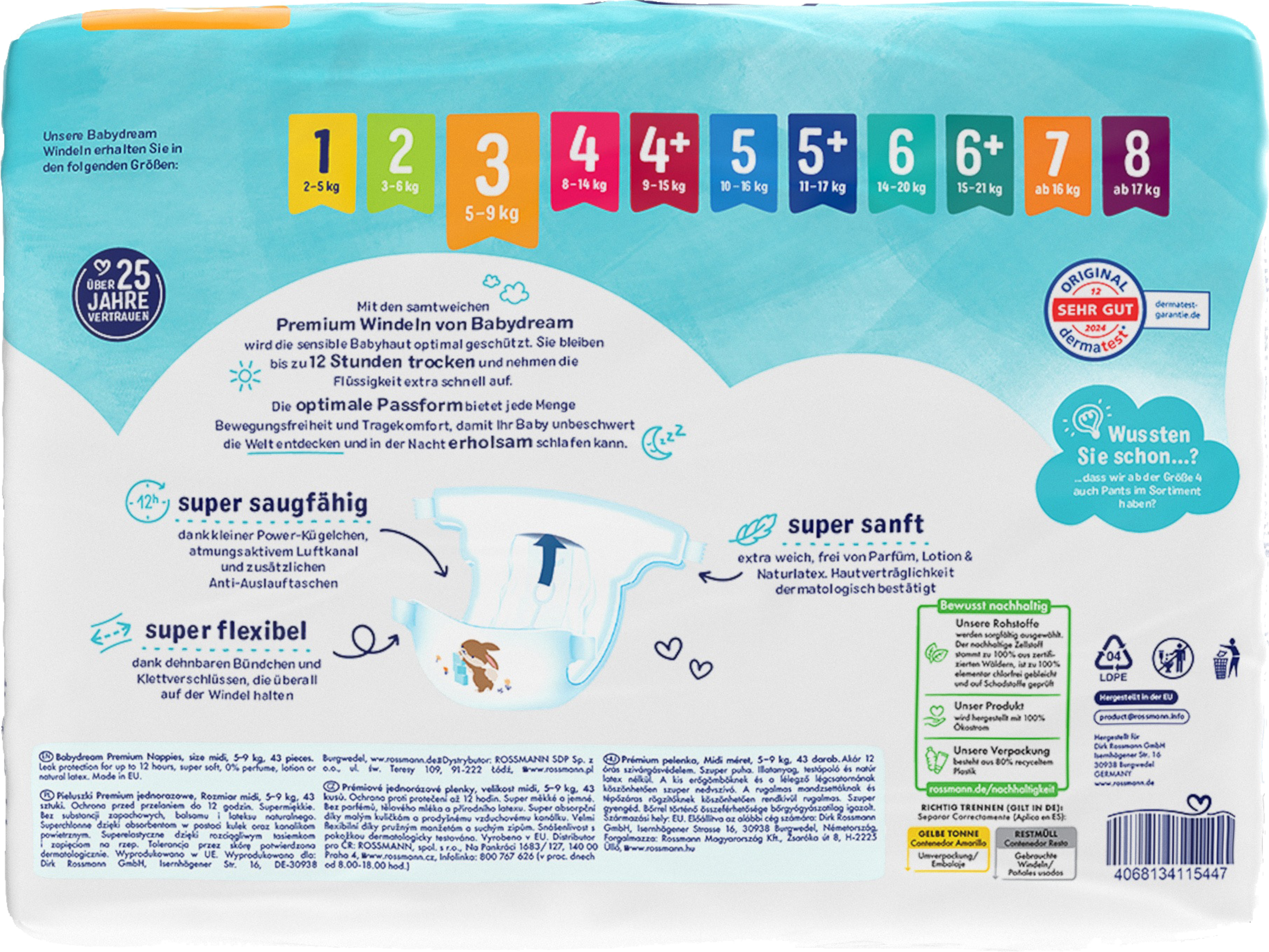 De fløjlsbløde premiumbleer fra Babydream giver optimal beskyttelse af din babys følsomme hud. De holder sig tørre i op til 12 timer og absorberer væske ekstra hurtigt. Den perfekte pasform giver masser af bevægelsesfrihed og komfort, så din baby kan opdage verden ubekymret og sove roligt om natten, Superabsorberende - takket være små powerperler og åndbar luftkanal, Super fleksibel - takket være strækbare manchetter og velcrolukning, Superblød - ekstra blød, fri for parfume, lotion og naturlig latex. Hudkompatibilitet dermatologisk bekræftet, Vidste du, at vi også har bukser i vores sortiment fra størrelse 4?