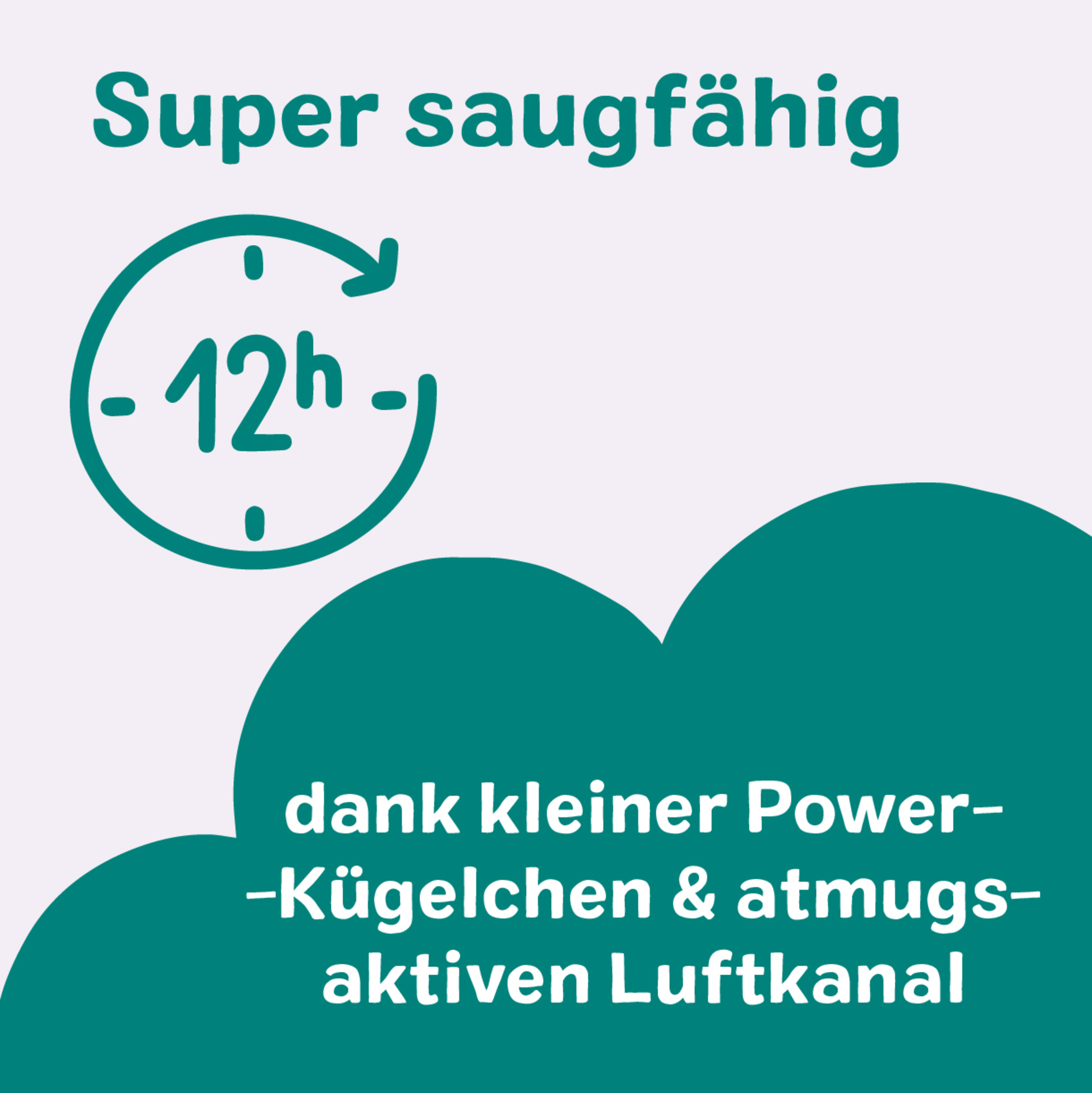 Det absorberende fleeceindlæg leder væske ind i indersiden af bleen. Der omdannes den til gel af mange små power-kugler og dermed lukket sikkert inde. En luftkanal sikrer, at luften kan cirkulere i buksebleen. Din babys numse forbliver tør op til 12 timer. - også om natten.