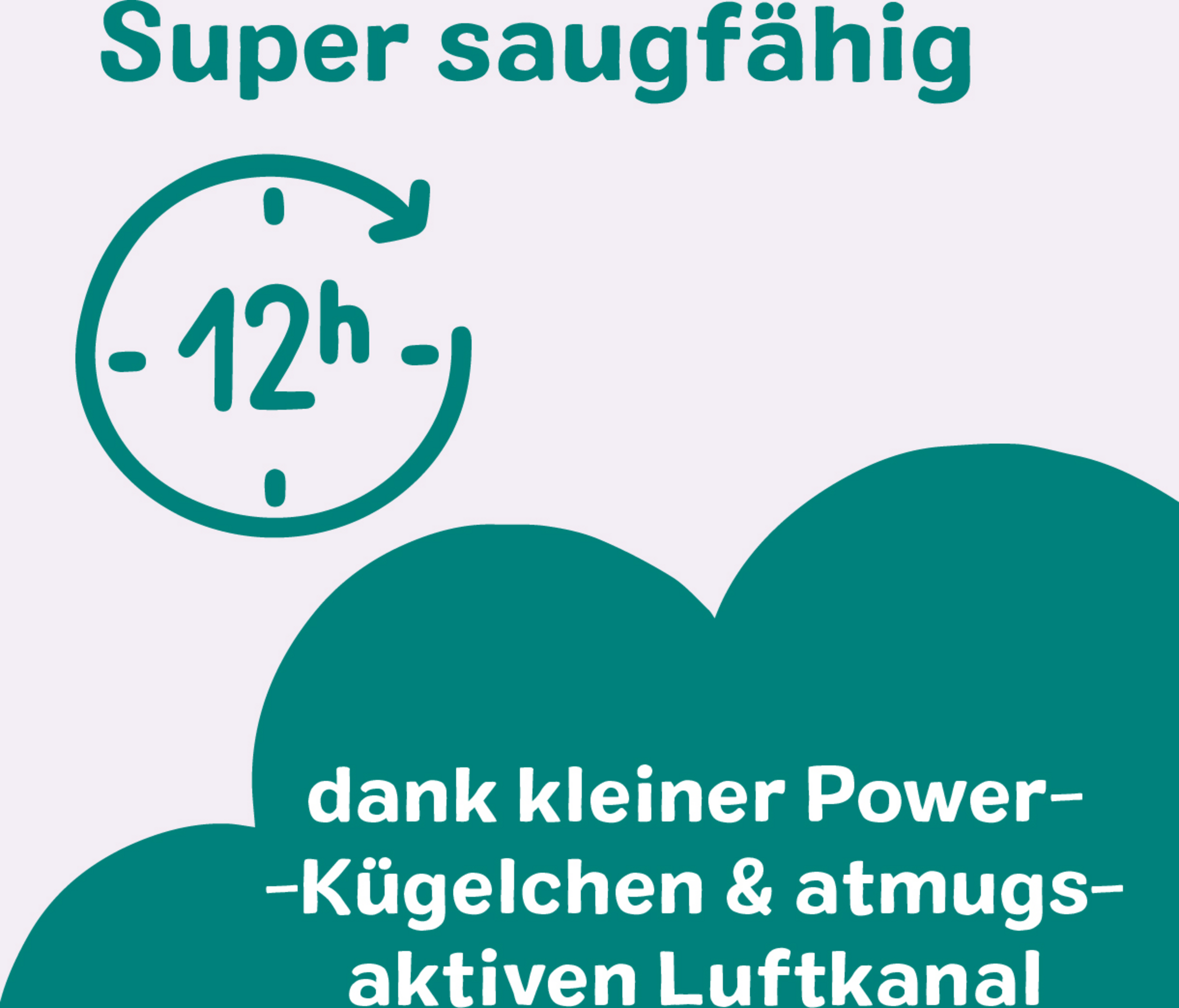 Det absorberende fleeceindlæg leder væske ind i indersiden af bleen. Der omdannes den til gel af mange små power-kugler og dermed lukket sikkert inde. En luftkanal sikrer, at luften kan cirkulere i buksebleen. Din babys numse forbliver tør op til 12 timer. - også om natten.