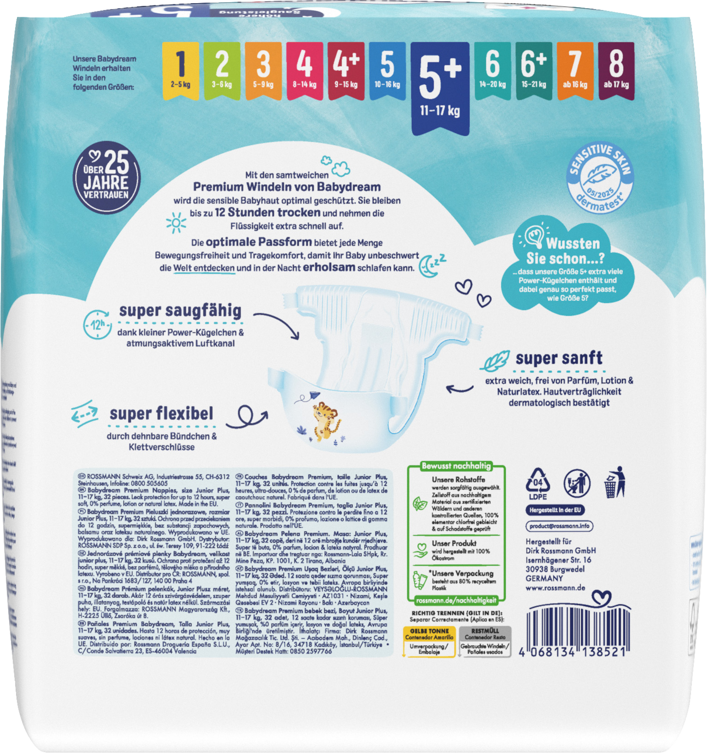 De fløjlsbløde premiumbleer fra Babydream giver optimal beskyttelse af følsom babyhud. De holder sig tørre i op til 12 timer og absorberer væske ekstra hurtigt. Den perfekte pasform giver masser af bevægelsesfrihed og komfort, så din baby kan udforske verden ubekymret og sove trygt om natten.