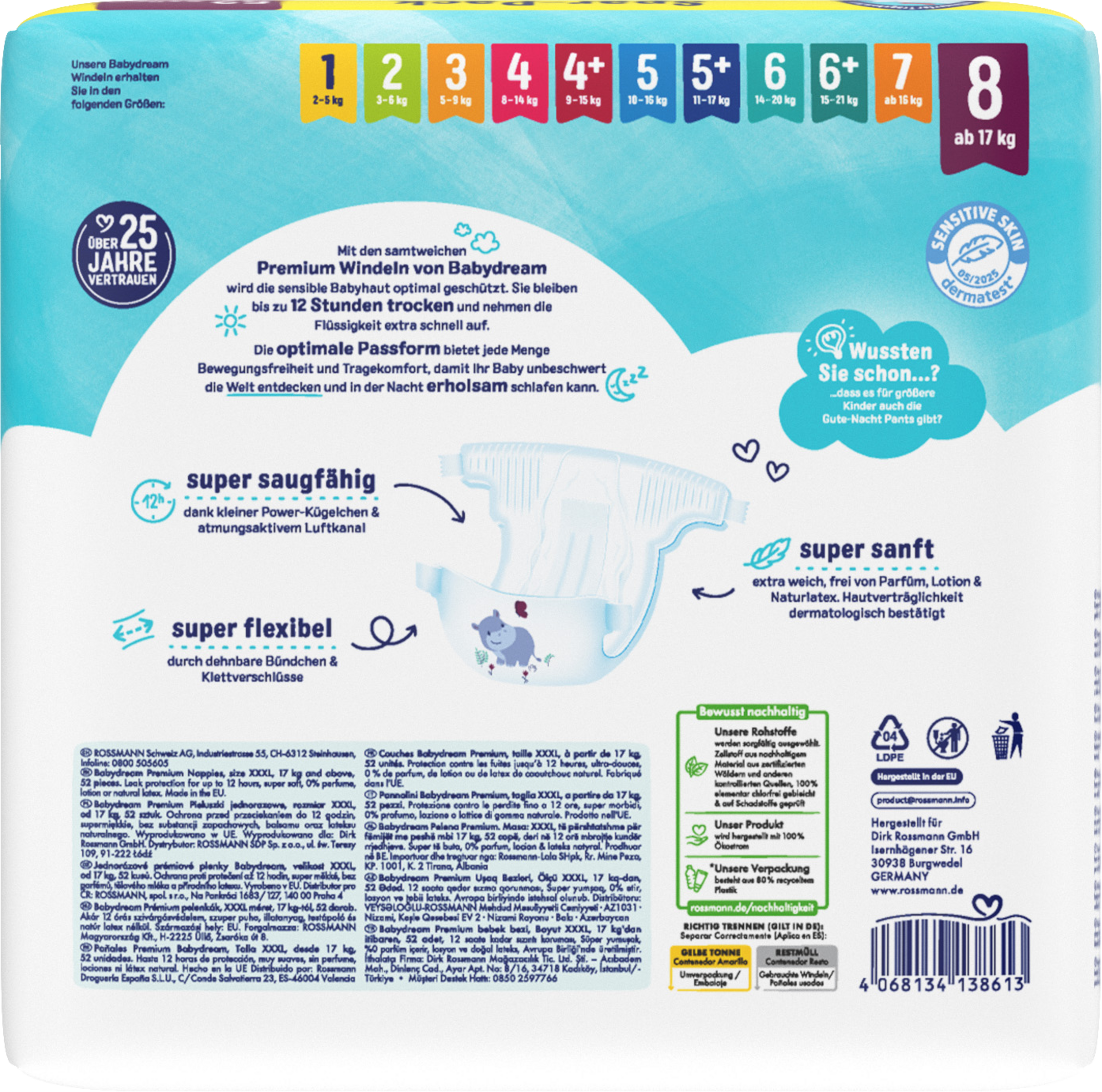 De fløjlsbløde premiumbleer fra Babydream giver optimal beskyttelse af din babys følsomme hud. De holder sig tørre i op til 12 timer og absorberer væske ekstra hurtigt. Den perfekte pasform giver masser af bevægelsesfrihed og komfort, så din baby kan udforske verden ubekymret og sove trygt om natten.