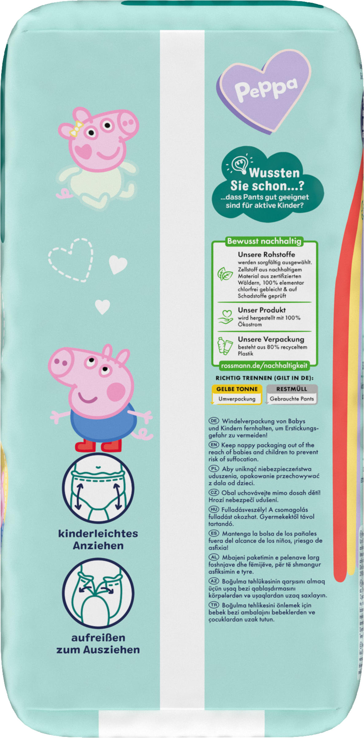 Til hende kan du bare tage PANTS på dit barn som et par trusser - eller de små kan bare prøve det selv. Du kan fjerne disse PANTS ved at rive dem op hurtigt og nemt ved sidesømmene. Så kan du rulle dem sammen, forsegle dem med den praktiske klæbestrimmel og smide dem ud.