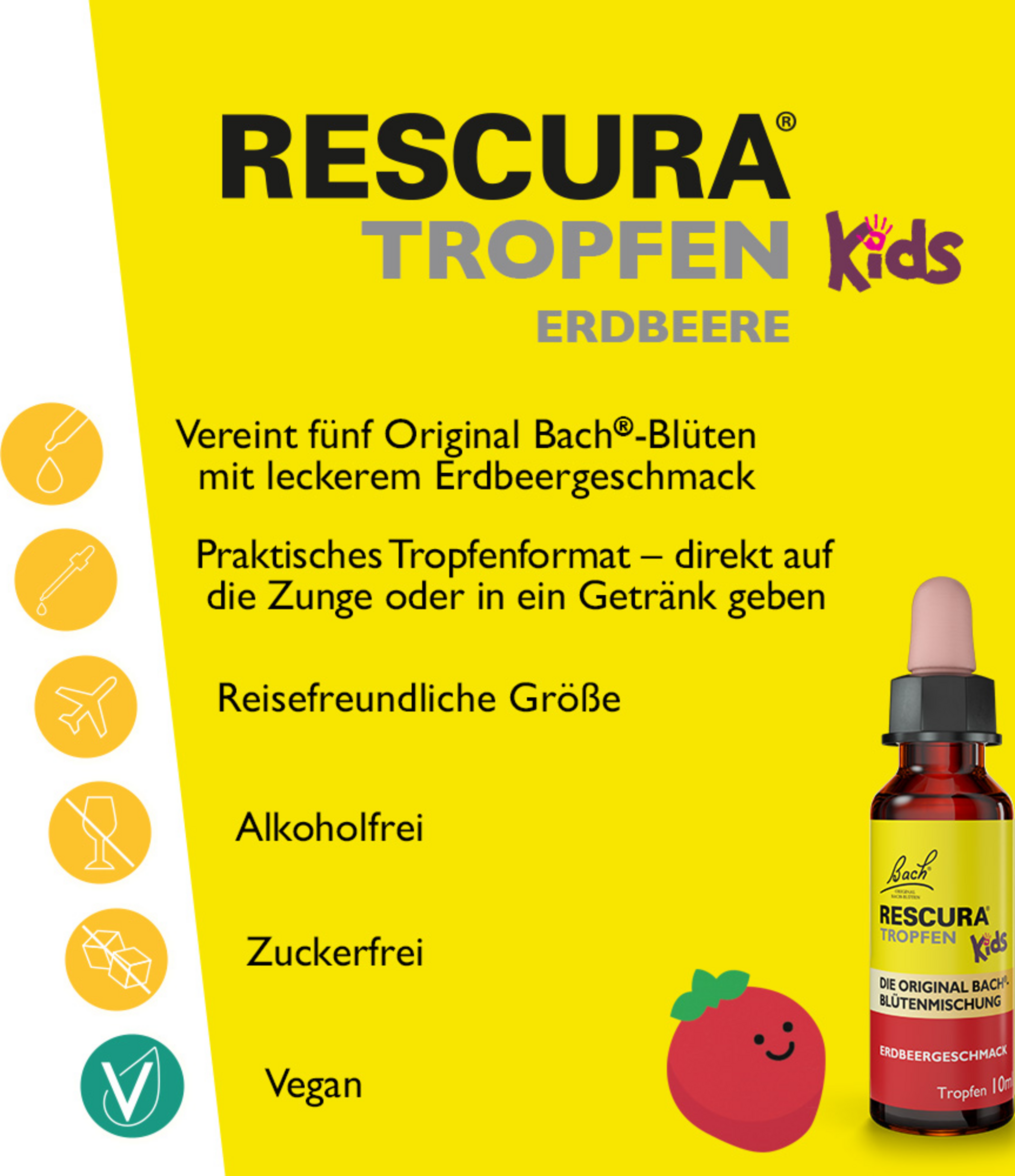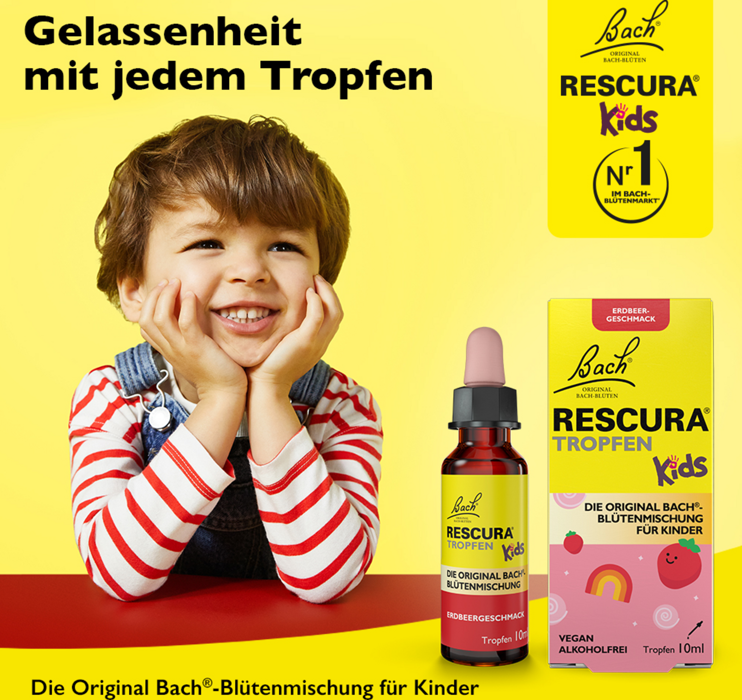 Forældre og omsorgspersoner ønsker intet mere, end at deres Kinder skal føle sig trygge og stærke. Men selv børn bliver nogle gange overvældede og har brug for hjælp til at forblive afslappede. De alkoholfrie Bach RESCURA® KiDS dråber med jordbærsmag støtter ved små og store forstyrrelser i hverdagen og giver Kinder tryghed, ro og fred. Ideel til at vænne sig til nye omgivelser, spændinger på rejser, nervøsitet under eksamener, prøver og forestillinger samt til små og store bekymringer, der tynger et barns hjerte. Dråber for komfort og ro: De alkoholfrie Bach RESCURA® KiDS dråber med jordbærsmag er den ideelle løsning til hverdagens små og store opstød.