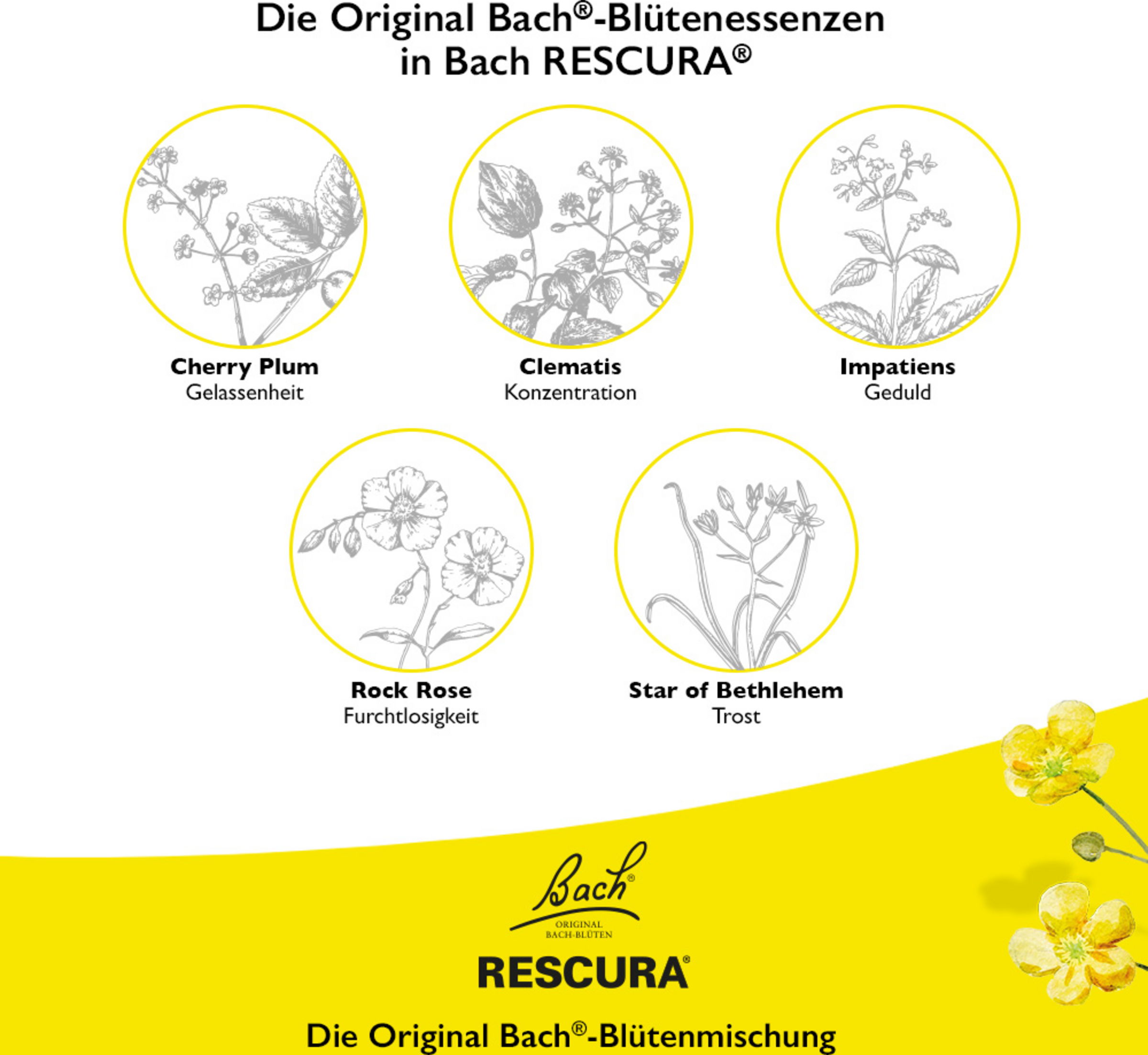 Kosttilskud med Bach® blomsteressenserne balsam, mælkebøtte, kirsebærblomme, gul solhat og Weiss klematis.