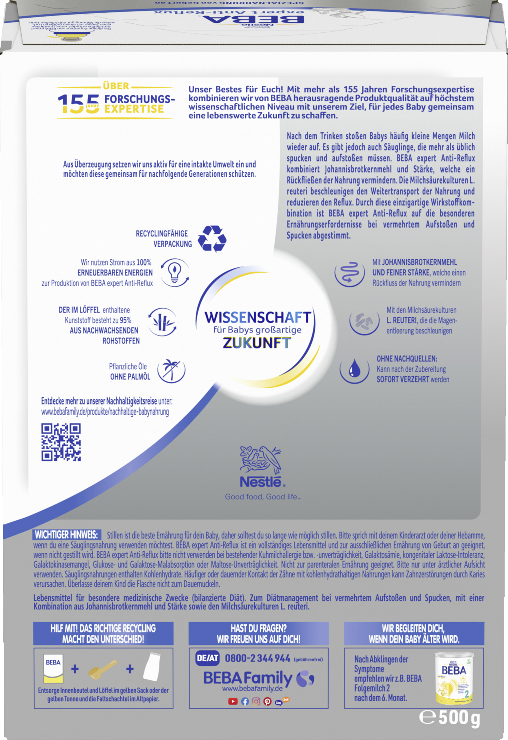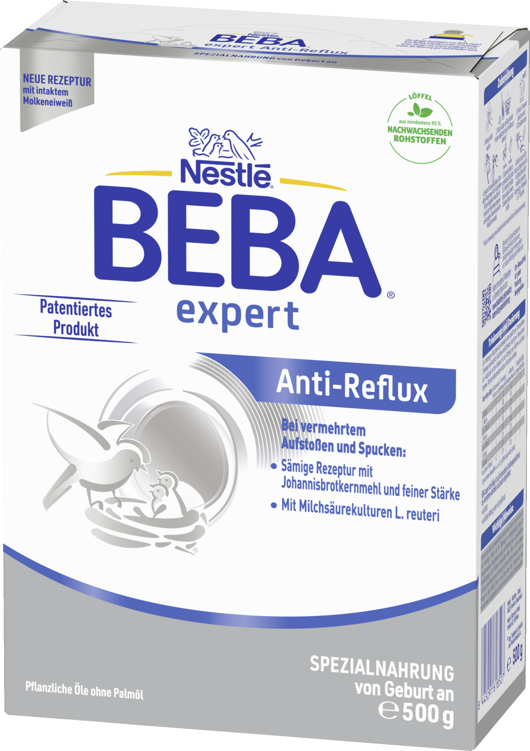 Amning er den bedste kost for din baby, så du bør amme så længe som muligt. Tal med din børnelæge eller sundhedsplejerske, hvis du vil bruge modermælkserstatning. BEBA AR er en komplet fødevare og er velegnet til spædbørn til eneste ernæring fra fødslen, hvis de ikke ammes. Brug ikke BEBA expert Anti-Reflux, hvis du har komælksallergi eller -intolerance, galaktosæmi, medfødt laktoseintolerance, galaktokinase-mangel, glukose- og galaktosemalabsorption eller maltoseintolerance. Ikke egnet til parenteral brug. Bruges kun i samråd med lægen. Babymad indeholder kulhydrater. Hyppig eller langvarig kontakt med fødevarer, der indeholder kulhydrater, kan forårsage karies og ødelægge tænderne. Efterlad ikke flasken hos barnet.