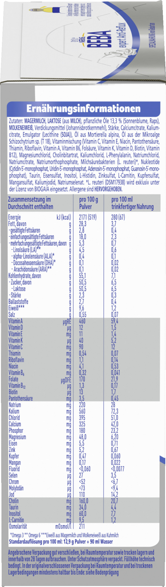 SKUMMET MÆLK, LACTOSE (fra MÆLK), vegetabilske olier 13,3 % (solsikke, raps), HVIDE, fortykningsmiddel (johannesbrødkernemel), stivelse, calciumcitrater, kaliumcitrater, emulgator (lecithiner (SOYA)), olie fra Mortierella alpina, olie fra mikroalgen Schizochytrium sp. (T 18), vitaminblanding (C-vitamin, E-vitamin, niacin, pantothensyre, thiamin, riboflavin, A-vitamin, B6-vitamin, folsyre, K-vitamin, D-vitamin, biotin, B12-vitamin), magnesiumklorid, cholinbitartrat, kaliumklorid, L-phenylalanin, natriumklorid, natriumcitrater, natriumorthofosfater, mælkesyrebakterier (L. reuteri)*, nukleotider (cytidin-5'-monofosfat, uridin-5'-monofosfat, adenosin-5'-monofosfat, guanosin-5'-monofosfat, enz. reuteri)*, nukleotider (cytidin-5'-monophosphat, uridin-5'-monophosphat, adenosin-5'-monophosphat, guanosin-5'-monophosphat), taurin, jernholdigt sulfat, inositol, L-histidin, zinksulfat, L-carnitin, kobbersulfat, mangansulfat, kaliumjodid, natriumselenat.