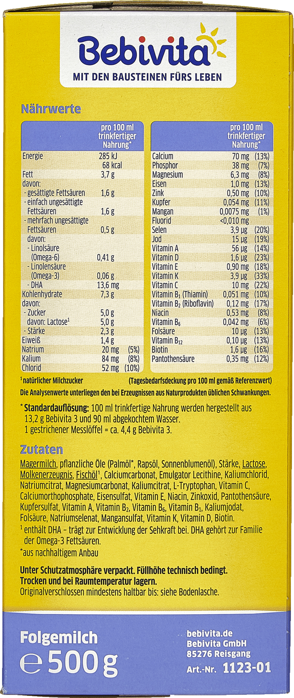 Følg brugsanvisningen, når du tilbereder juniormælk. Forkert tilberedning eller opbevaring af den tilberedte flaske over en længere periode kan medføre sundhedsproblemer, f.eks. på grund af vækst af uønskede bakterier. De angivne drikkemængder er vejledende værdier, som kan variere fra barn til barn. Det ideelle til babyer er ca. 5 måltider om dagen. For hver nyindført fødevare (glas/grød) bør der udelades ét flaskemåltid. Brug den medfølgende måleske. Bebivita 3 juniormælk er godt mættet og dejlig lind. Ideelt set kan du tilbyde Bebivita 3 fra en kop eller bruge en mælke- eller grødsut.