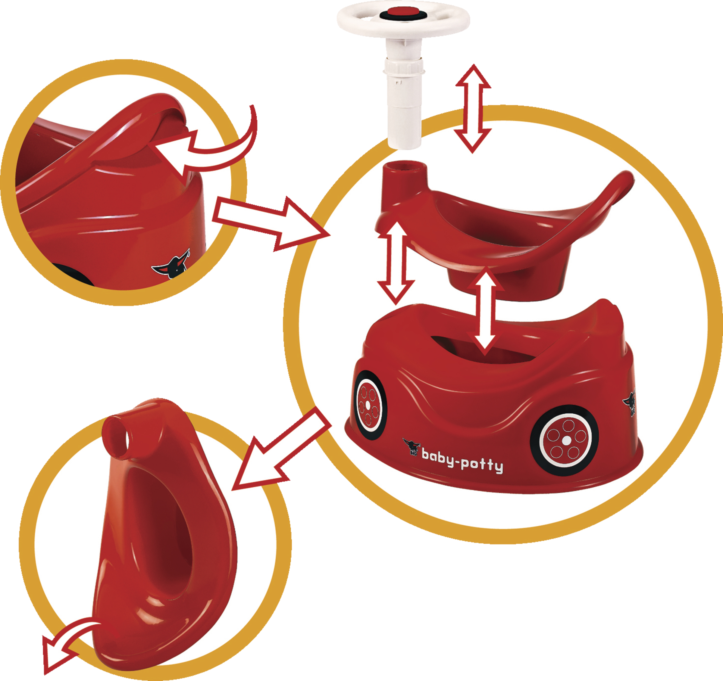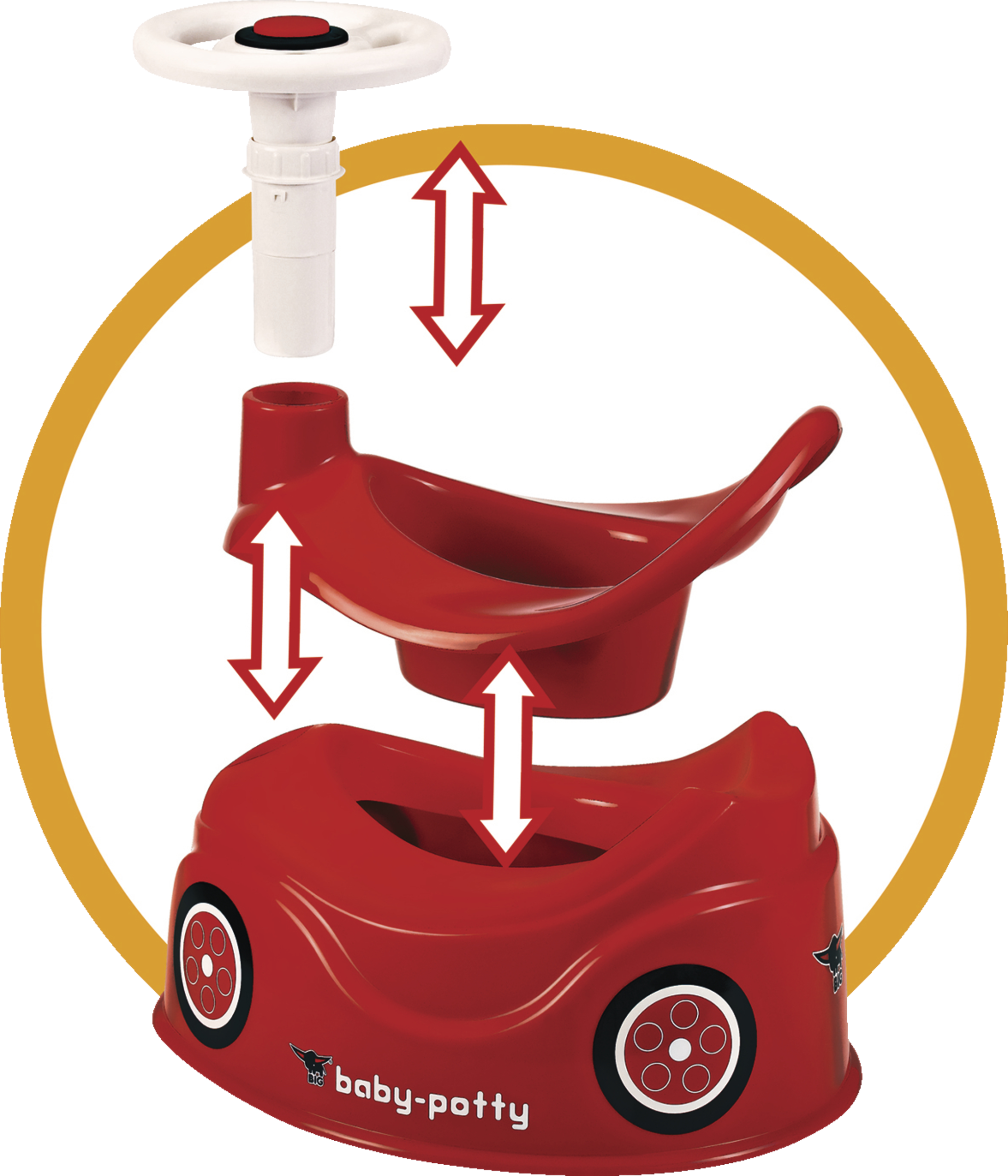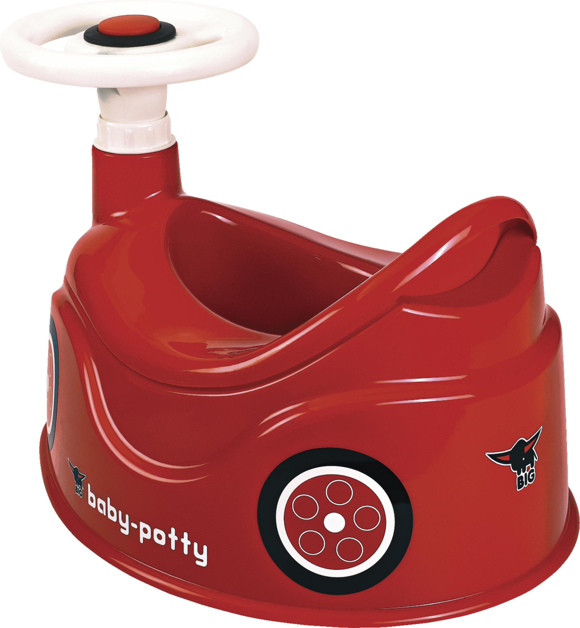 Nu er det nemt at vænne sig fra bleen. Med den sjove læringspotte i BIG Bobby-bildesign er det sjovt at sidde på potte. Potten i klar rød farve har et roterende rat og tiltrækker små børn på magisk vis, så selv lange pottetræningssessioner er ikke noget problem på grund af det komfortable sæde med højt ryglæn. Når målet er nået, kan mor eller far hurtigt tilkaldes med hornet i rattet. Og potten er også ideel for forældre, fordi stænkskærmen forhindrer noget i at gå galt, og den separate indsats gør potten nem at rengøre. Rattet kan nemt afmonteres, og yderdelen kan nemt fjernes med håndtaget bag ryglænet.