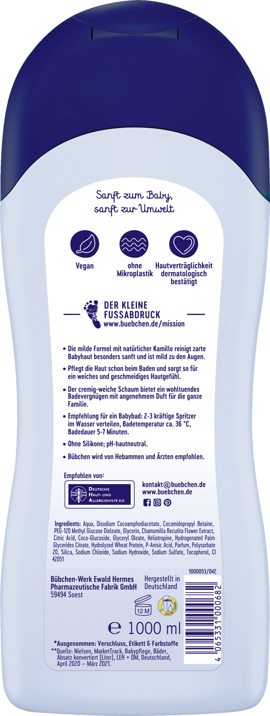 Den milde formel med naturlig kamille renser sart Babyhud særligt skånsomt. Giver næring til huden under Bad og sørger for, at huden føles blød og smidig. Det cremede, bløde skum giver beroligende badefornøjelse med en behagelig Duft for hele familien. Uden silikone; pH-neutral, uden Mikroplast. Bübchen anbefales af jordemødre og læger. Hudvenlighed dermatologisk bekræftet. vegansk
