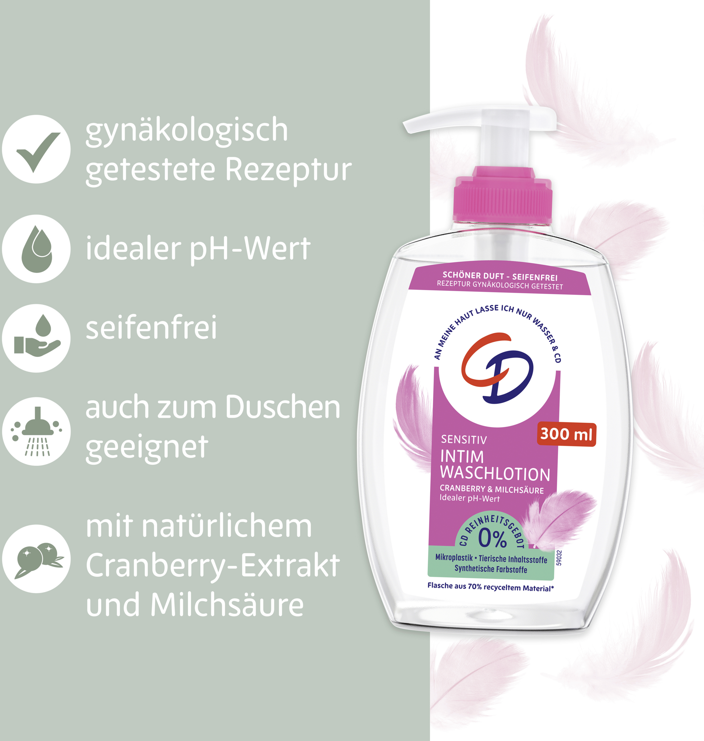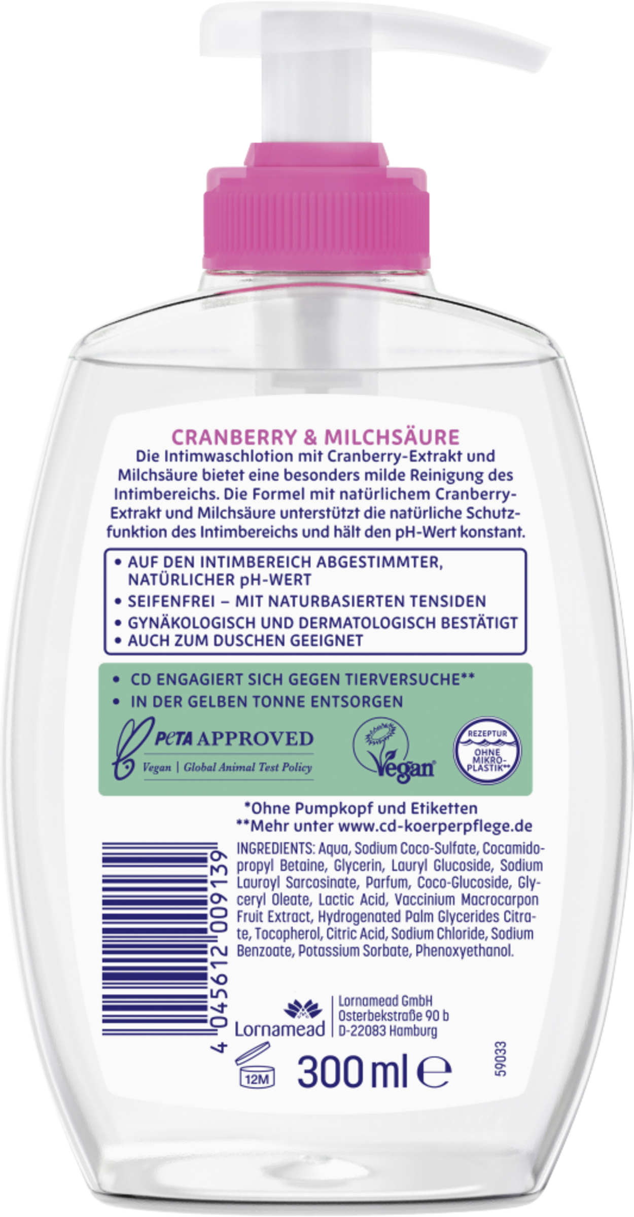 Intimvaskelotionen med tranebærekstrakt og mælkesyre giver en særlig mild rengøring af intimområdet. Formlen med naturligt tranebærekstrakt og mælkesyre understøtter intimområdets naturlige beskyttende funktion og holder pH-værdien konstant.