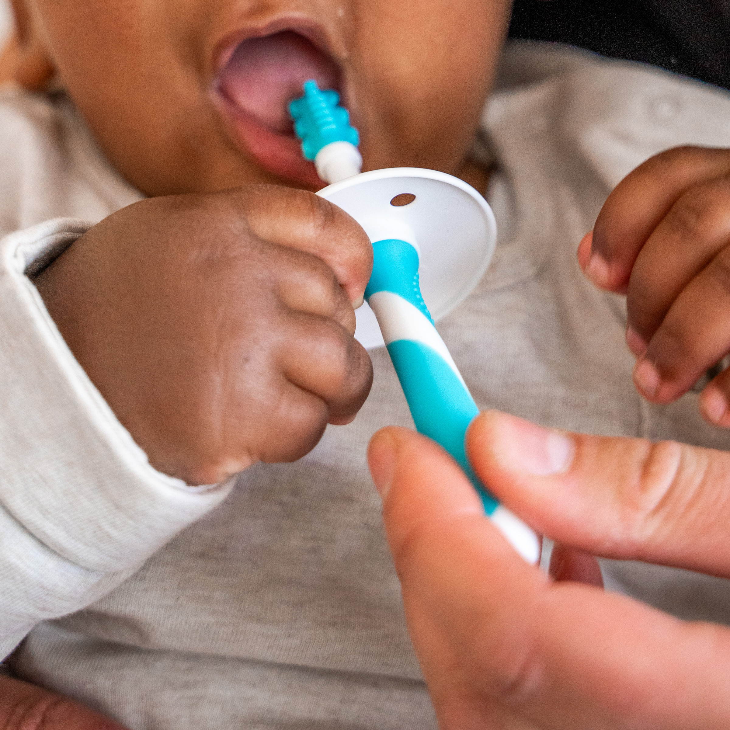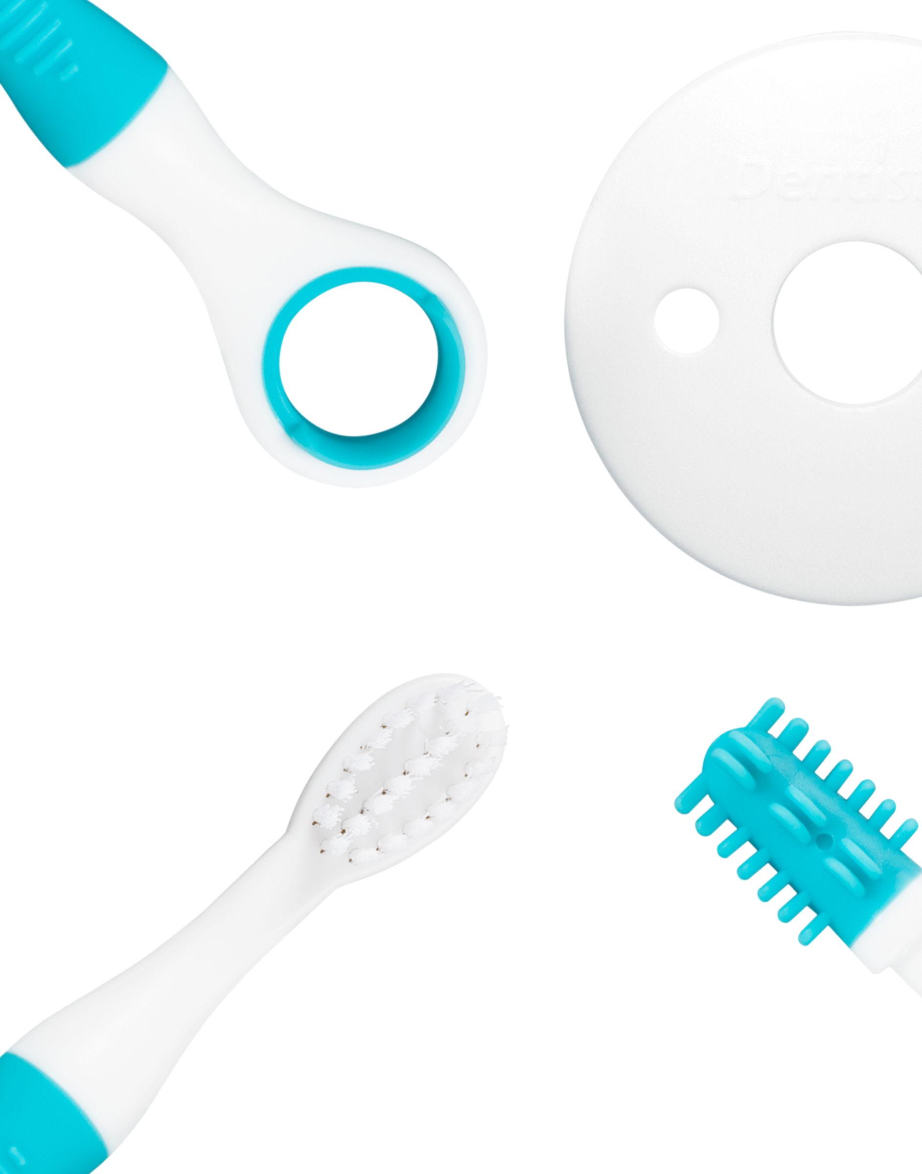 Med begyndertandbørsten masserer dit barn forsigtigt tandkødet og vænnes dermed til at børste tænderne. Den beskyttende ring forhindrer, at begyndertandbørsten kommer for langt ind i halsen. Med tandbørsten renser mor og far de små tænder, og med tungerenseren sikrer du optimal mundhygiejne. De ergonomisk formede og skridsikre håndtag passer godt i hånden og sikrer et sikkert greb.