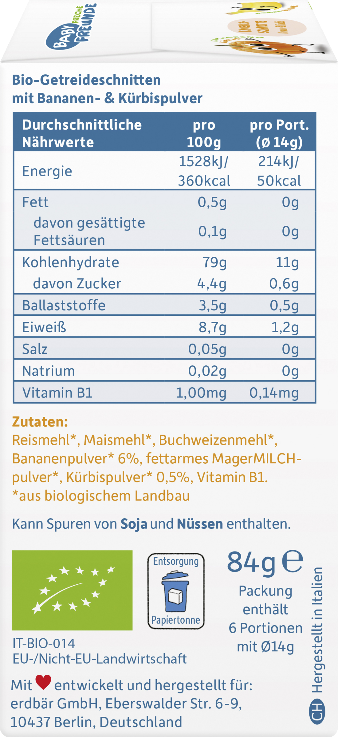 Rismel*, Majsmel*, boghvedemel *, bananpulver * 6%, fedtfattigt MÆLKEPULVER*, græskarpulver * 0,5%, vitamin B1.