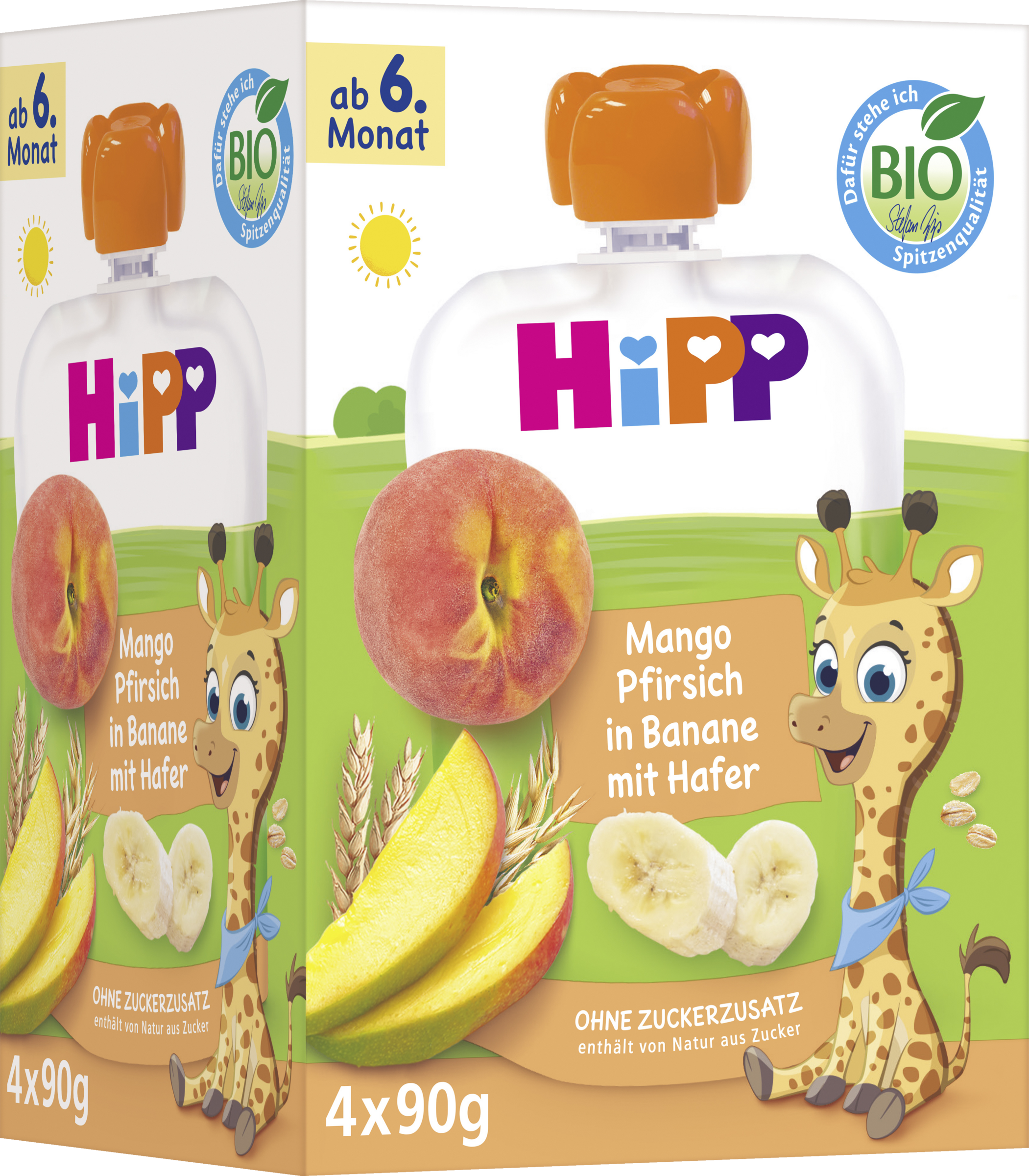 Grødsnack med frugt til de små, uden tilsat sukker, i en praktisk klempose og med den gratis HiPP-ske vedhæftet som et praktisk tilbehør på farten.
