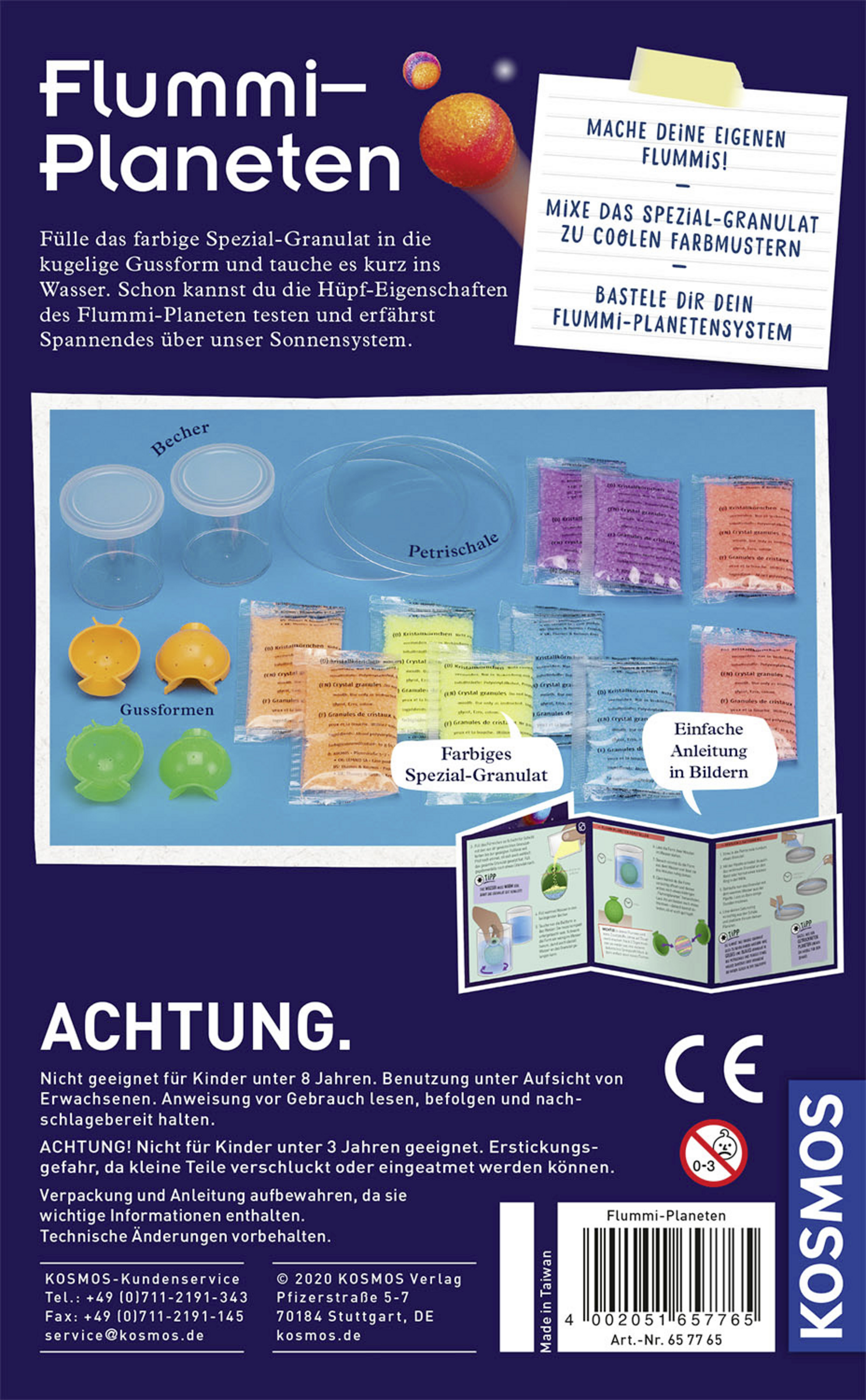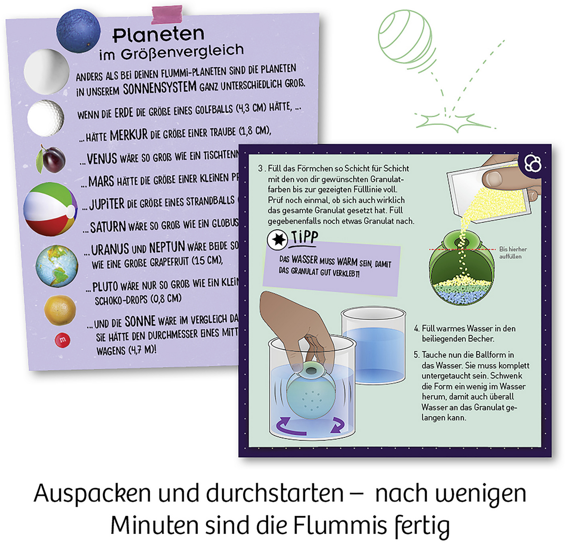 Du skal blot blande eller lægge de specielle farvegranulat i planetformerne og placere dem i vandet. De fantastisk mønstrede hoppebolde er klar allerede efter få minutter!