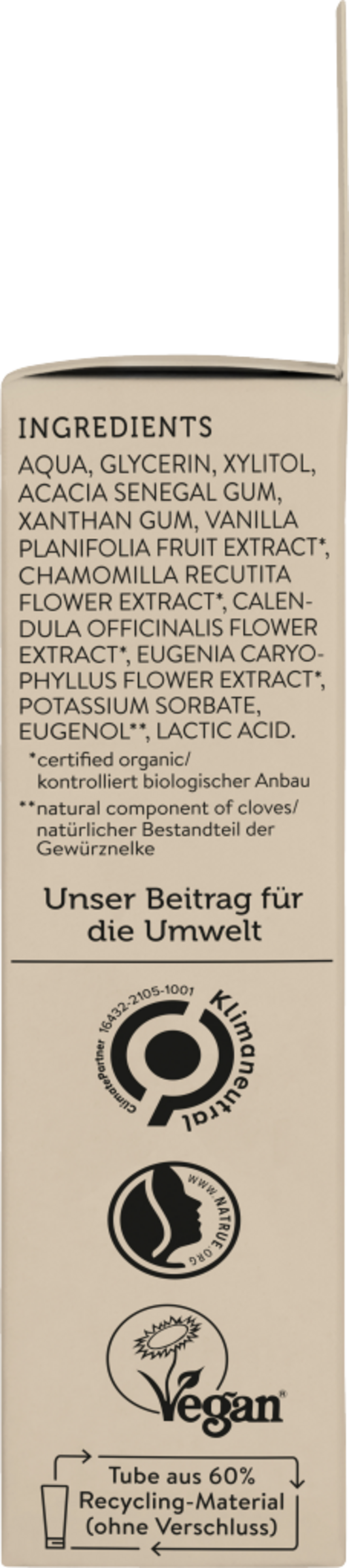 AQUA, GLYCERIN, XYLITOL, ACACIA SENEGAL GUM, XANTHAN GUM, VANILLA PLANIFOLIA FRUIT EXTRACT*, CHAMOMILLA RECUTITA FLOWER EXTRACT*, CALENDULA OFFICINALIS FLOWER EXTRACT*, EUGENIA CARYOPHYLLUS FLOWER EXTRACT*, POTASSIUM SORBATE, EUGENOL**, LACTIC ACID.