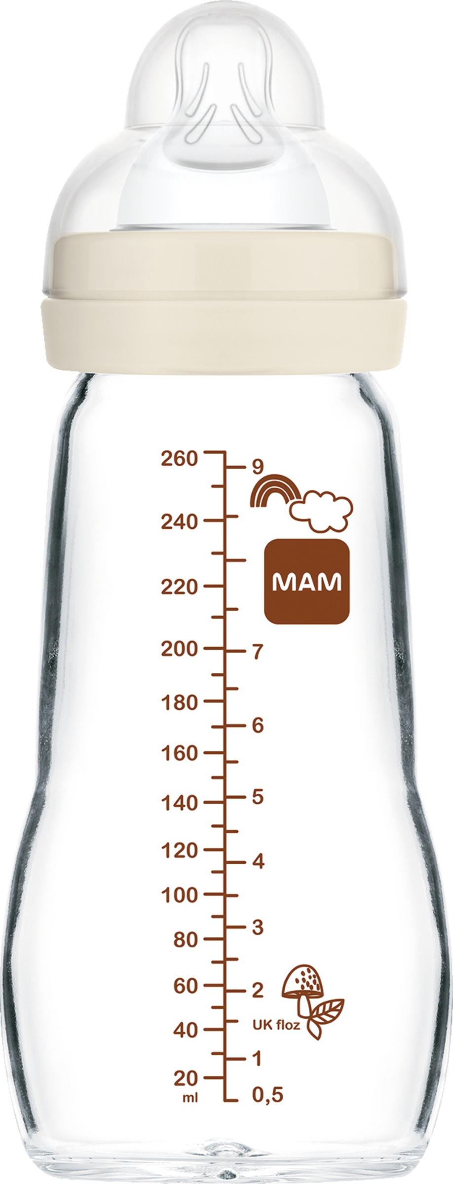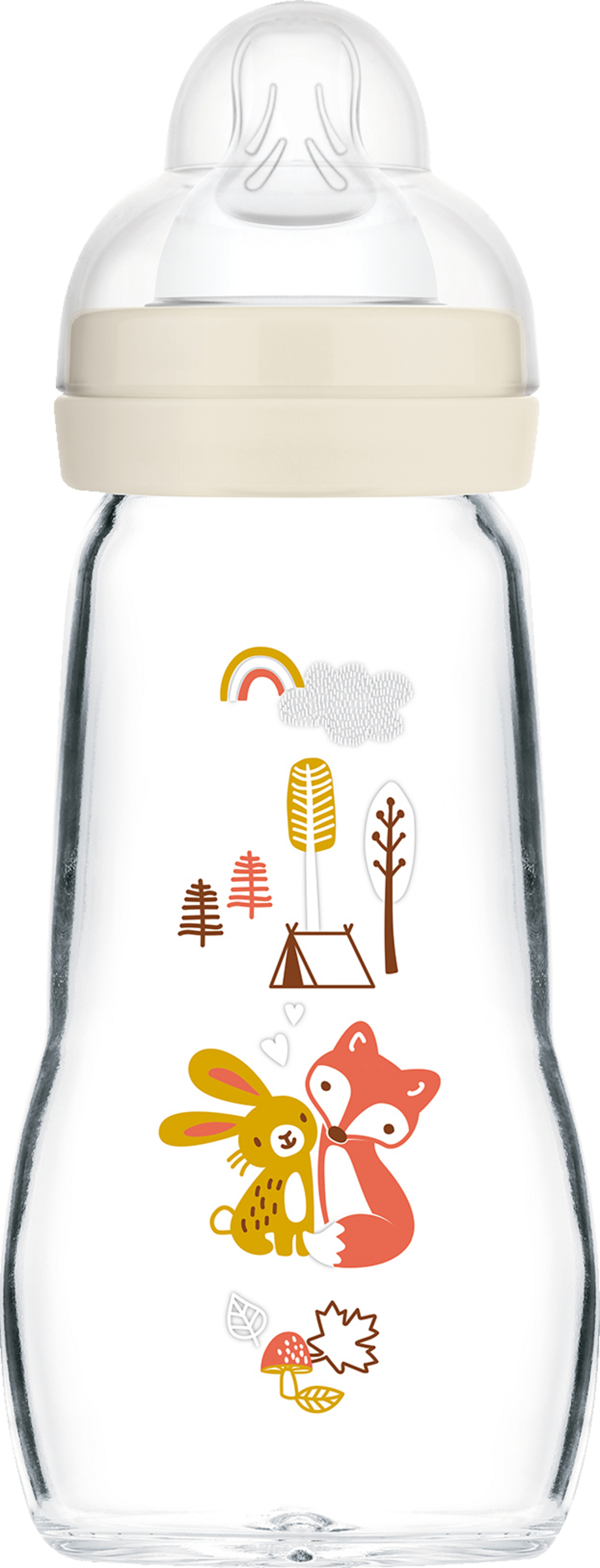 Med MAM Feel Good 260 ml glasflaske har du en holdbar og ukompliceret følgesvend: Til hende er der brugt et traditionelt materiale, som er miljøvenligt og genanvendeligt. Det førsteklasses glas er temperatur- og varmebestandigt samt hygiejnisk. En anden stor fordel er, at glasset ikke tager imod lugt eller smag. Materialet misfarves ikke, og med en kapacitet på 260 ml er det ideelt til barnets første måltider. Den ergonomiske form på MAM flasken garanterer en sikker stand og gør den behagelig at holde. Kannen scorer også højt, når det gælder udseende: Det søde, børnevenlige print med dyr gør Feel Good Elements flasken til en dejlig tilføjelse til babyens udstyr.