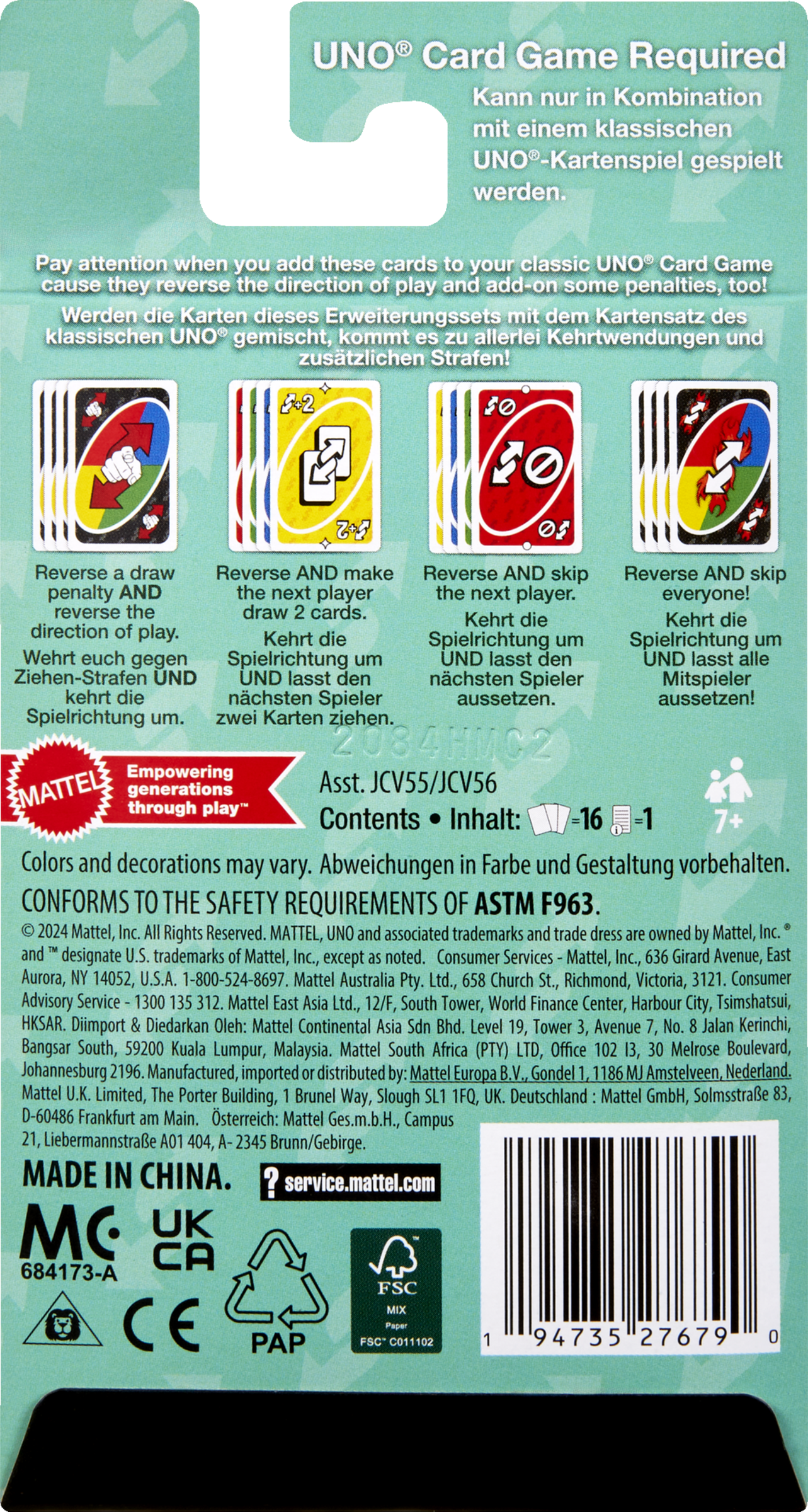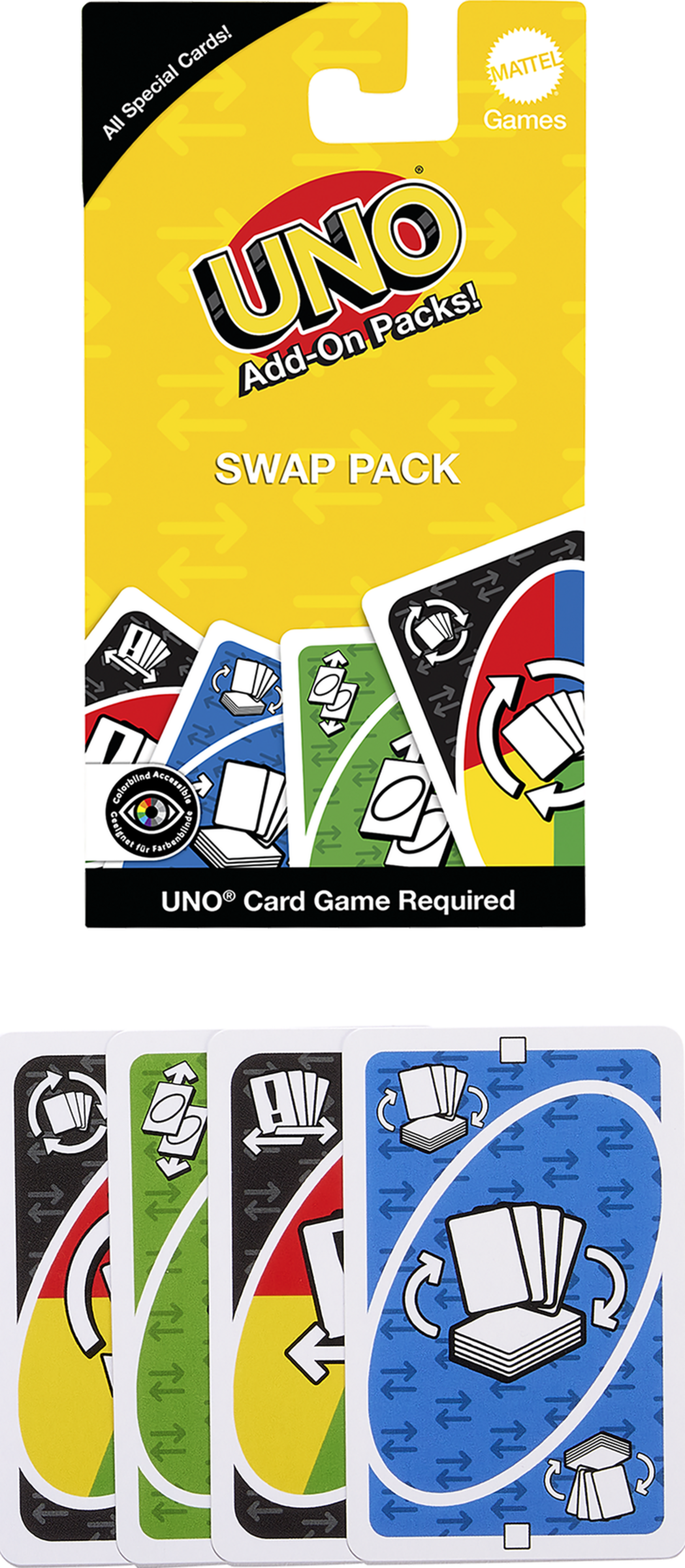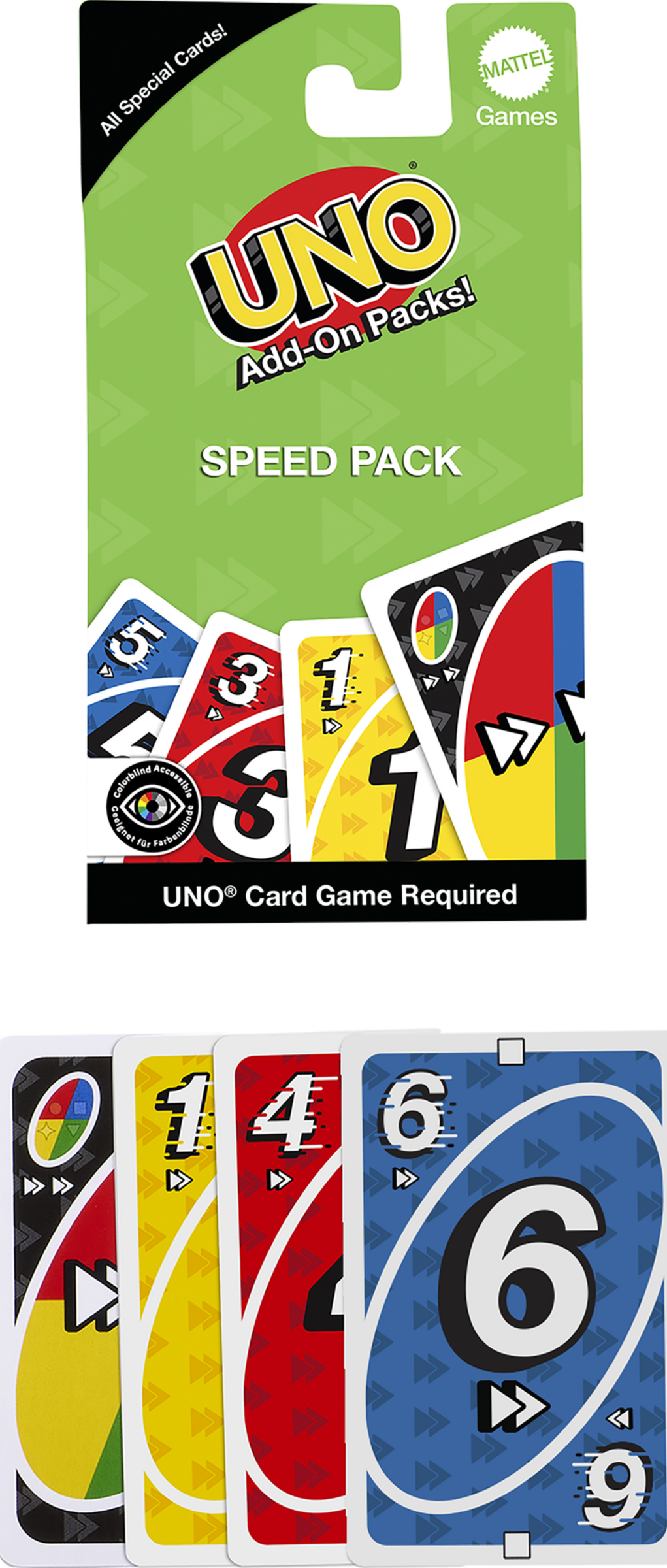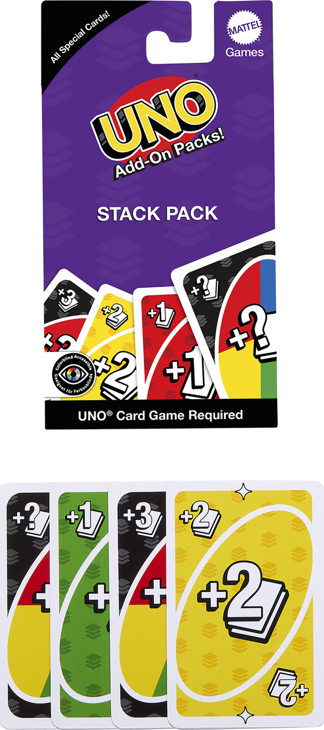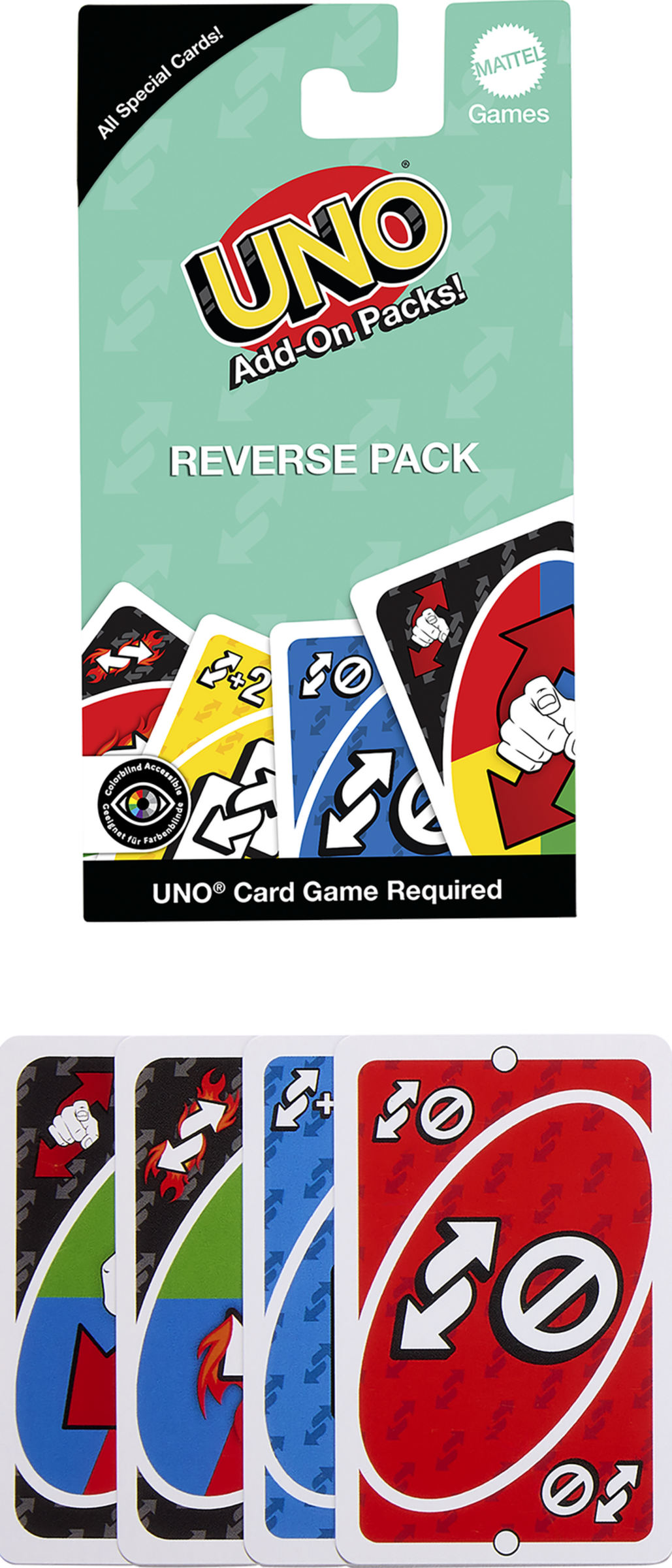 Med de særlige kort fra disse sæt bliver et klassisk UNO-kortspil rigtig sjovt! Der er et sæt, hvor alle kort skifter retning, et sæt, hvor spillerne stabler straffekort oven på andre straffekort, et sæt, hvor spillerne bytter kort, og et sæt, hvor spillerne smider flere kort på én gang. Kortsættene er en god gave til UNO-fans og kortspilselskere fra 7 år og opefter. Hver pakke fås separat. Farve og design kan variere.