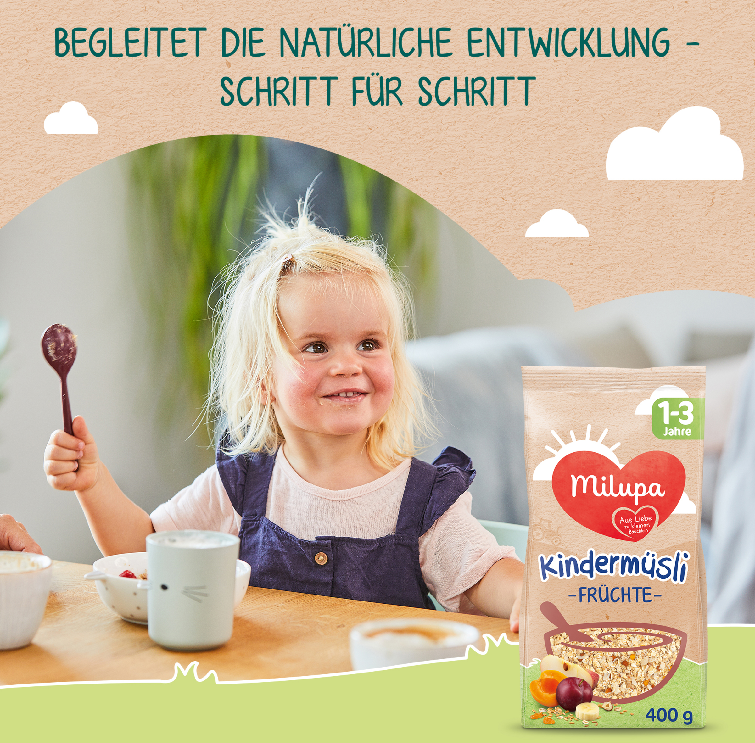 Dit lille solskin er allerede et lille barn. For at være forberedt på dine udforskninger i løbet af dagen, er morgenmaden særlig vigtig som det første måltid. Milupa Børnemüsli er blevet skræddersyet til små børns ernæringsbehov i forhold til deres alder. Som en komplet morgenmad giver den sund energi og vigtige næringsstoffer til en god start på en aktiv dag for småbørn.