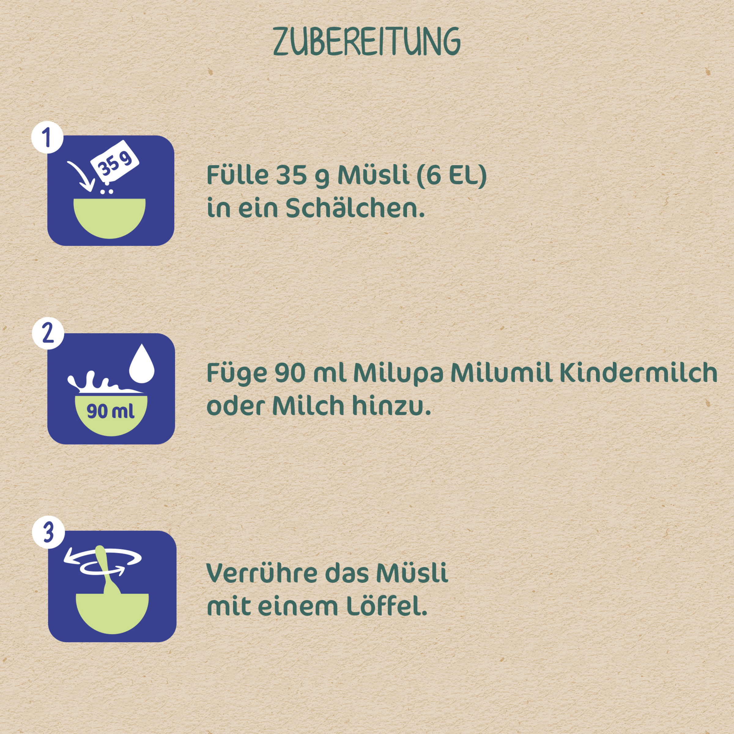 Følg venligst følgende forberedelsesinstruktioner nøjagtigt - for dit barns Sundhed : Tilbered maden frisk før hvert måltid, og giv den til barnet med det samme. Genbrug ikke fødevarerester. Opvarm ikke spædbørnsmad i mikrobølgeovnen (risiko for overophedning) og kontroller temperaturen før fodring. -Hæld 35 g Müsli (6 spsk) i en skål -Tilsæt 90 ml Milupa Millumil Børnemælk eller mælk. -Bland Müsli med en ske.