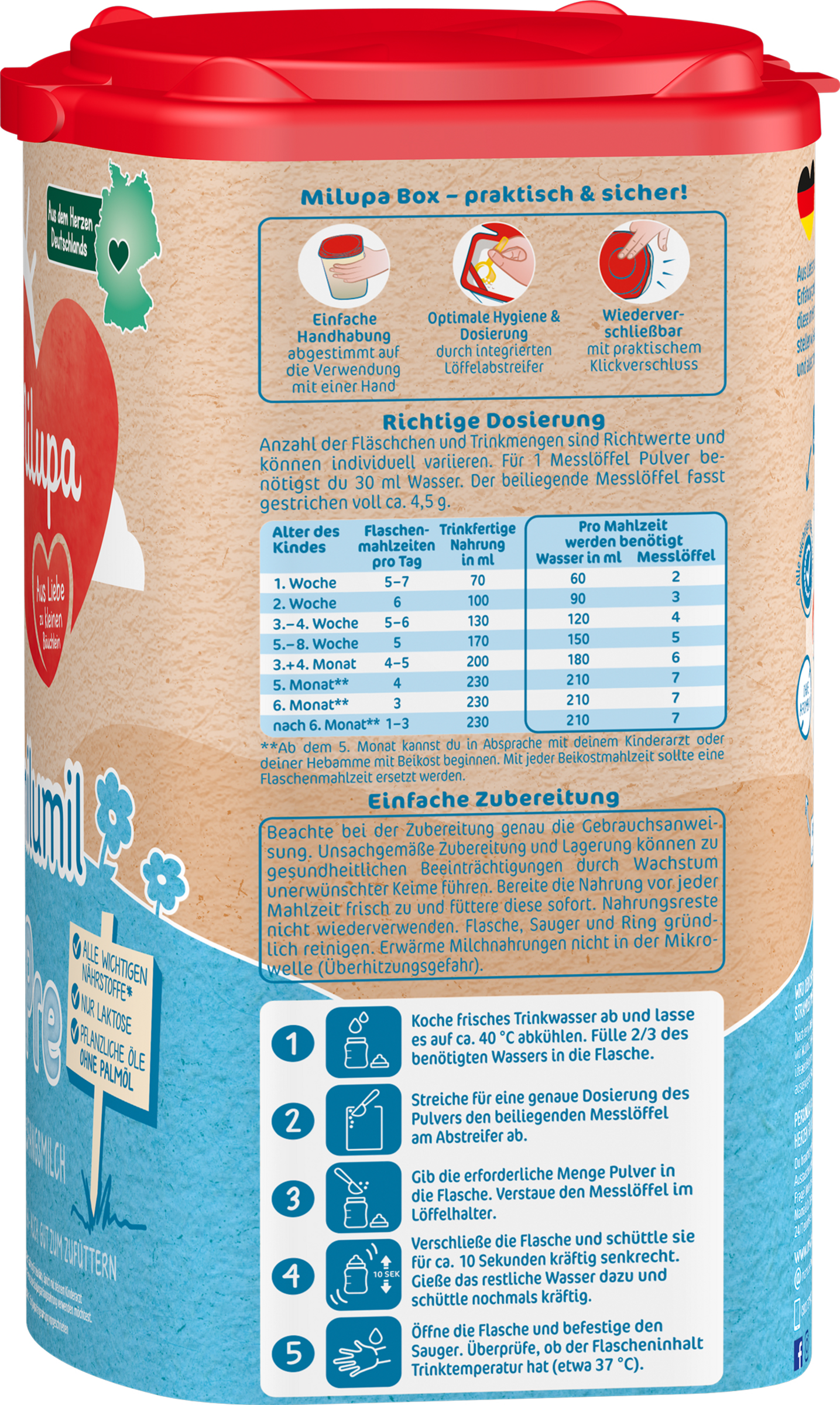 De angivne mængder væske og antallet af flasker pr. dag skal betragtes som vejledende og kan variere individuelt. Den medfølgende måleske rummer cirka 4,6 g Milumil Pre Bemærk venligst Doseringstabel på produktemballagen.