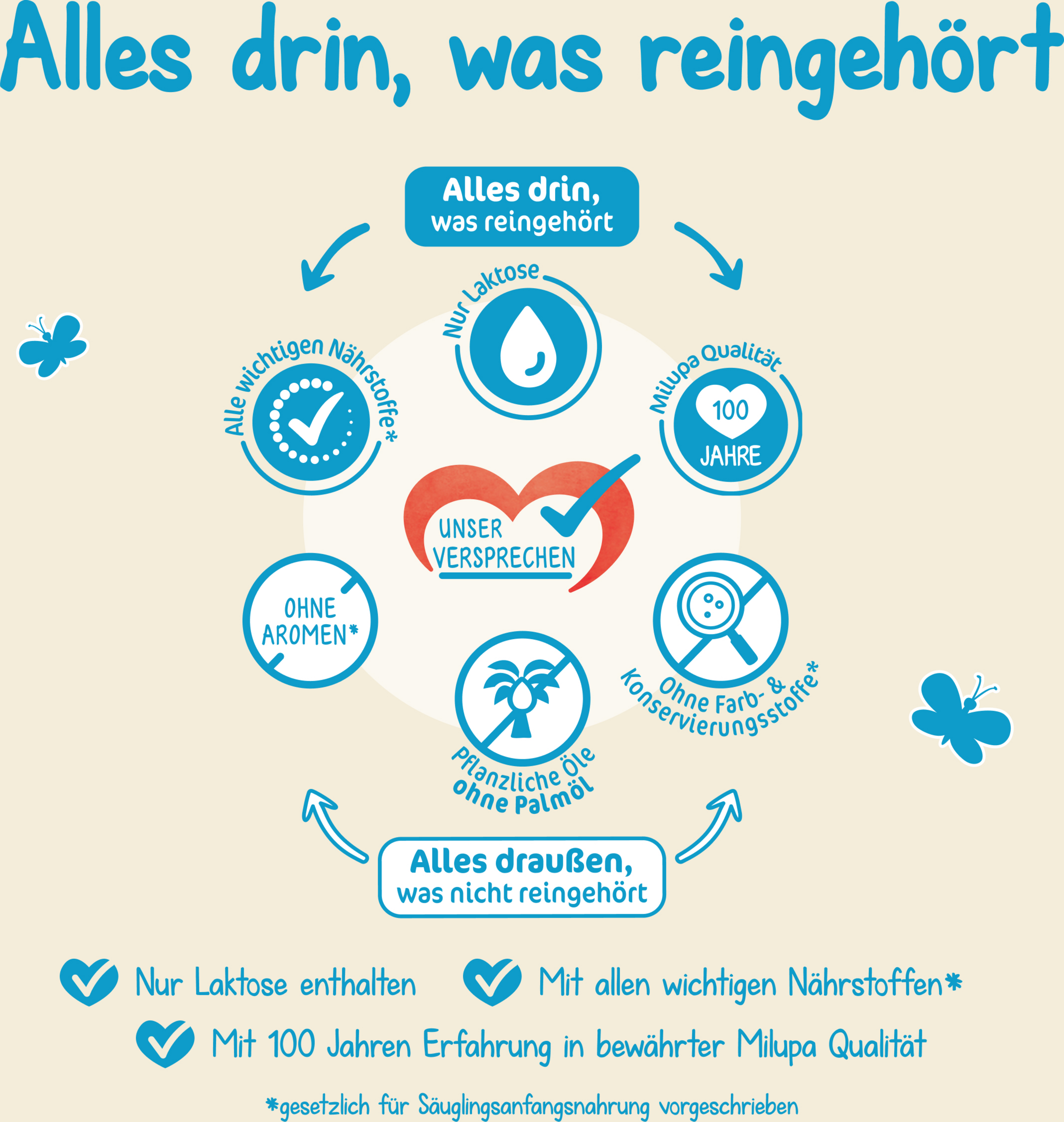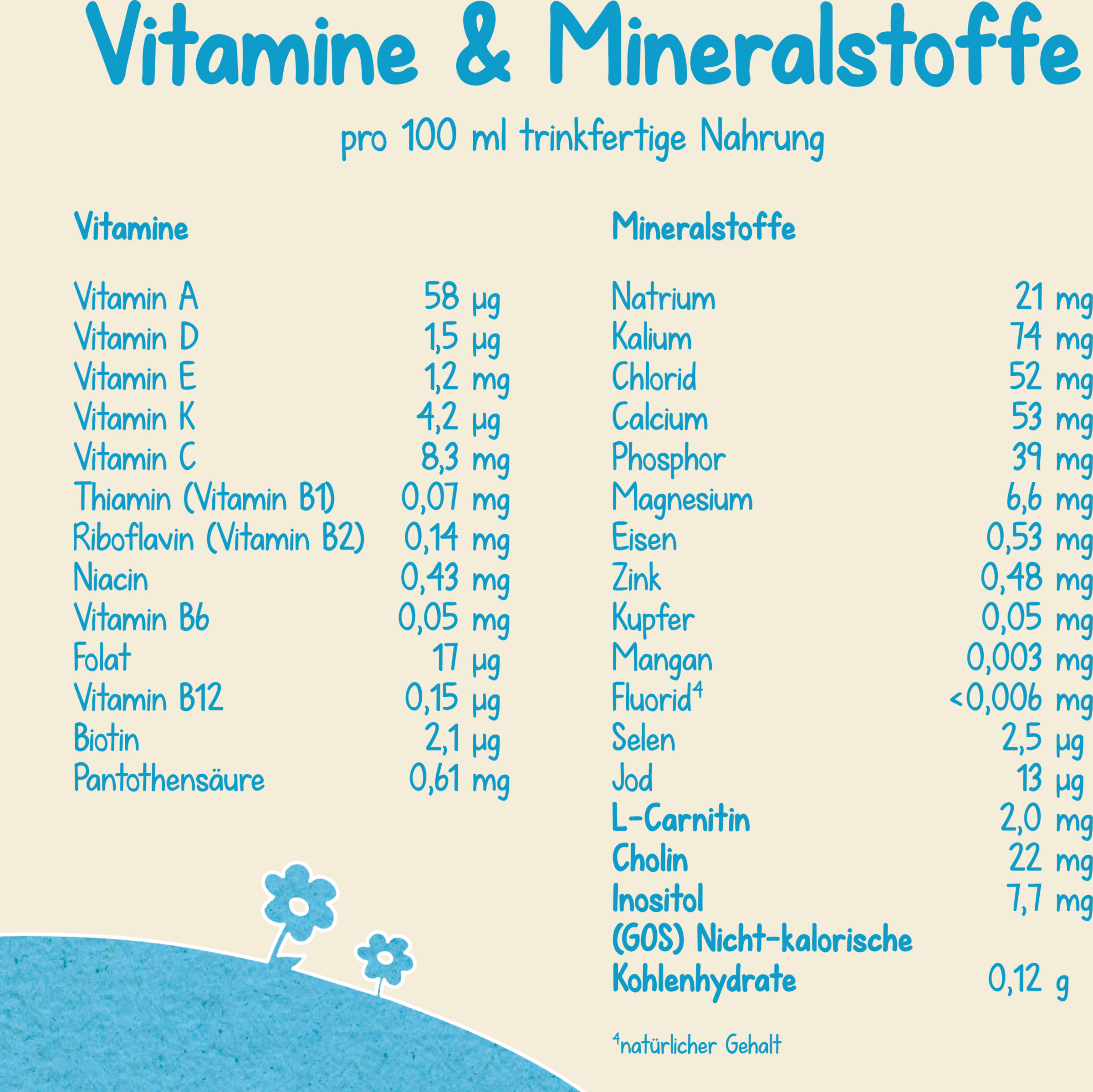 Laktose (fra MÆLK), vegetabilske olier (palme, kokos, raps, Solsikkeolie), skummetmælk, demineraliseret valle (fra MÆLK), galactooligosaccharider (fra MÆLK), vallekoncentrat (fra MÆLK), valleprotein (fra MÆLK), fructooligosaccharider , Calciumorthophosphat, FISKEOLIE, kaliumchlorid, olie fra Mortierella alpina, Natriumcitrat, cholinchlorid, C-vitamin, magnesiumorthophosphat, Emulgator (SOJALECITHIN), inositol, taurin, kaliumcitrat, magnesiumchlorid, L-carnitchlorid, jern-II , zinksulfat, nukleotider (natriumsalte af uridin-, cytidin, adenosin, inosin, guanosin-5-monophosphat), E-vitamin, pantothensyre, niacin, kobbersulfat, A-vitamin A, vitamin B2, vitamin B1, vitamin B6, Kaliumiodid, Folsyre, natriumselenit, mangan II-sulfat, vitamin K, D-vitamin, biotin, vitamin B12.