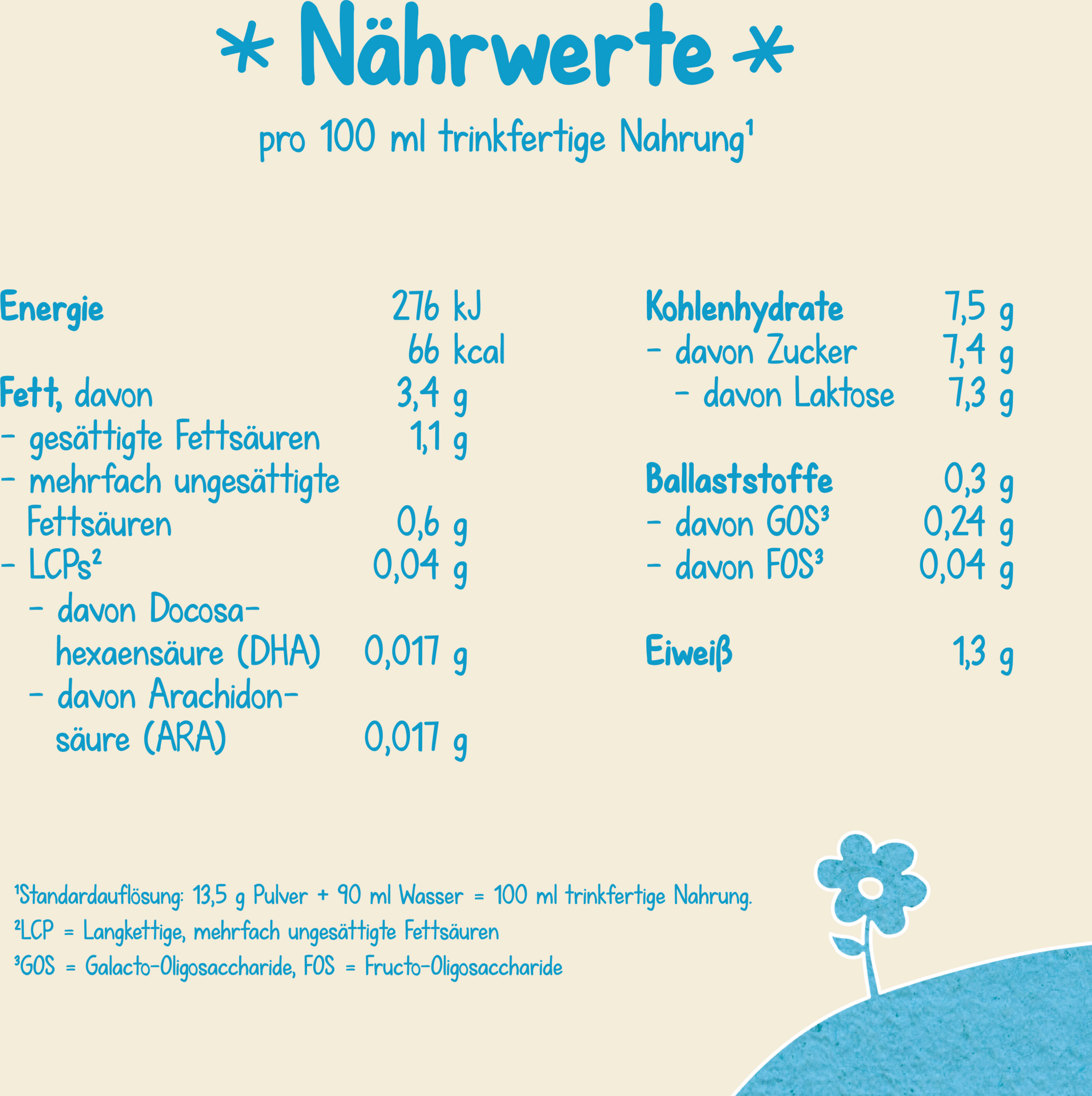 | 13,8 g Pulver + 90ml Wasser = 100ml trinkfertige Nahrung. | ||