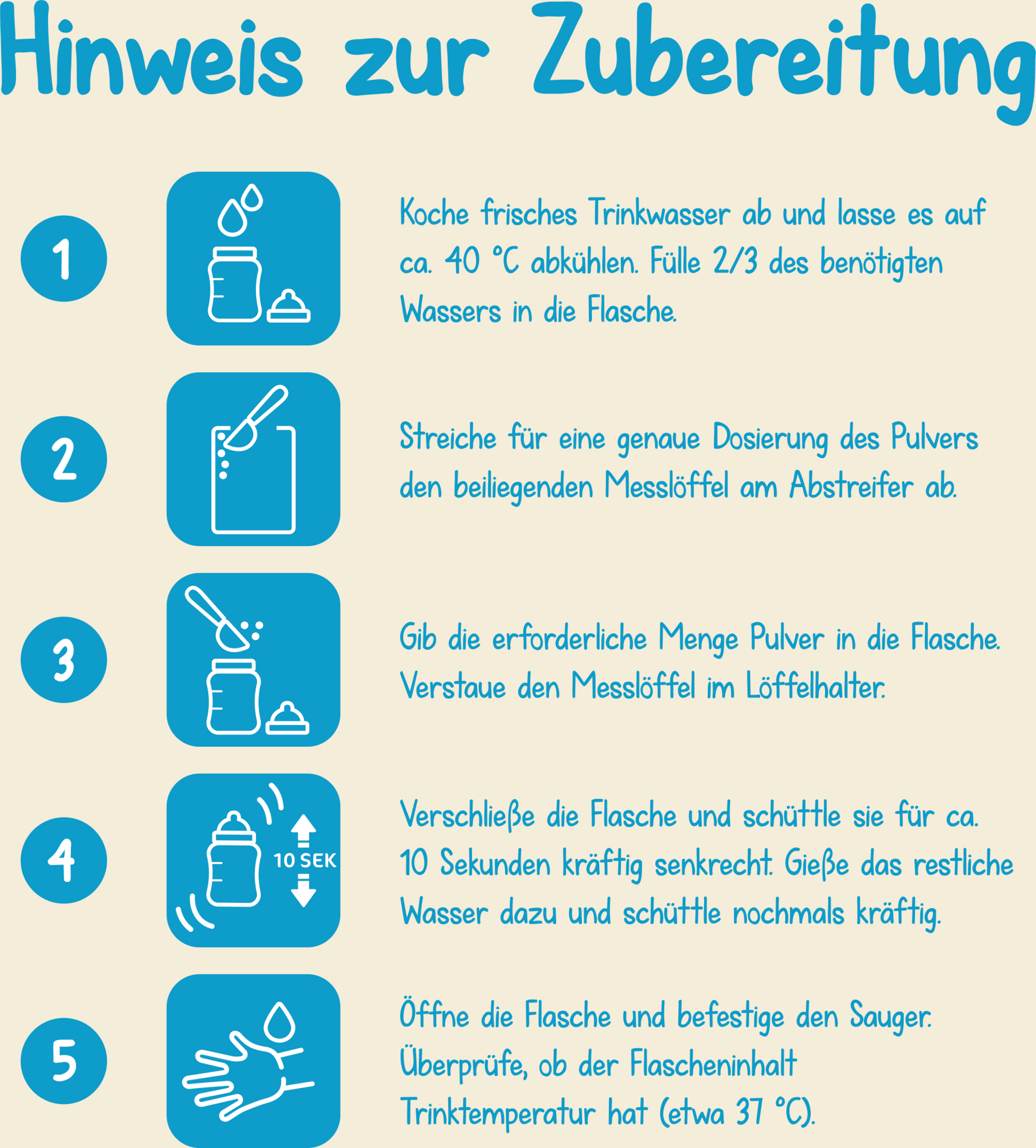 Følg brugsanvisningen omhyggeligt under tilberedning. Forkert tilberedning og opbevaring kan føre til sundhedsproblemer forårsaget af vækst af uønskede bakterier. Tilbered maden frisk før hvert måltid, og giv den til barnet med det samme. Genbrug ikke fødevarerester. Rengør flasken, sutten og ringen grundigt. Opvarm ikke mælkeblandinger i mikrobølgeovnen (risiko for overophedning).