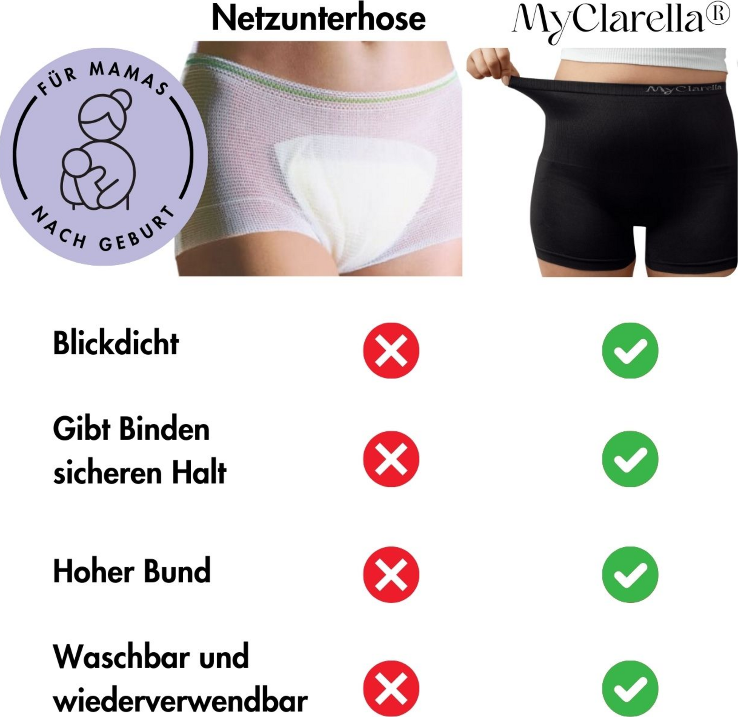Vidste du, at klassisk mesh-undertøj stadig er standard på hospitaler og fødselshjælp i dag? MyClarella er af den opfattelse: "Du har lige født et menneske, så du skal have lov til at føle dig som et menneske." Det er netop derfor, MyClarella har fundet frem til en meget mere komfortabel og bæredygtig løsning med THE POSTPARTUM PANTY.