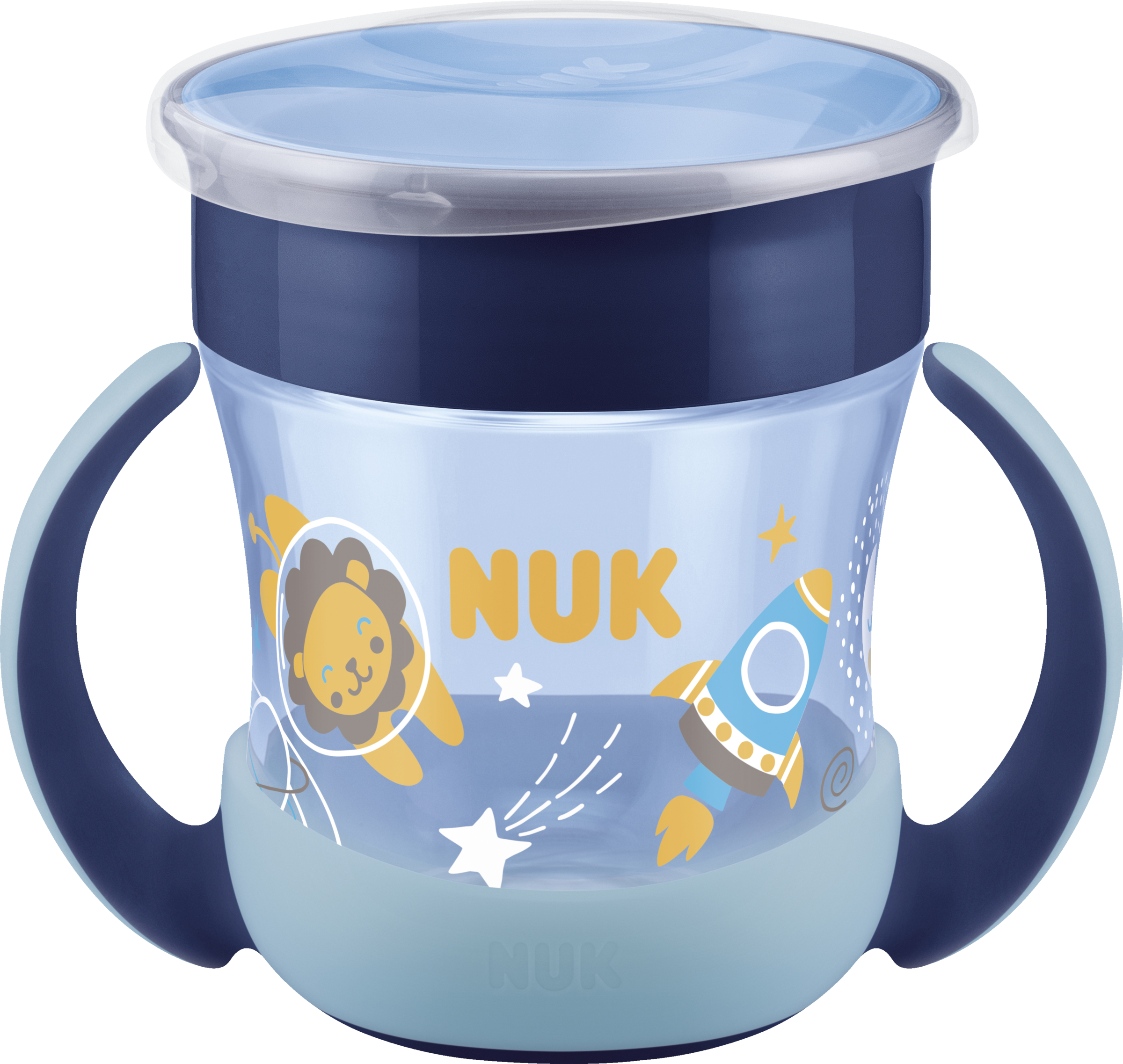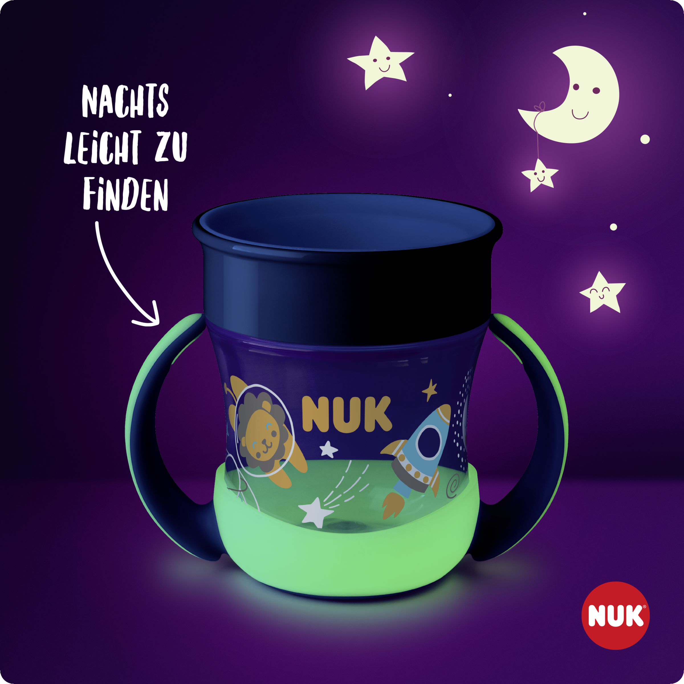 NUK Mini Magic Cup Night - at lære at drikke er inden for rækkevidde. Med NUK Mini Magic Cup kan selv de mindste drikke som de store. Drikkekanten på 360° fremmer og træner at der drikkes fra alle sider – næsten som en almindelig kop. Den "magiske" forskel: Koppen kan ikke lække, fordi en silikoneskive forsegler indersiden af koppen. At drikke er stadig meget nemt: Dit barn skal bare sutte lidt på kanten af koppen. Derudover er koppen ekstra lille og praktisk. Takket være de ergonomiske håndtag kan selv små fingre og hænder nemt holde den.