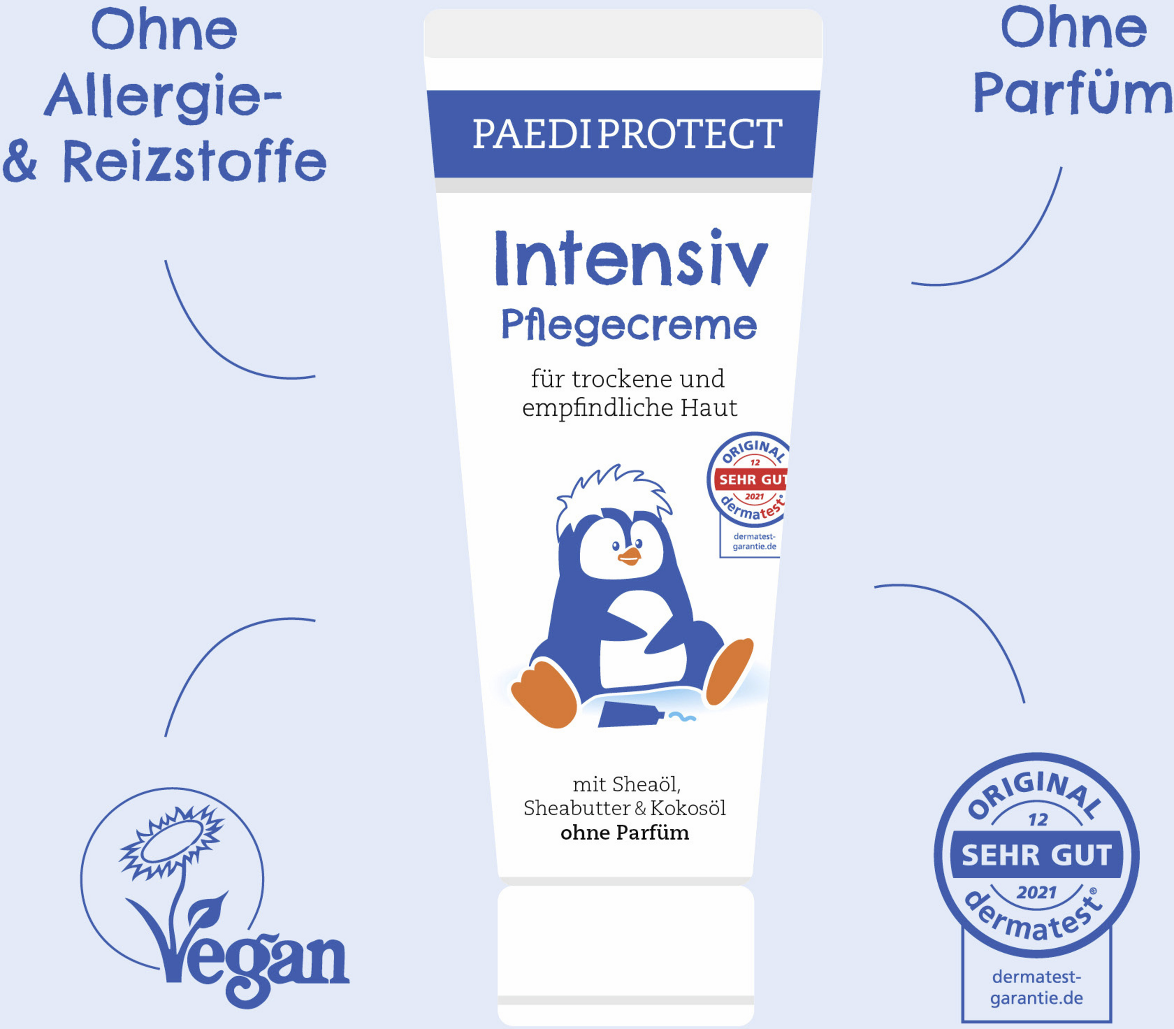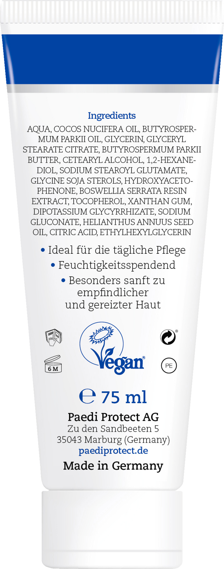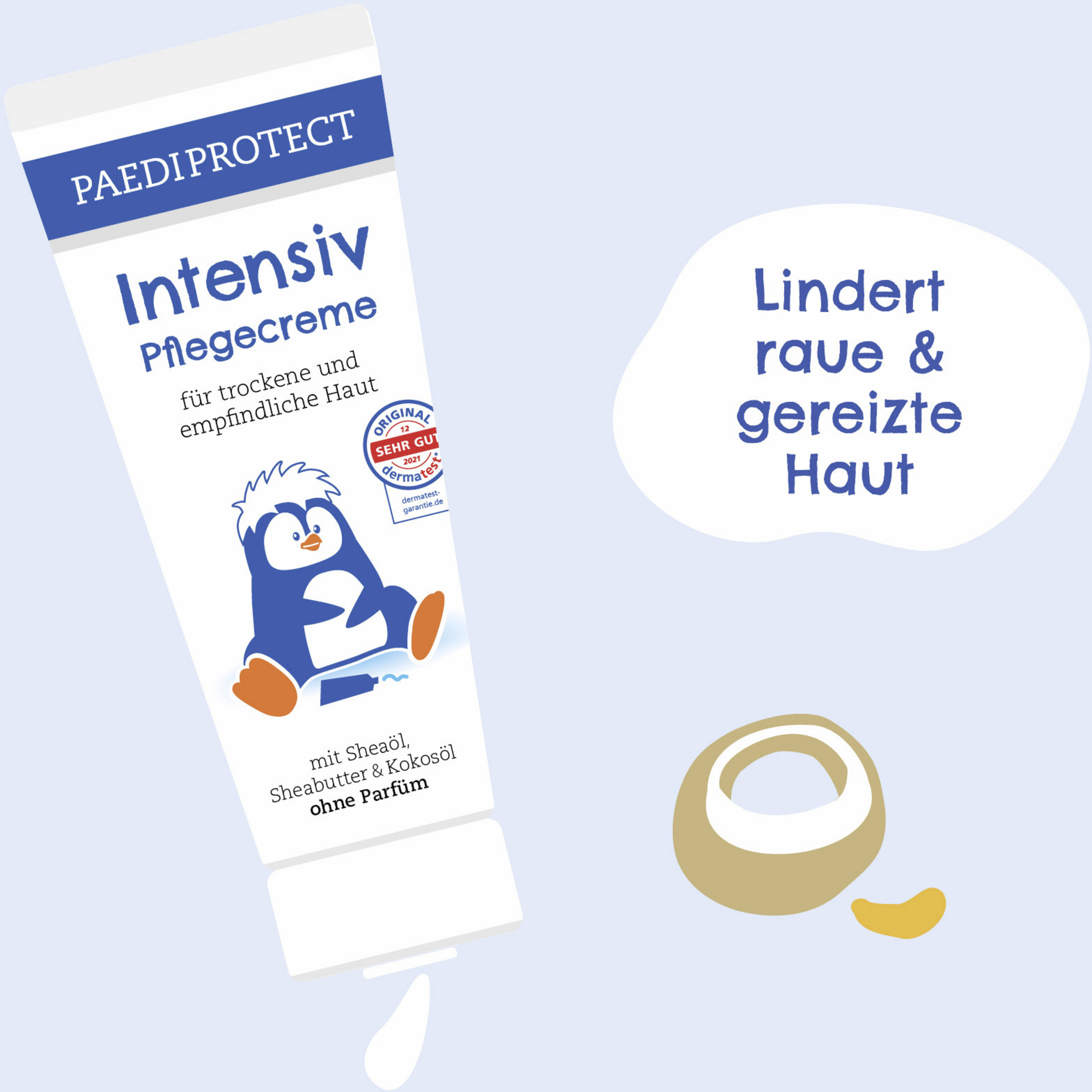 PAEDIPROTECT intensiv plejecreme med sheasmør og kokosolie giver særligt tørre og ru hudområder en ekstra portion fugt. Den rige formel giver intensiv næring til følsom hud uden at efterlade en fedtet film. Lakridsrodsekstrakt virker beroligende og styrker hudens beskyttelsesbarriere. alsidig anvendelse: Den er den perfekte tilføjelse til vores milde hudplejeserie. Naturligvis vegansk, parfumefri og uden mikroplast.