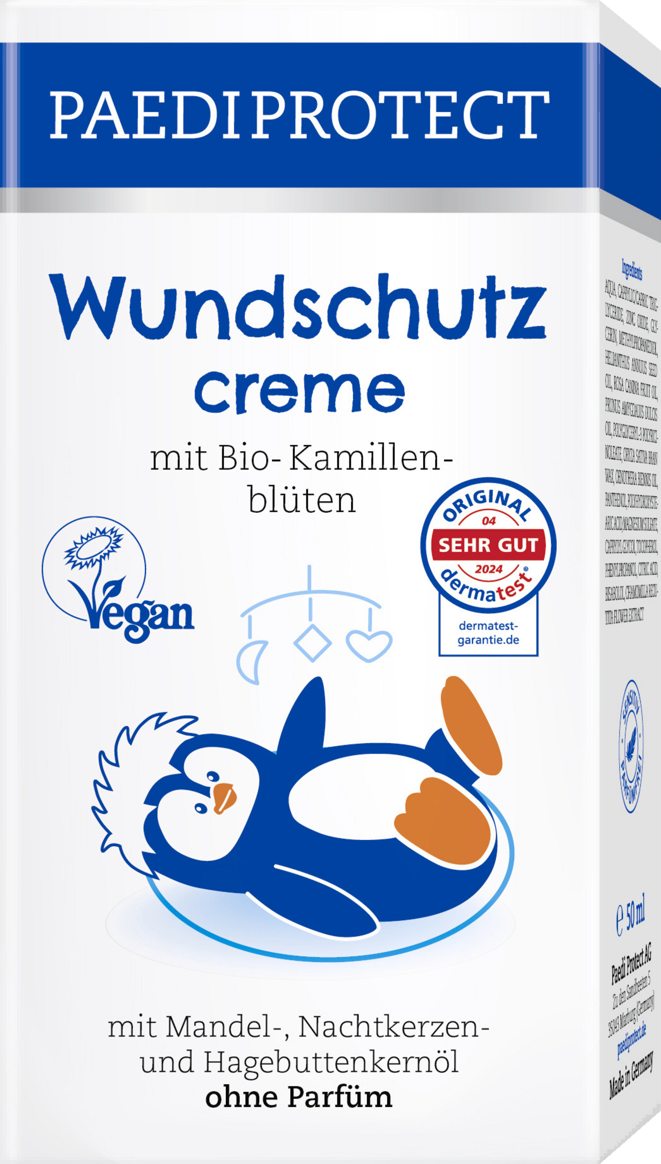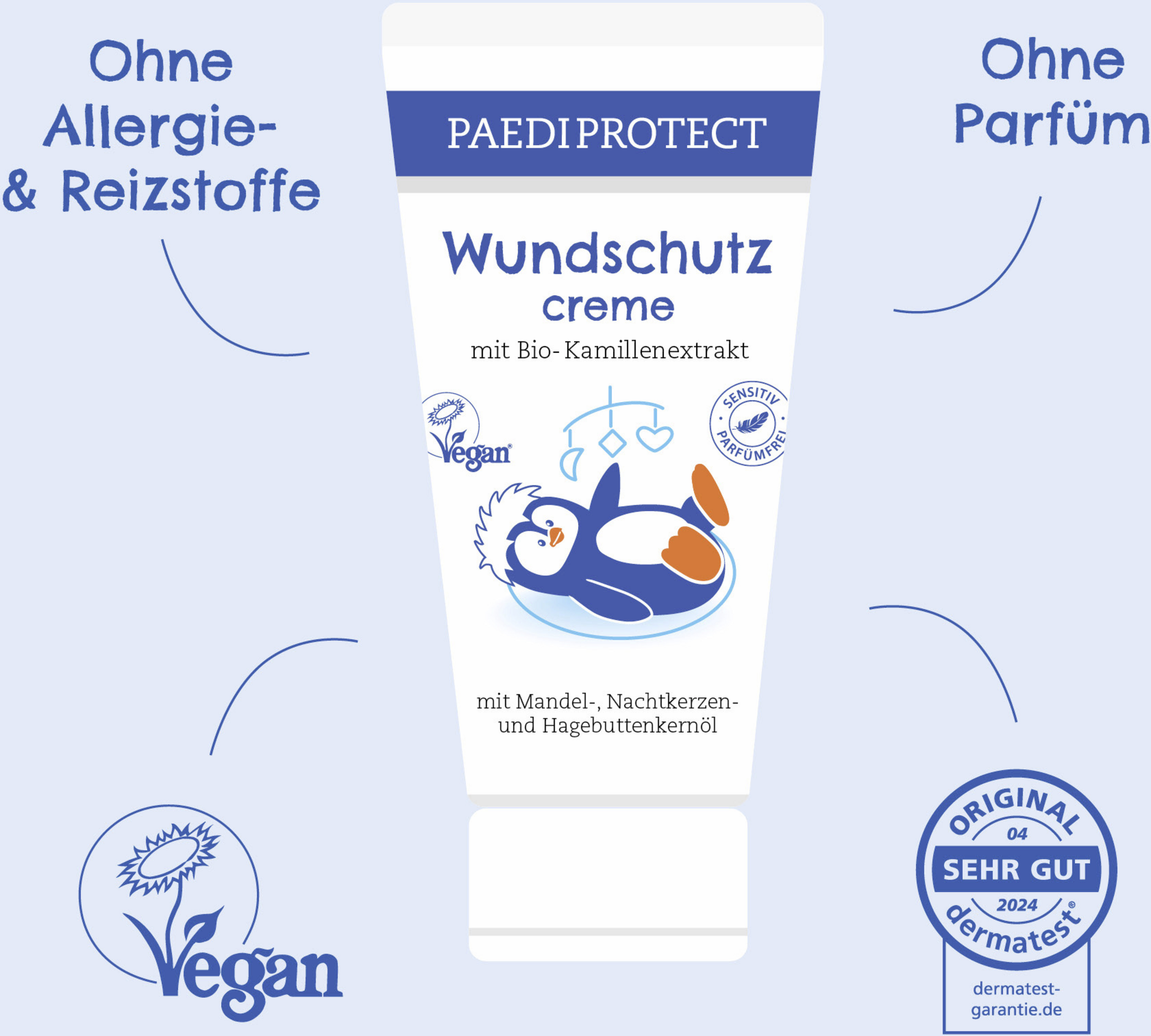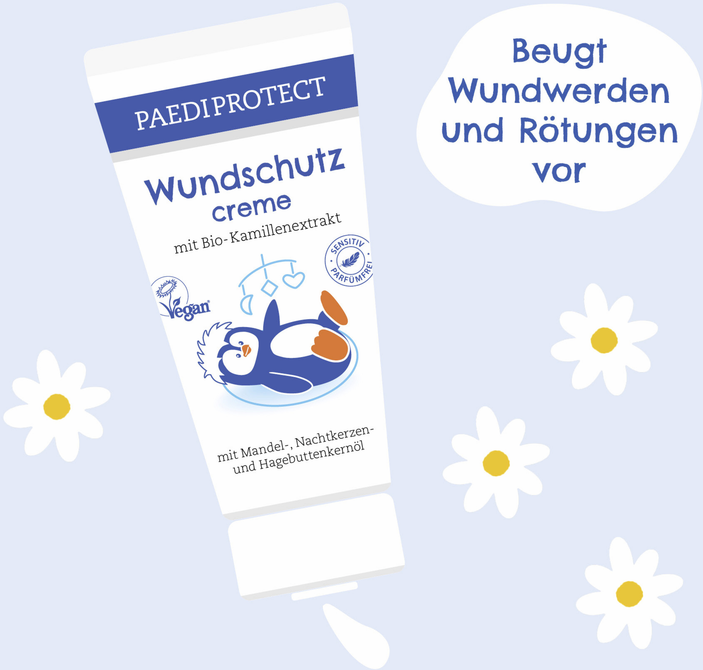 PAEDIPROTECT sårbeskyttelsescreme beskytter irriteret og følsom hud og forebygger også sår og bleudslæt. Den særligt milde formel sikrer maksimal kompatibilitet og plejer forsigtigt din babys/barns sarte hud. Vores gennemtestede formulering af mandel-, hyben- og kæmpenatlysolie i kombination med økologisk kamilleekstrakt virker beroligende på irritation og rødme. Naturligt fri for alkohol, parabener, silikoner, mineralske olier, farvestoffer og konserveringsmidler. Vegansk-certificeret Uden mikroplast!