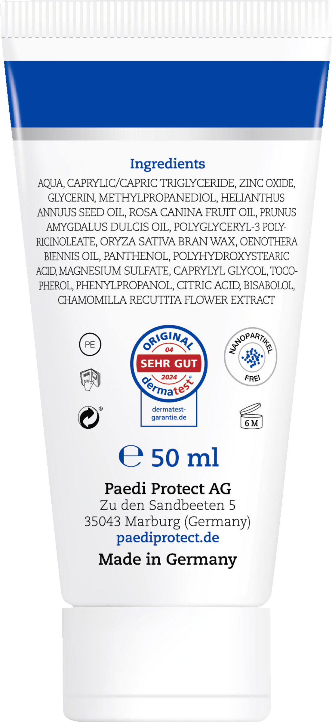 AQUA, CAPRYLIC/CAPRIC TRIGLYCERIDE, ZINC OXIDE, GLYCERIN, METHYLPROPANEDIOL, HELl-ANTHUS ANNUUS (SUNFLOWER) SEED OIL, OENOTHERA BIENNIS (EVENING PRIMROSE) OIL, ROSA CANINA FRUIT OIL, POLYGLYCERYL-3 POLYRICINOLEATE, PRUNUS AMYGDALUS DULCIS (SWEET ALMOND) OIL, ORYZA SATIVA (RICE) BRAN WAX, PANTHENOL, POLYHYDROXYSTEARIC ACID, CHAMOMILLA RECUTITA (MATRICARIA) FLO WER EXTRACT, TOCOPHEROL, BISABOLOL, MAGNESIUM SULFATE, CAPRYLYL GLYCOL, CITRIC ACID, PHENYLPROPANOL