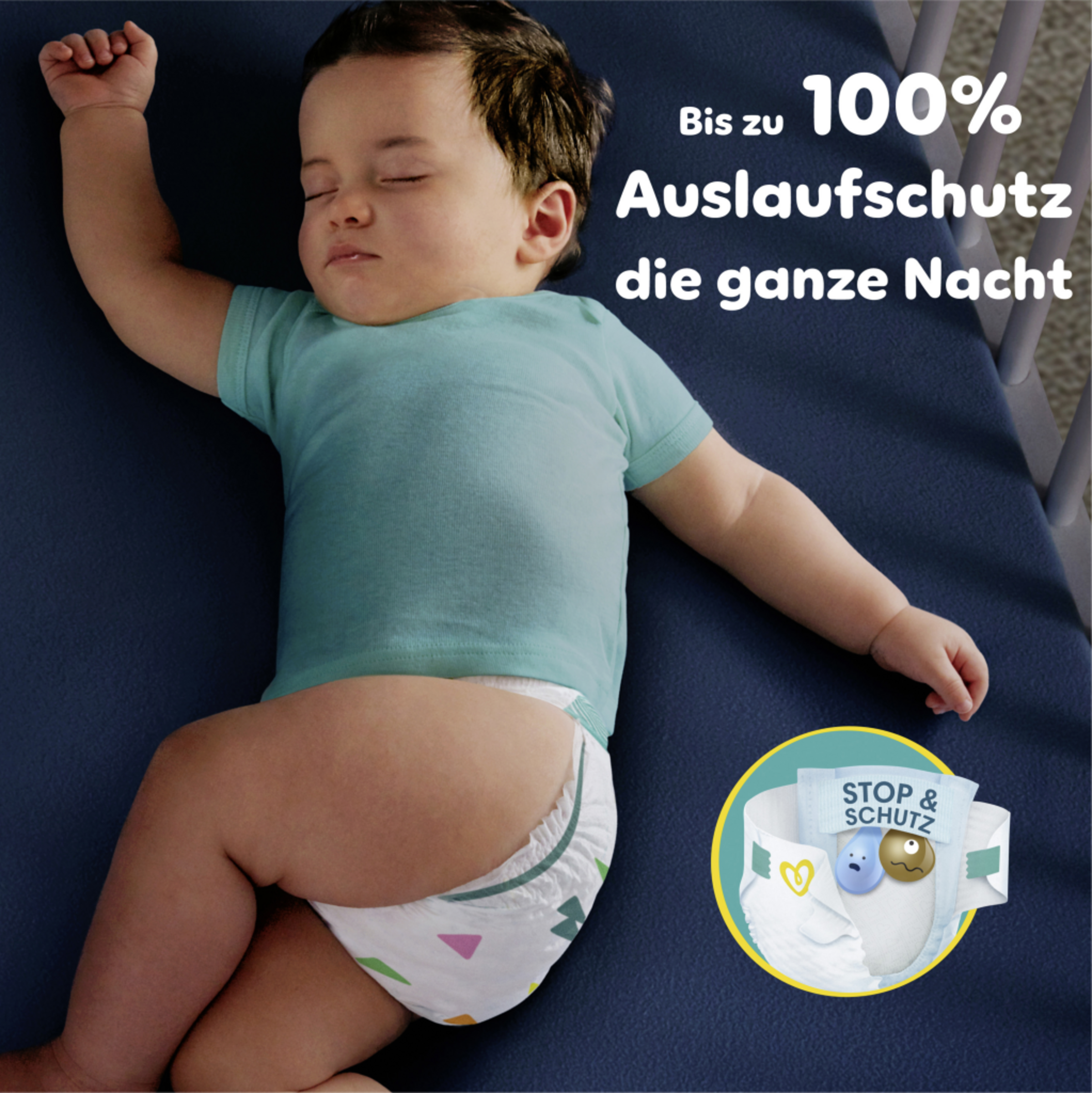 Din baby bevæger sig konstant under søvnen. Derfor tilbyder Pampers Baby-Dry med Stop ; Protect-poser på bagsiden op til 100 % lækagebeskyttelse hele natten. Ligesom FÜR er din babys sikkerhed den højeste prioritet for Pampers. Pampers Baby-Dry bleer er dermatologisk testet og indeholder 0 % EU-parfumeallergener (i overensstemmelse med EU's kosmetikforordning nr. 1223/2009). Til hende er testet og certificeret i henhold til Oeko-TexStandard 100.