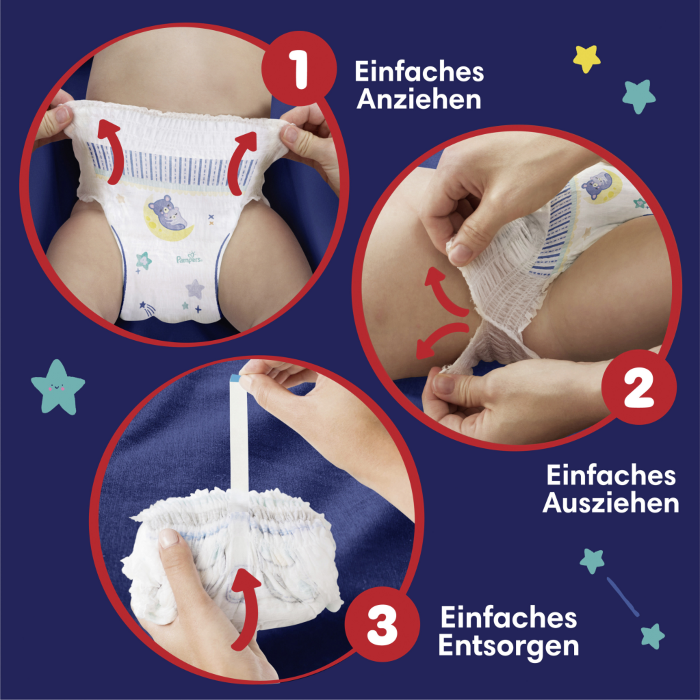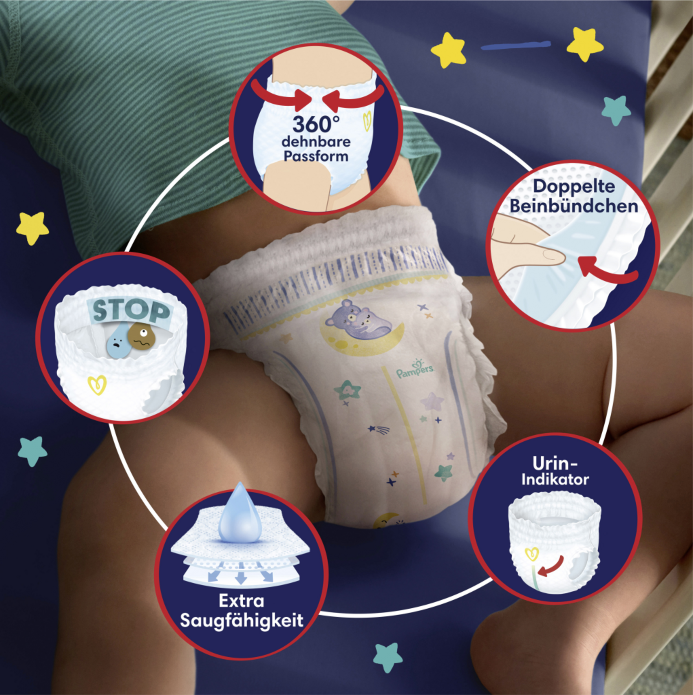 Pampers Baby-Dry Night Pants er dermatologisk testet, indeholder 0 % EU-parfumeallergener (i henhold til EU-kosmetikforordning (EF) 1223/2009) og er testet og certificeret i henhold til OEKO-TEX Standard 100.