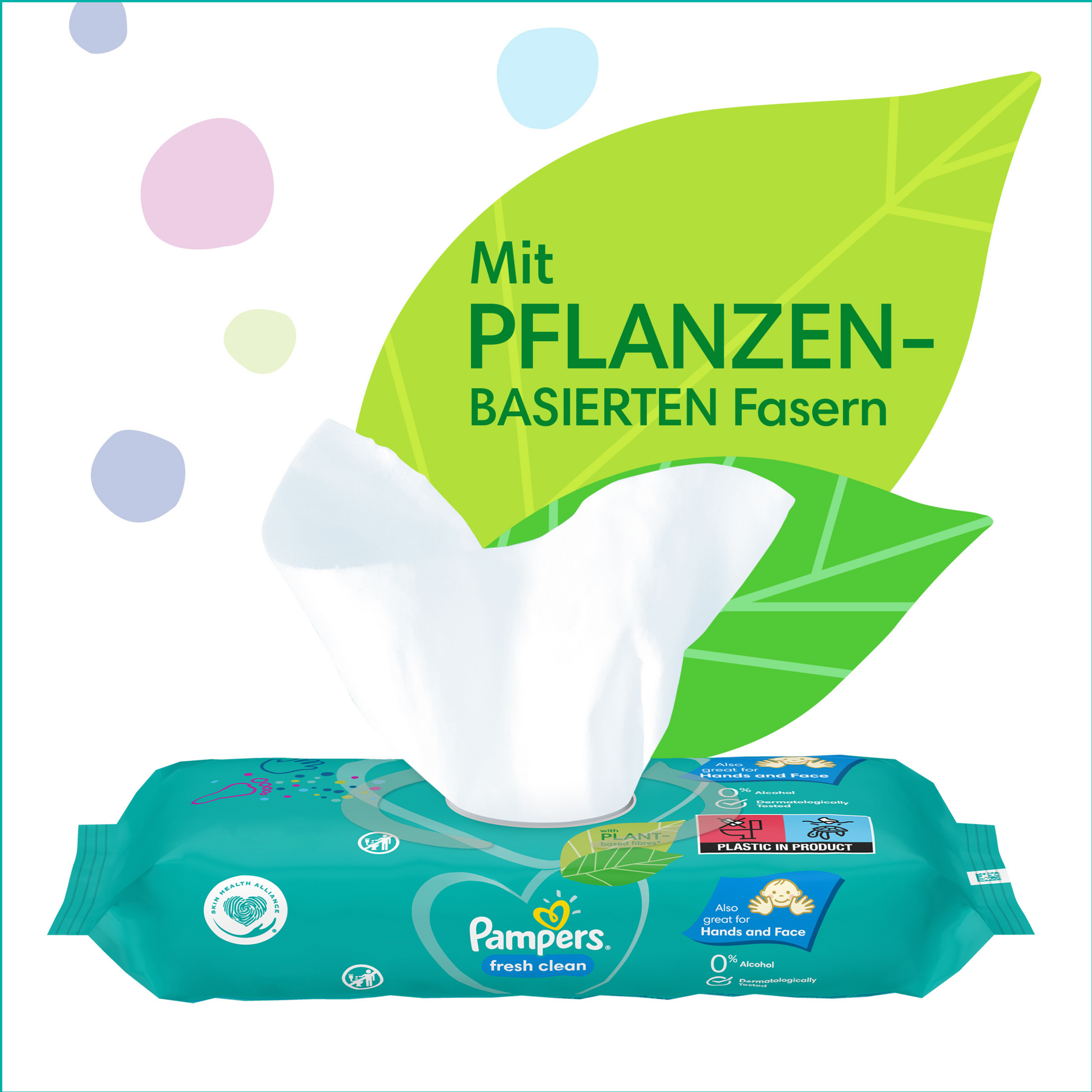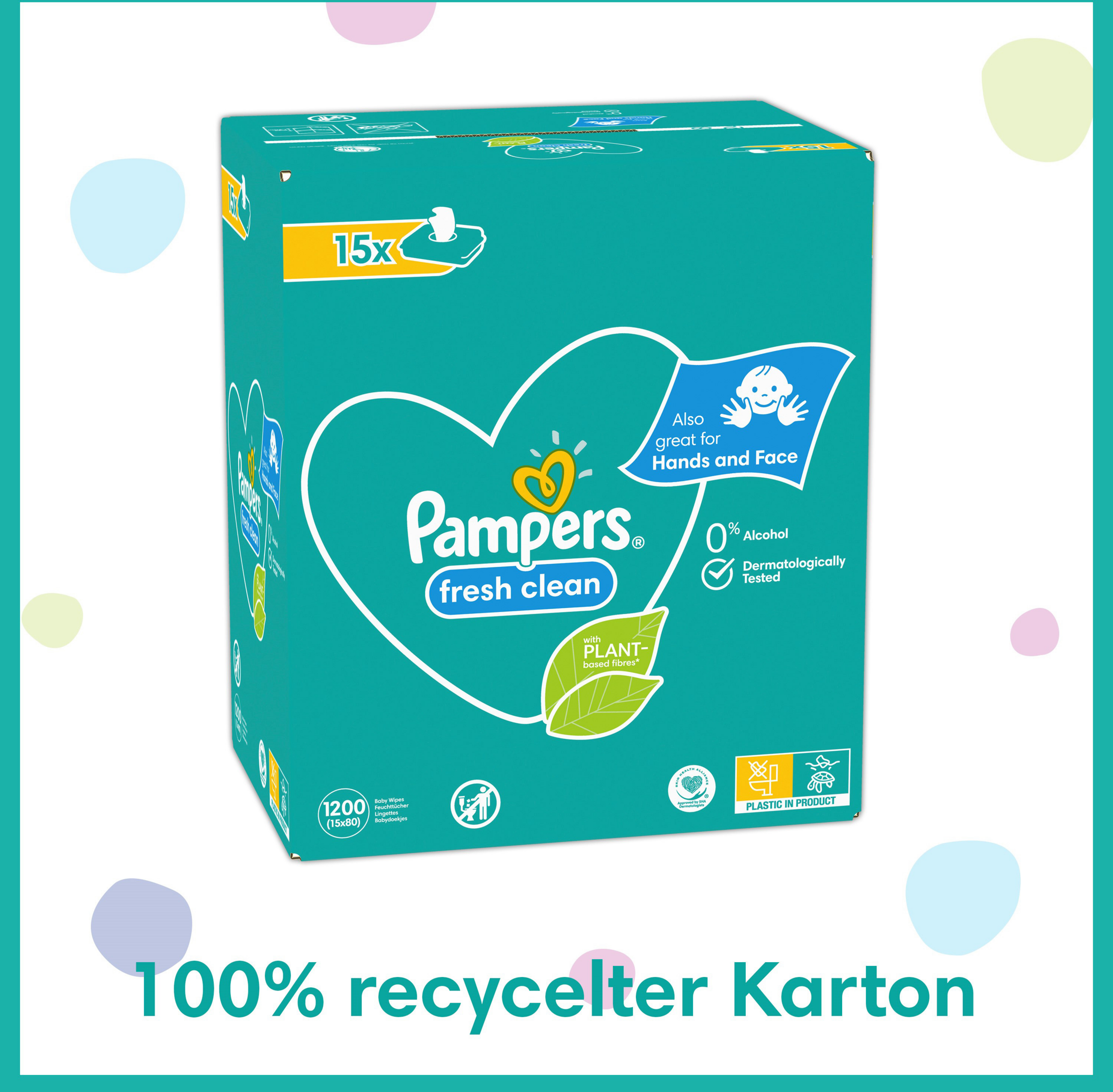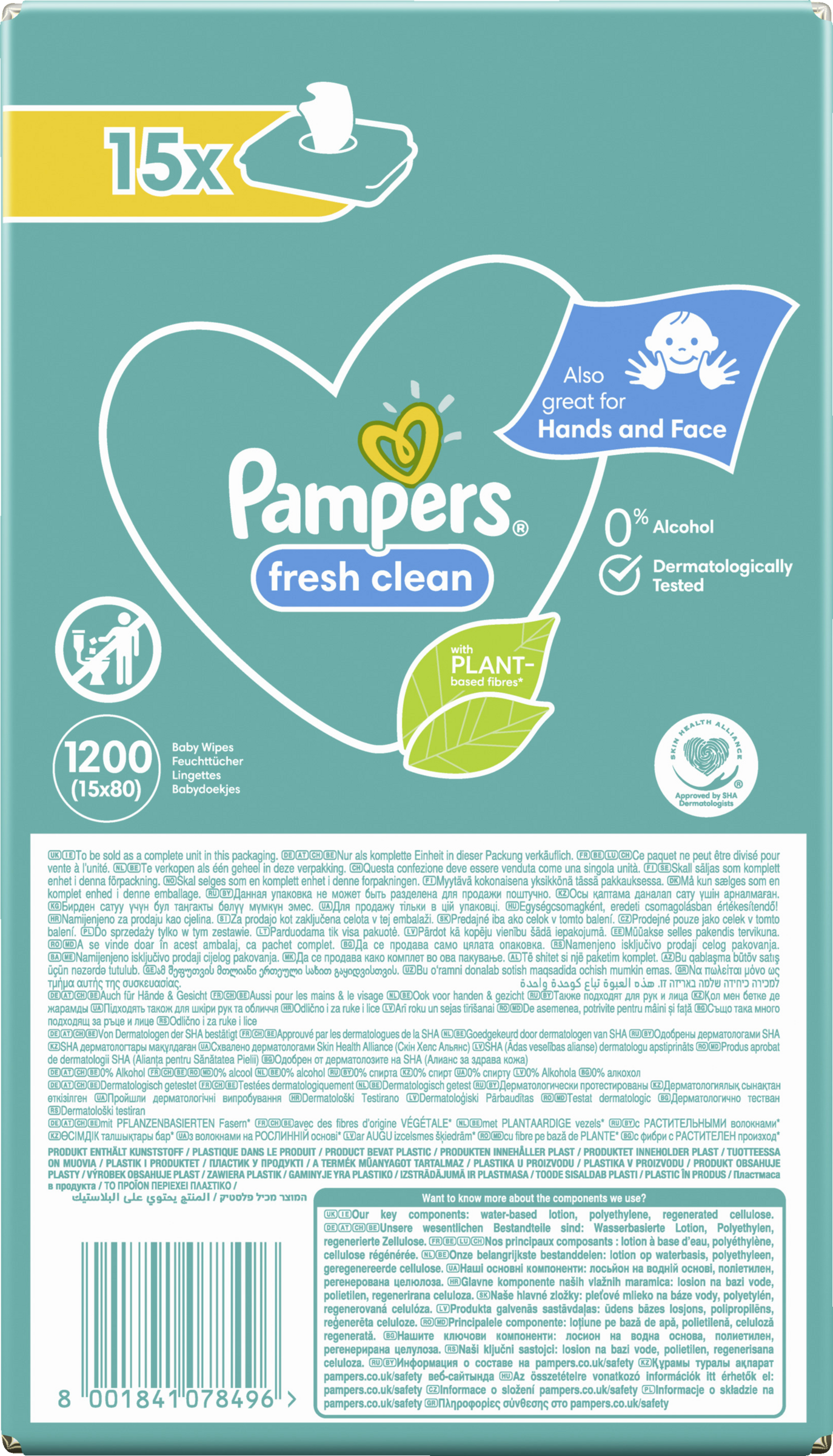 Pampers Fresh Clean vådservietter giver en endnu grundigere rengøring (sammenlignet med det tidligere produkt) takket være den blødere og stærkere klud, men stadig med den forfriskende duft, som du og din baby elsker så højt. Enzymerne i urin og afføring ændrer pH-værdien i babyhudens sarte hud og øger risikoen for irritation og bleudslæt. Alle Pampers vådservietter indeholder en unik formel, der beskytter babyhudens naturlige pH-værdi bedre end bomuld og vand. Pampers Fresh Clean vådservietter er dermatologisk testet og godkendt af dermatologer fra Skin Health Alliance. Da Pampers Fresh Clean vådservietter er udviklet til følsom babyhud, indeholder de ikke alkohol eller farvestoffer.