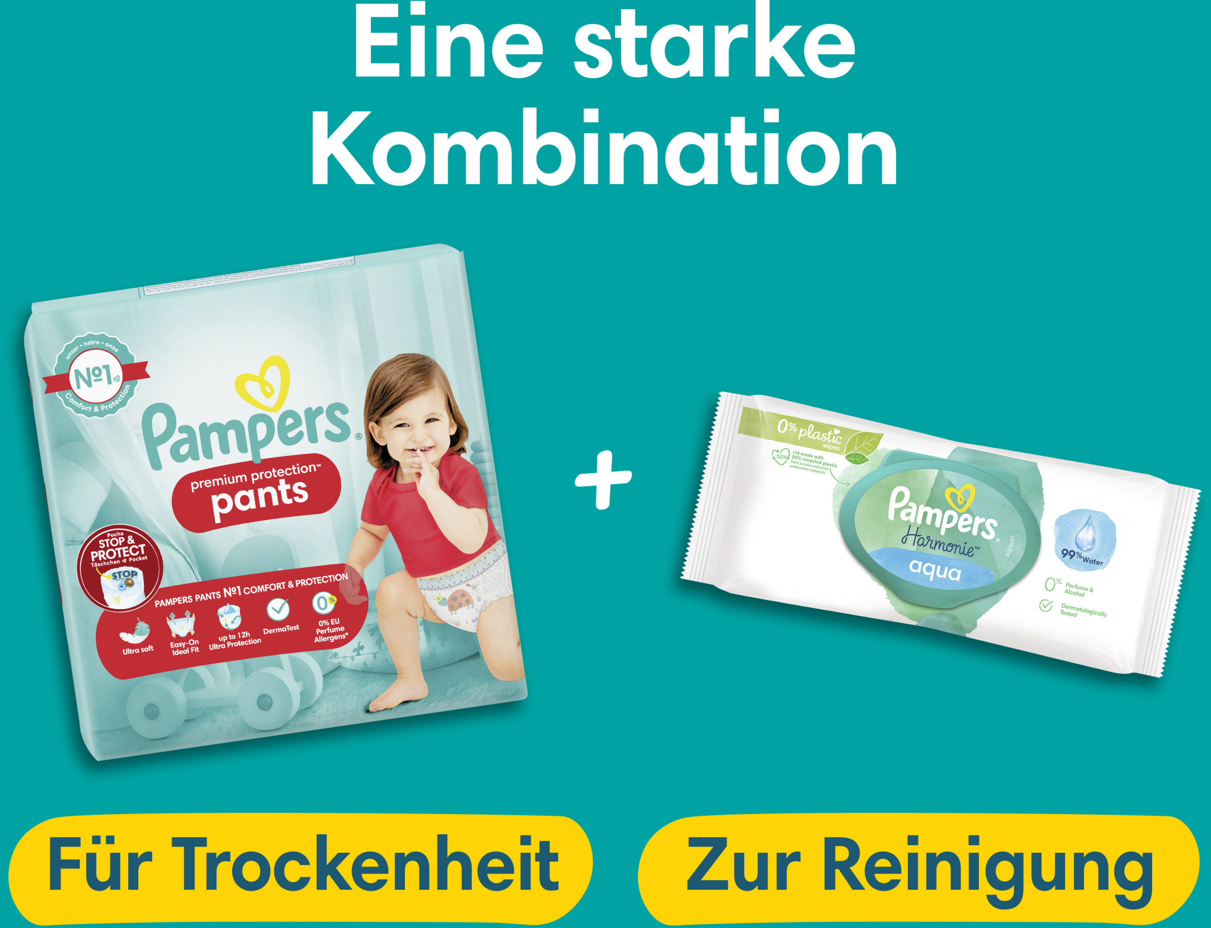 Komfort og beskyttelse fra Pampers med Pampers Premium Protection Pants. Med en revolutionerende Stop ; Protect-lomme, der hjælper med at forhindre lækage på bagsiden - for op til 12 timers allround-lækagebeskyttelse. Når din baby bliver mere aktiv og vender sig under bleskift, har du brug for en ble, der sidder behageligt, giver pålidelig beskyttelse og følger hver eneste bevægelse. Derfor tilbyder Pampers Premium Protection Pants vores blødeste komfort og beskyttelse med en 360° fit takket være ultrabløde og strækbare materialer, der tilpasser sig din aktive babys bevægelser. Som alle Pampers-bukser er Pampers Premium Protection Pants nemme at skifte: De kan tages på med Nur Die, tages af ved forsigtigt at rive siderne op, rulles sammen og lukkes med klæbestrimlen, så de nemt kan bortskaffes - også selvom babyen bevæger sig frem og tilbage. Ligesom FÜR er din babys sikkerhed den højeste prioritet for Pampers: Pampers Premium Protection Pants er dermatologisk testet og indeholder 0 % EU-parfumeallergener (i overensstemmelse med EU's kosmetikforordning nr. 1223/2009). Til hende er dermatologer fra Skin Health Alliance, og de er testet og certificeret i henhold til Oekotex Standard 100.