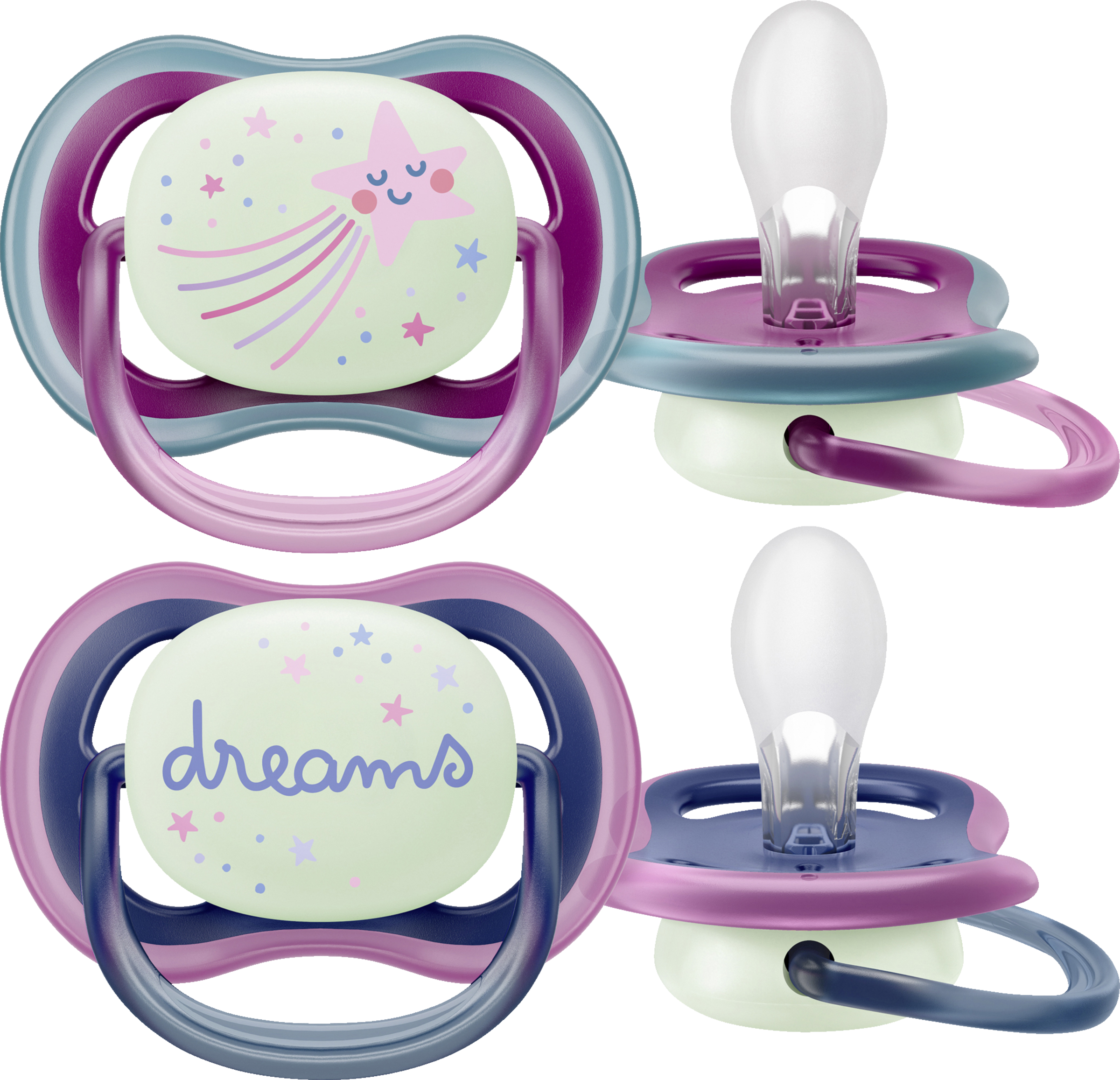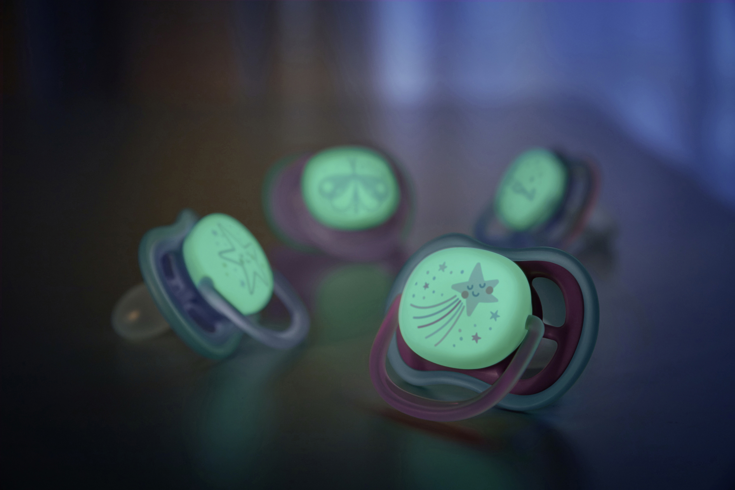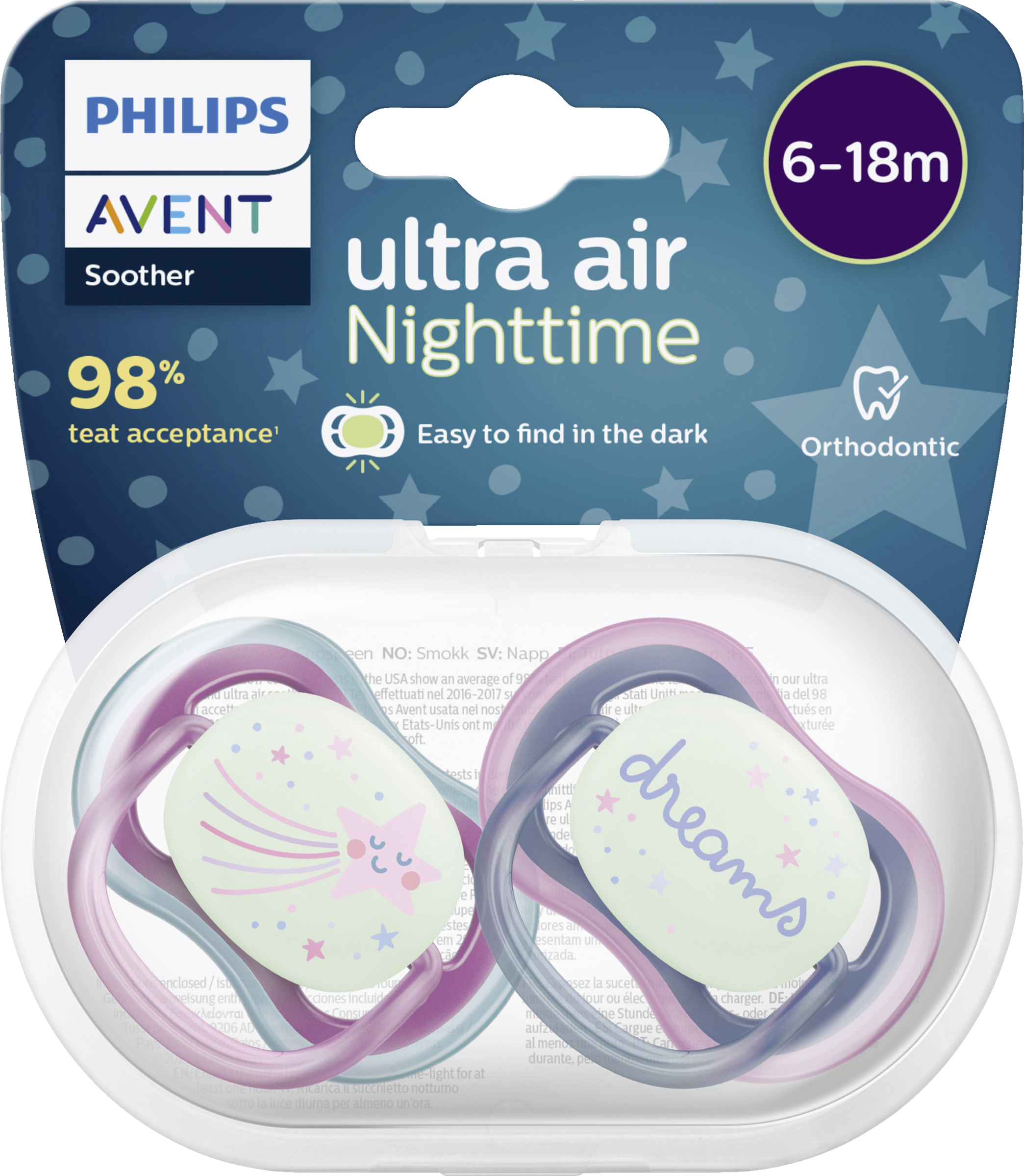 Oplev Philips Avent Ultra Air sutten SCF376/14 - det perfekte valg for din babys komfort og velvære. Denne specialudviklede sut kombinerer innovative funktioner med et gennemtænkt design, der giver mange fordele for både forældre og babyer. En enestående egenskab ved Philips Avent Ultra Air sutten er de ekstra store lufthuller. Disse lufthuller er designet, så din babys hud er optimalt ventileret, mens den sutter. Dette forhindrer fugtopbygning og hjælper med at holde huden tør og behagelig. Dette gør det muligt for babyens hud at ånde, hvilket er særligt vigtigt for at undgå hudirritation og andre gener. En anden fordel ved Philips Avent Ultra Air sutten SCF376/14 er dens ortodontiske form. Patten er symmetrisk designet og tilpasser sig den naturlige form af din babys gane, tænder og tandkød. Dette understøtter en sund tandudvikling og sikrer, at sutten sidder behageligt og sikkert i din babys mund. Philips Avent Ultra Air sutten SCF376/14 er ikke kun funktionel, men også udstyret med en praktisk lysknap. Lysene sikrer, at du nemt kan finde din babys sut selv i mørket uden at skulle tænde lyset. Dette er især nyttigt i nattehvileperioder, når du vil finde sutten hurtigt og nemt. Den strukturerede silikonesutter på Philips Avent Ultra Air er modelleret efter kvindebrysten og giver din baby en velkendt og behagelig suttefølelse. Denne brystreplika hjælper med at give en blid og beroligende sugende fornemmelse, der giver din baby sikkerhed.