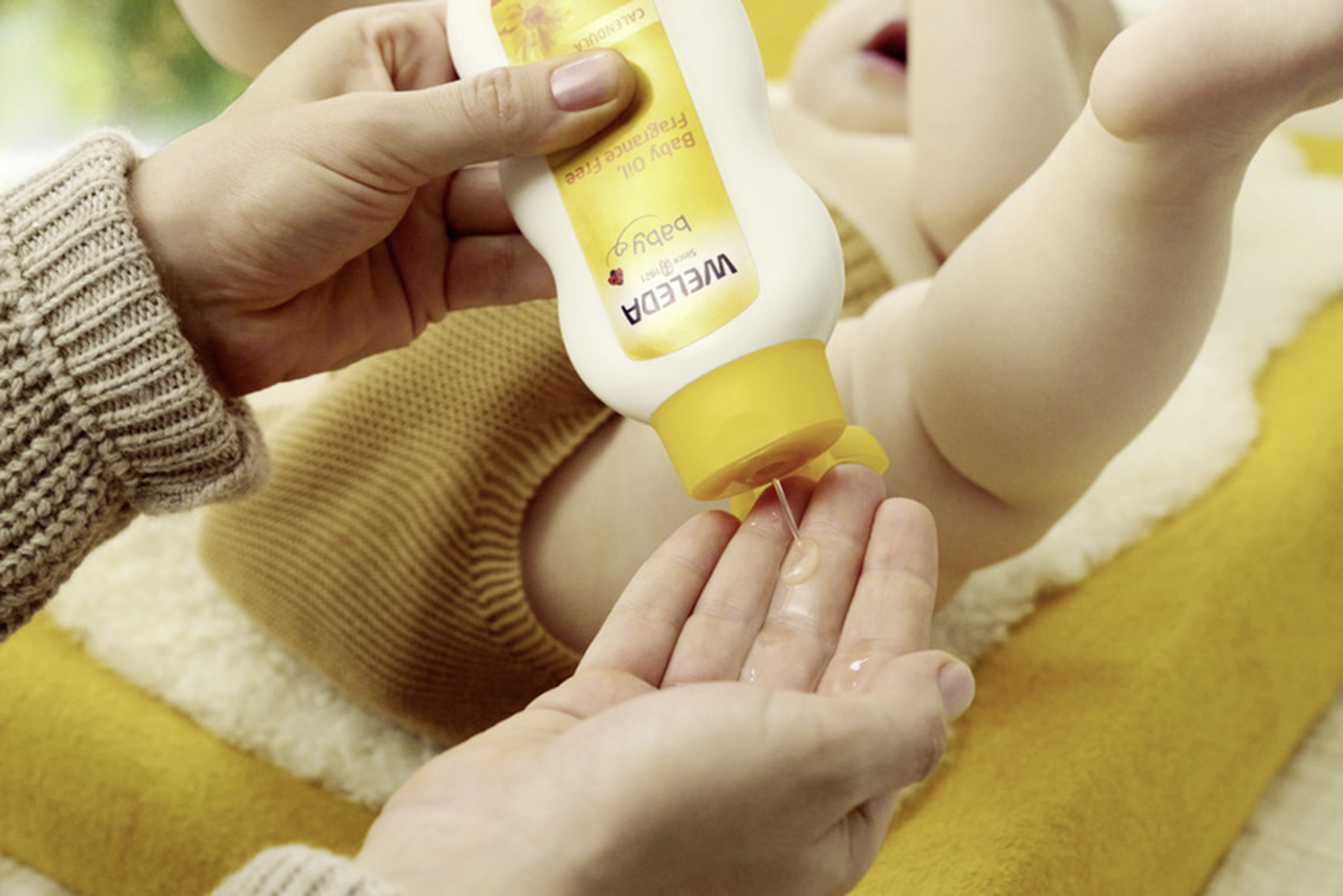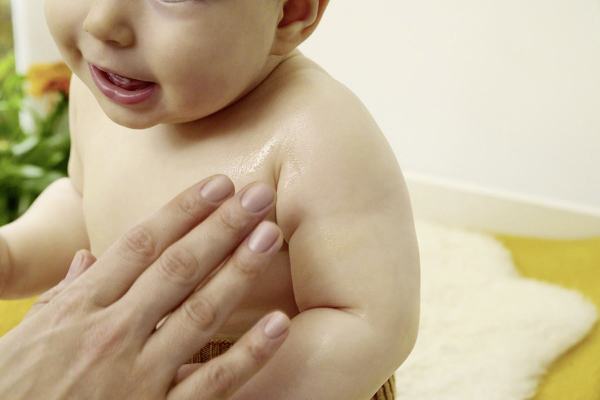 Efter bad eller vask kommes en lille mængde olie mellem håndfladerne og påføres forsigtigt barnets tørrede hud. Efter vask af bleområdet kan du komme lidt plejende olie på en vatrondel.