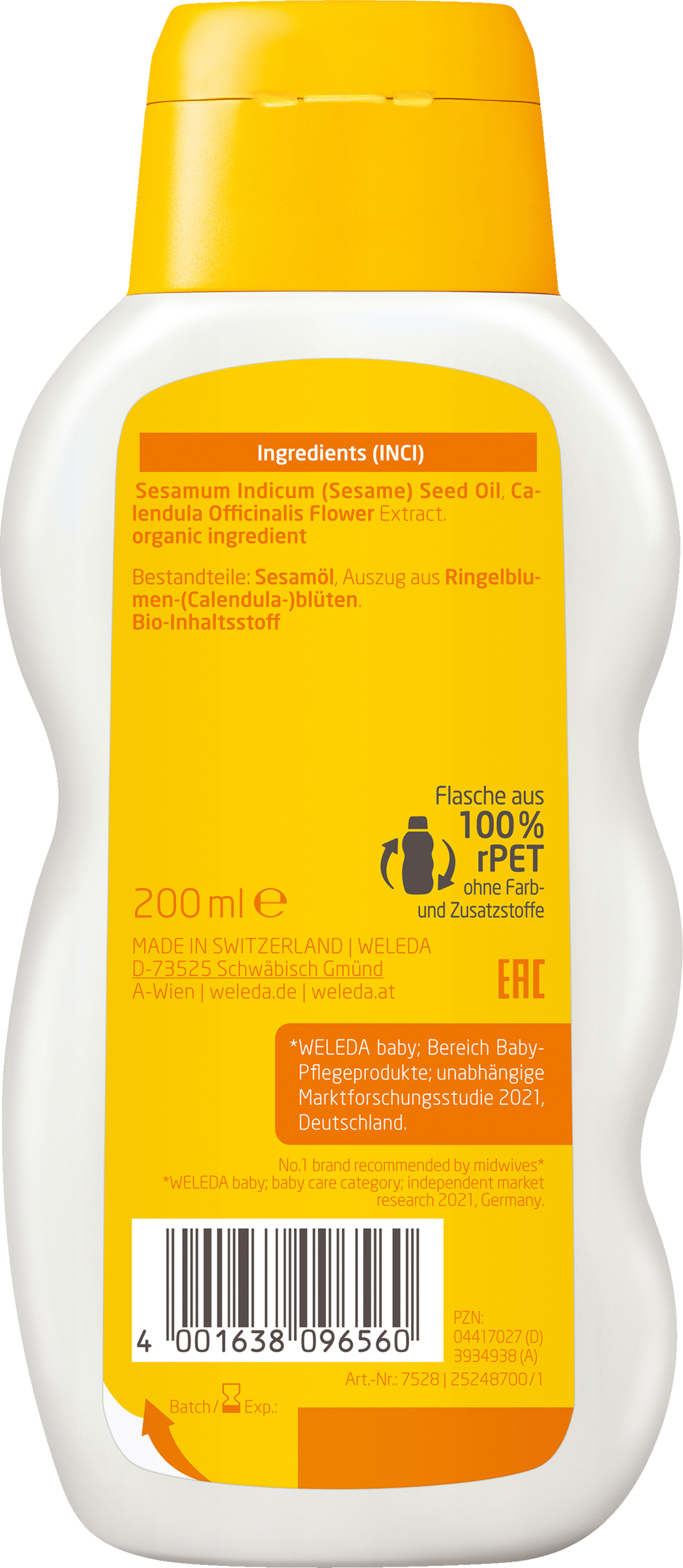 Den uparfumerede Weleda Calendula plejende olie er ideel til daglig hudpleje og mild vask i bleområdet. Den hjælper med at forebygge hudirritation og ømhed med ekstrakt af kontrolleret økologisk dyrket calendula. På grund af den indeholdte sesamolie fra kontrolleret økologisk dyrkning har Calendula plejende olie en beroligende varmende effekt og er derfor også meget velegnet til blid babymassage. For at gøre dette skal du blot sprede en lille mængde olie på dine håndflader og massere den ind i huden med cirkulære bevægelser.