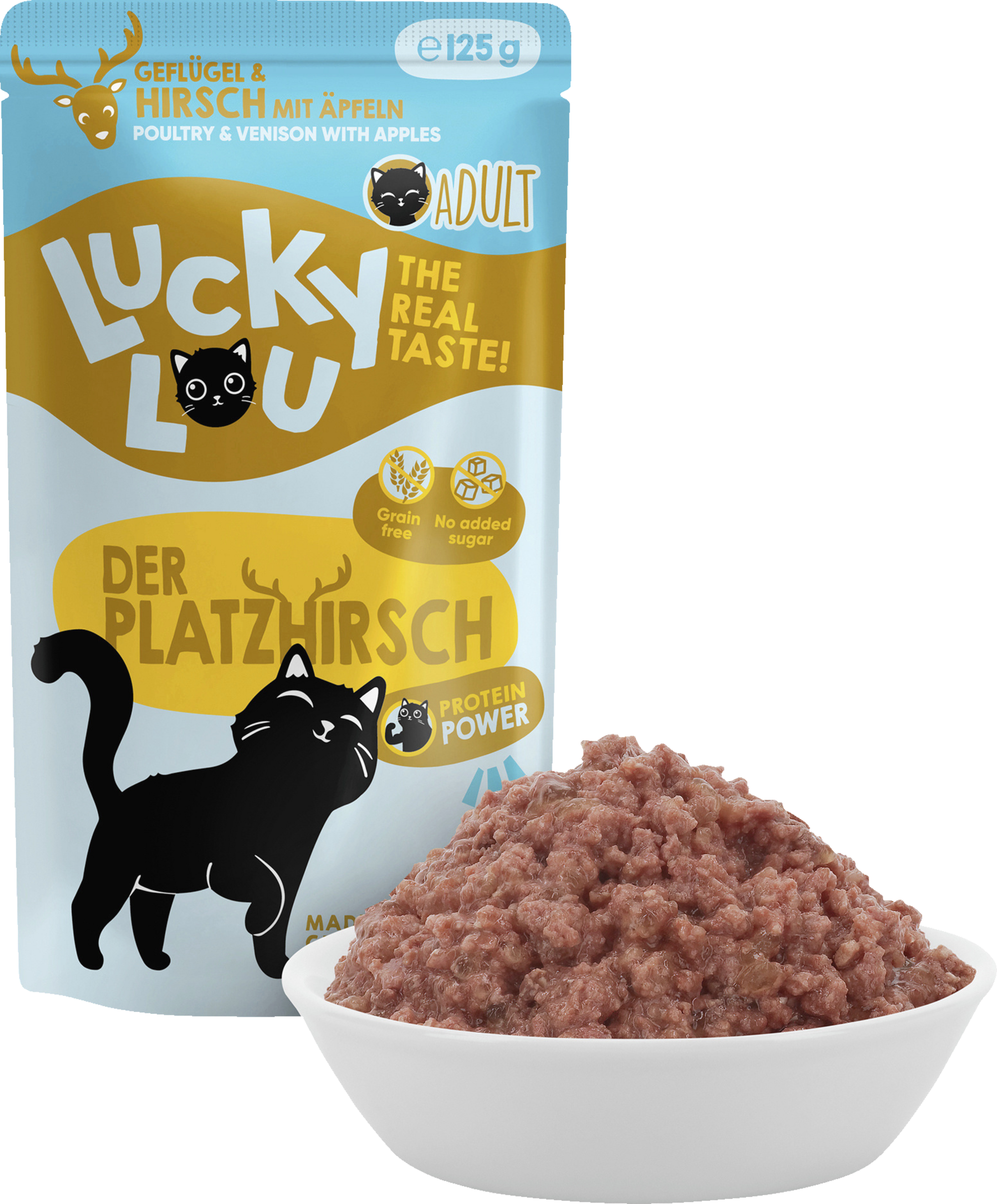 Lucky Lou kattefoder består af mere end 94 % kød eller fisk, indmad og madlavningsbouillon og omkring 2 % vegetabilske kulhydrater, 1 % mineraler og en lille del af højkvalitetsolie. Og fordi dette er smart gjort, indeholder maden ingen korn, ingen Gluten og intet tilsat sukker. Rigtig smag!