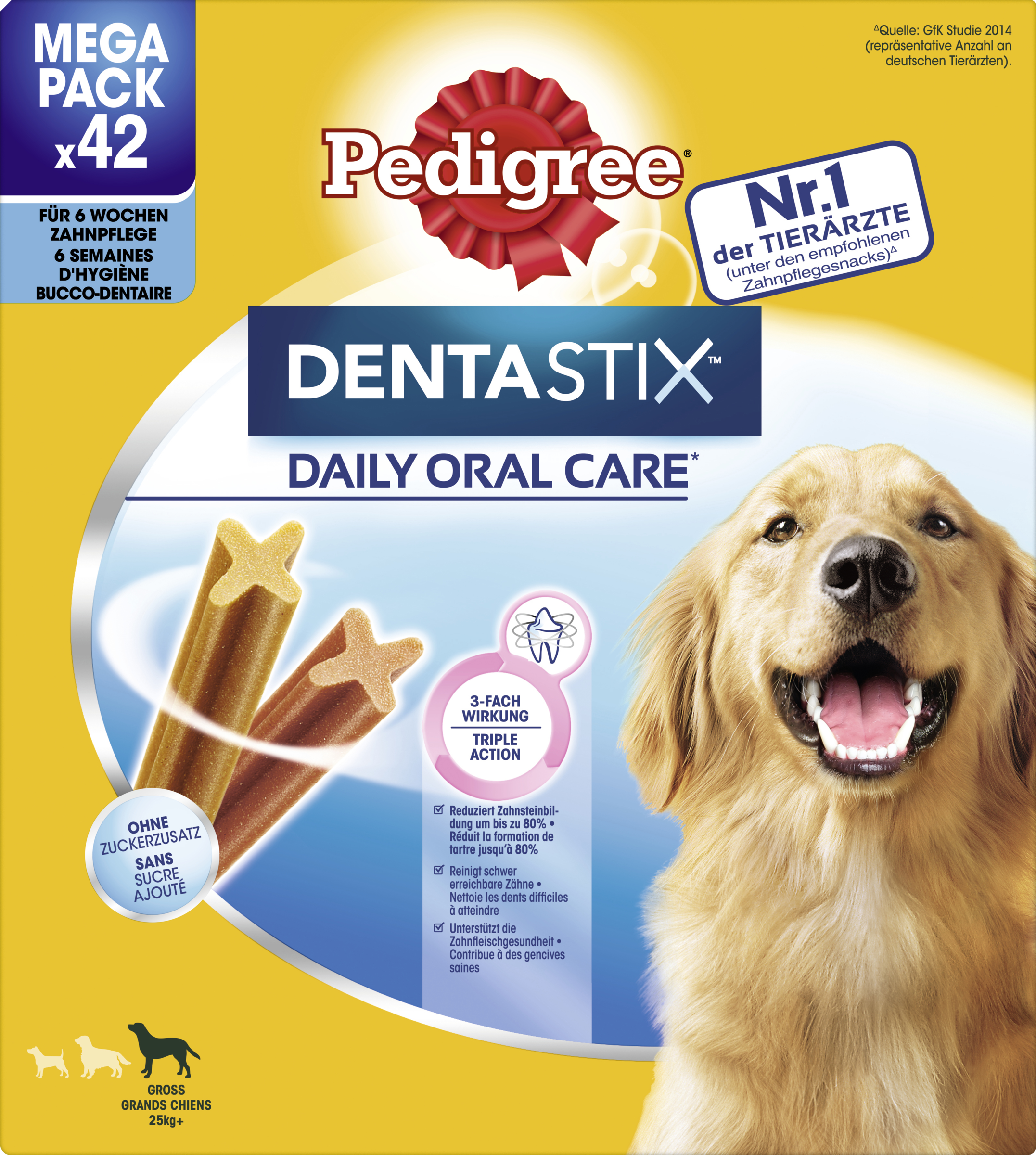 PEDIGREE® DENTASTIX™ er velegnede for store hunde fra 25 kg og opefter. De specielle tyggeben er unikke X-formede tandplejeprodukter, der videnskabeligt beviseligt hjælper til at reducere dannelsen af tandsten med op til 80% ved daglig fodring.