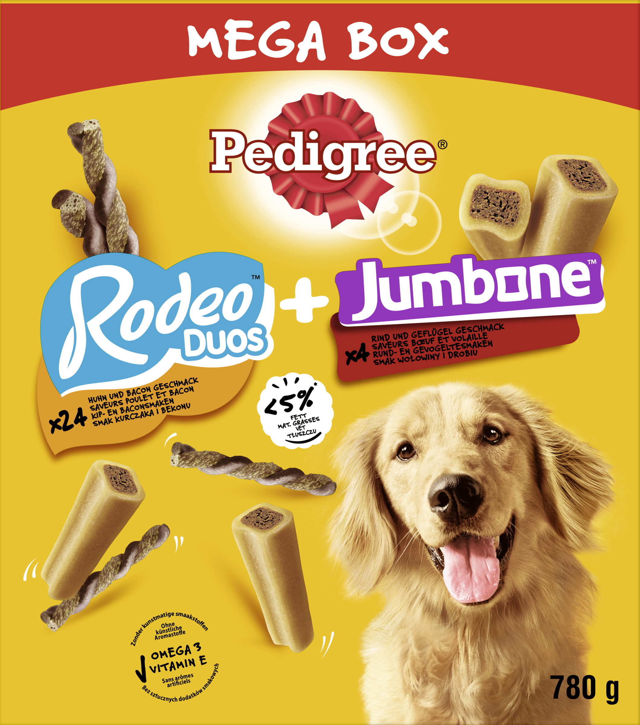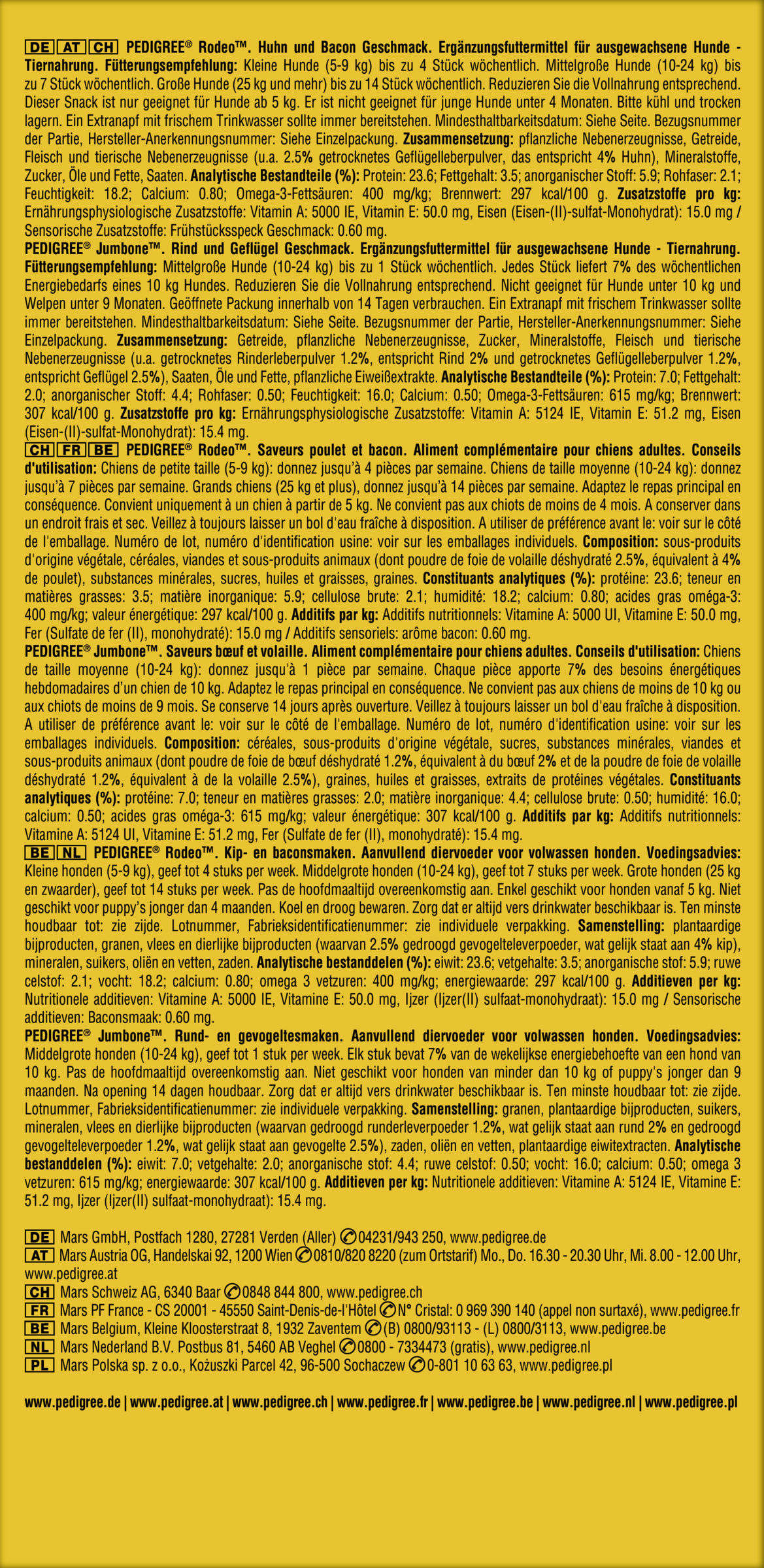 PEDIGREE Rodeo Kylling og bacon smag (%): Protein: 23,6; Fedtindhold: 3,5; uorganisk stof: 5,9; RÄ fiber: 2,1; Fugtighed: 18,2; Calcium: 0,80; Omega-3 fedtsyrer: 400 mg/kg; Brændværdi: 297 kcal/100g. PEDIGREE Jumbone Oksekød og fjerkræ smag (%): Protein: 7,0; Fedtindhold: 2,0; uorganisk stof: 4,4; RÄ fiber: 0,50; Fugtighed: 16,0; Calcium: 0,50; Omega-3 fedtsyrer: 615 mg/kg; Brændværdi: 307 kcal/100g.