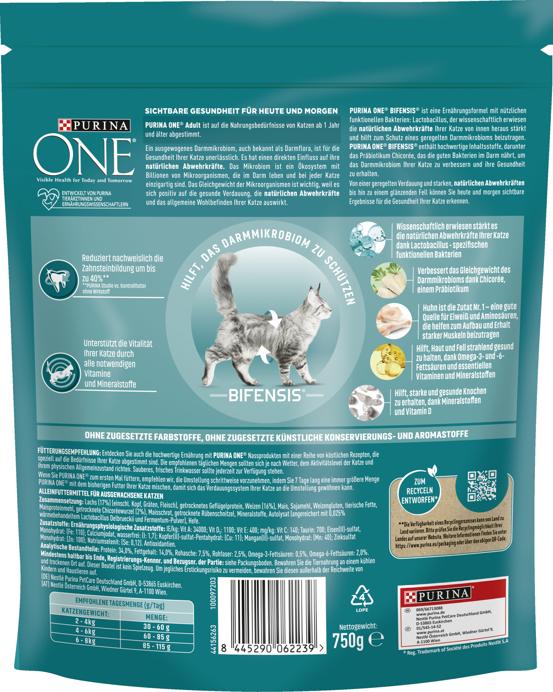 PURINA ONE BIFENSIS er en ernæringsformel med gavnlige funktionelle bakterier: Lactobacillus, som er videnskabeligt bevist at styrker din kats naturlige forsvar indefra og ud og hjælper med at beskytte et reguleret tarmmikrobiom. PURINA ONE BIFENSIS indeholder Ingredienser af høj kvalitet, herunder den præbiotiske cikorie, som nærer de gode bakterier i tarmene for at forbedre din kats tarmmikrobiom og bevare deres Sundhed . Fra reguleret fordøjelse og stærkt, naturligt forsvar til en skinnende pels, kan du se synlige resultater i din kats Sundhed i dag og i morgen.