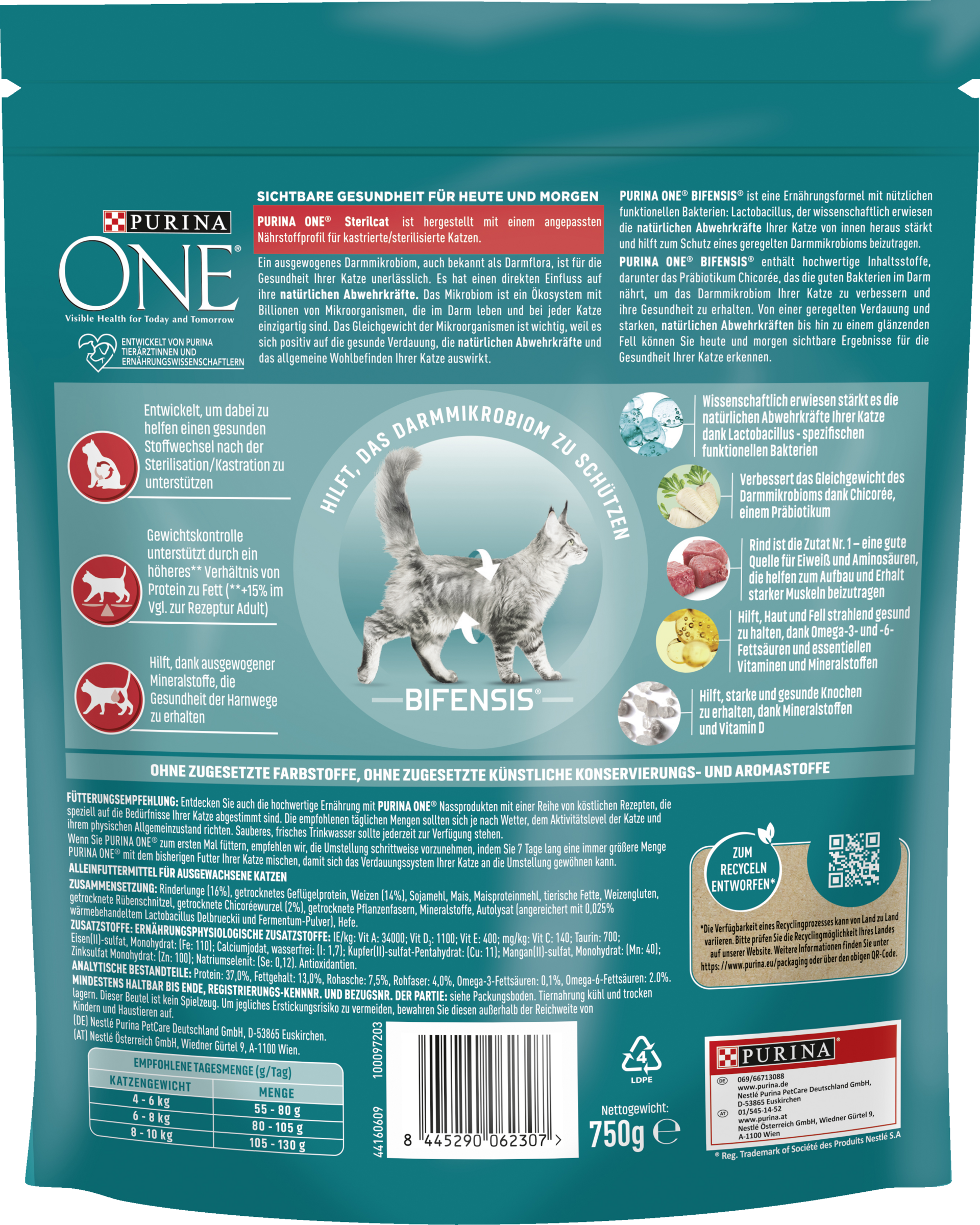 PURINA ONE BIFENSIS er en ernæringsformel med gavnlige funktionelle bakterier: Lactobacillus, som er videnskabeligt bevist at styrker din kats naturlige forsvar indefra og ud og hjælper med at beskytte et reguleret tarmmikrobiom. PURINA ONE BIFENSIS indeholder Ingredienser af høj kvalitet, herunder den præbiotiske cikorie, som nærer de gode bakterier i tarmene for at forbedre din kats tarmmikrobiom og bevare deres Sundhed . Fra reguleret fordøjelse og stærkt, naturligt forsvar til en skinnende pels, kan du se synlige resultater i din kats Sundhed i dag og i morgen.