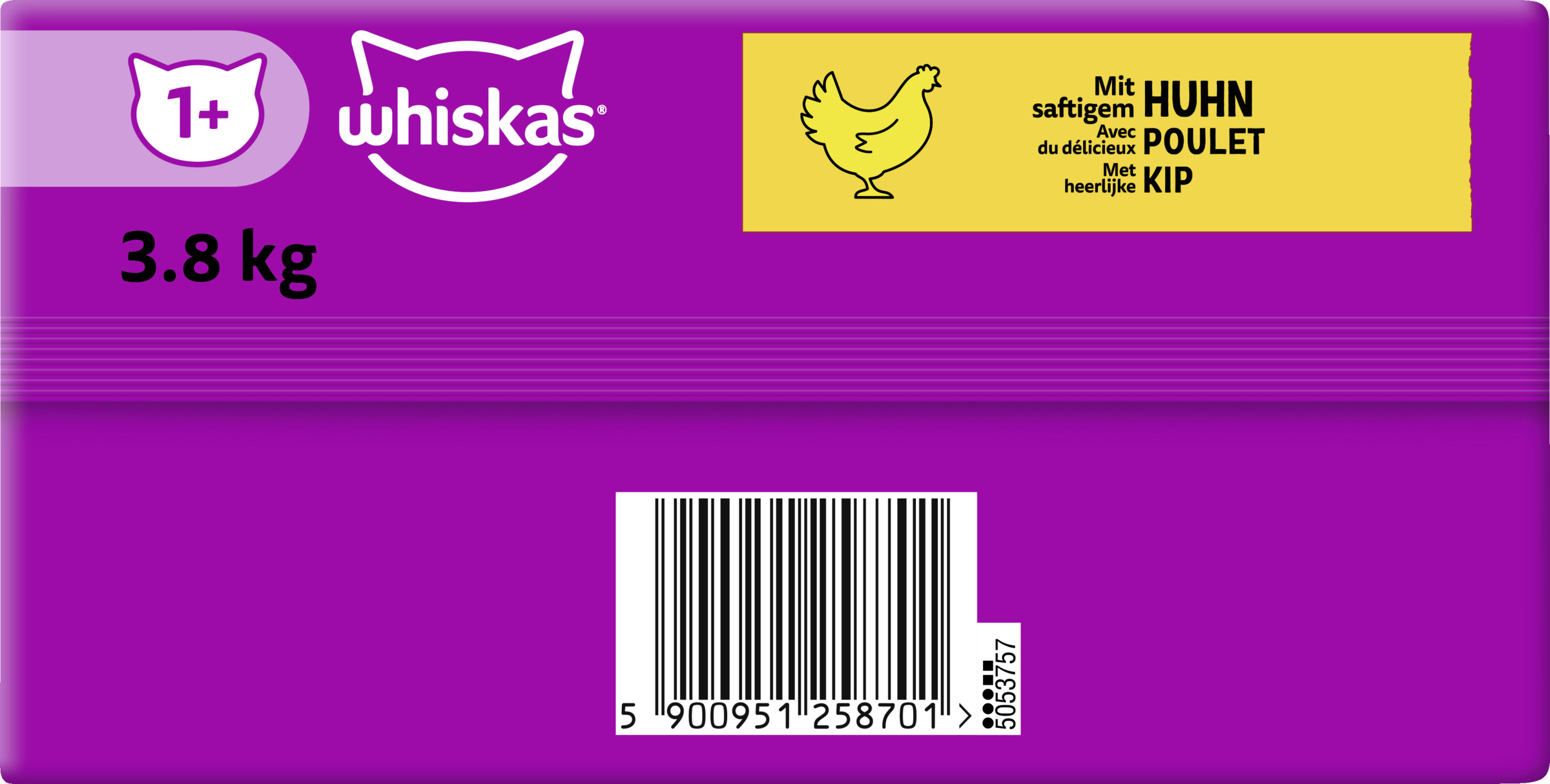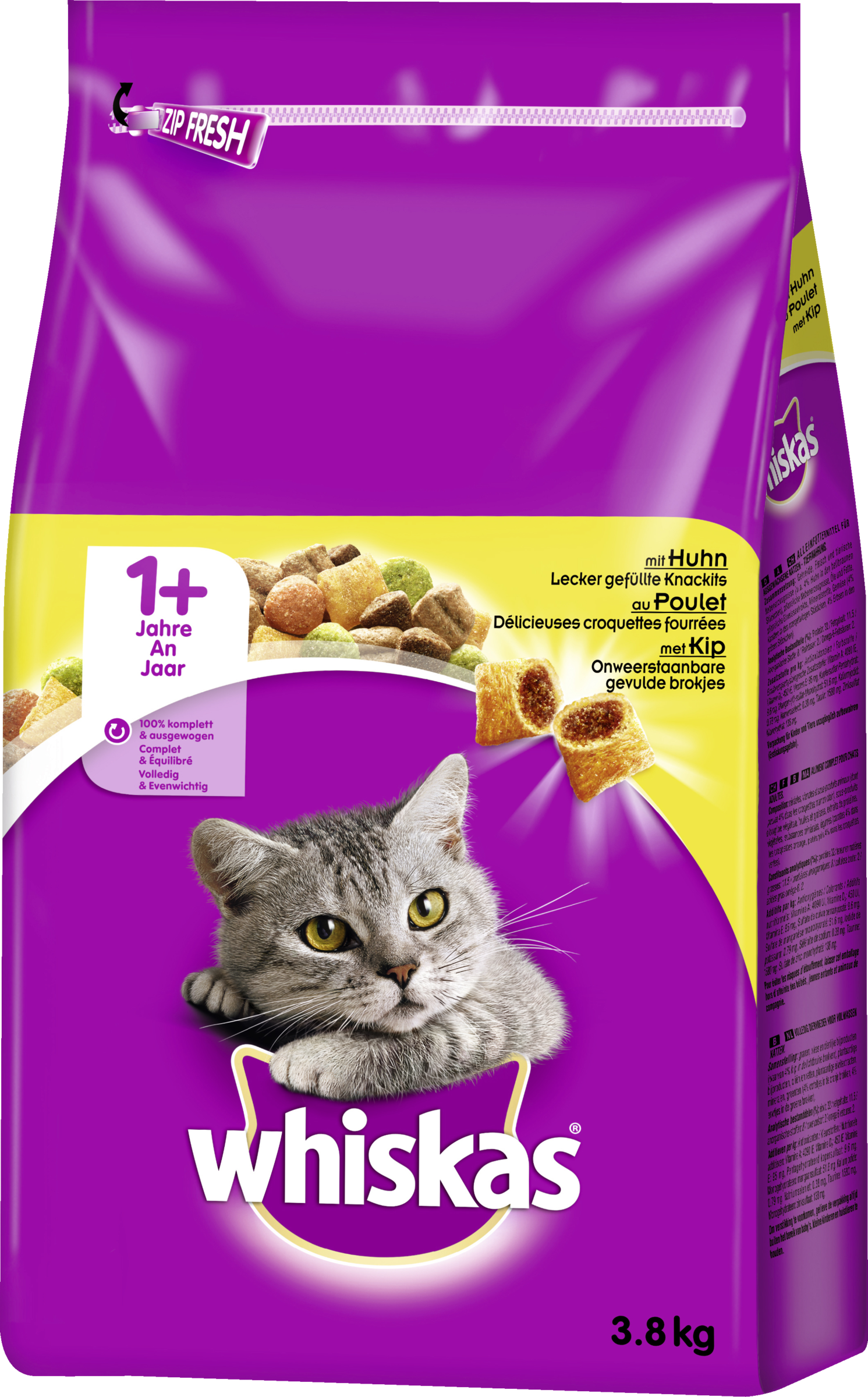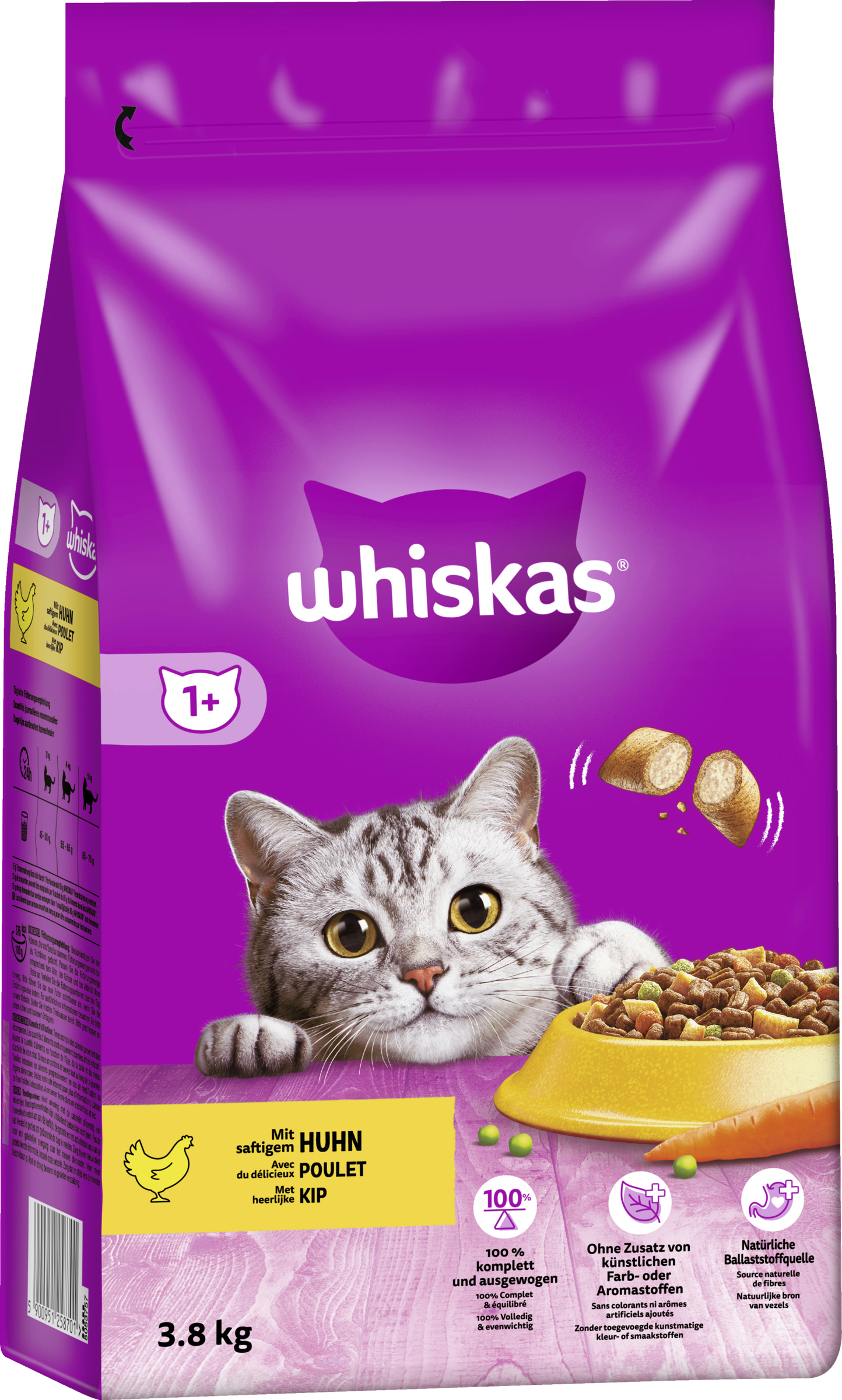 Whiskas® forstår, hvad din kat naturligt har brug for og elsker. Derfor er Whiskas® 1+ 100 % komplet og afbalanceret, med et optimalt forhold mellem vitaminer og Mineraler, så du kan give din kat den bedst mulige pleje.