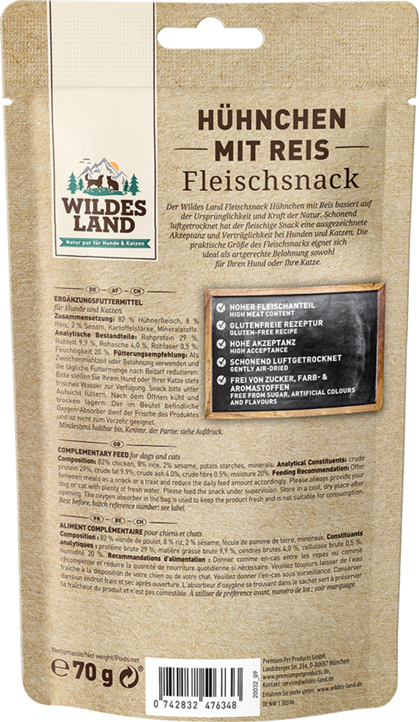 Wildes Lands kødsnack kylling med ris er baseret på naturens originalitet og kraft. Den kødfulde snack er lufttørret og accepteres og tolereres meget godt af hunde og katte. Den praktiske størrelse på kødsnacken er ideel som en artstilpasset belønning til din hund eller kat og giver dig mulighed for yderligere at styrke det tætte forhold mellem mennesker og dyr.